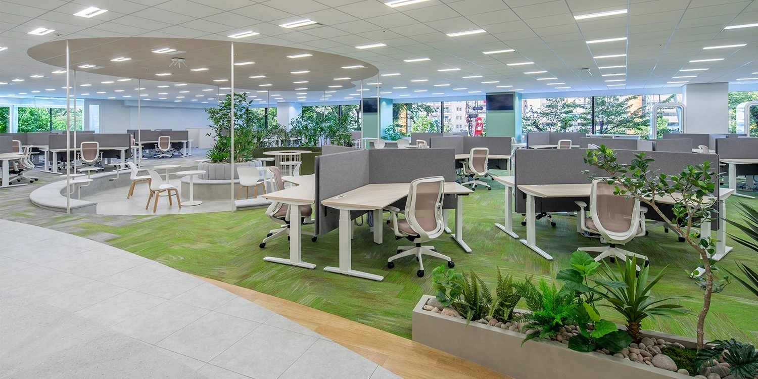 新たな働き方と企業文化の醸成のため、同じビル内でのご移転のお手伝いをさせていただきました。3方ある窓面と緑の景観を生かして、“都市に計画された公園”をコンセプトにデザインしています。業務に応じて働く場所を選べるゾーニング、エルゴノミクスに配慮した大きめの昇降デスクを採用し、今までにないフリーアドレスでの集中と解放感を両立することで新たな働き方に対応しながら、企業文化の醸成につながるコミュニケーションスペースを随所に用意しています。屋外にいるような気持ちよさを感じるアースカラーのデザイントーンと、ほとんど壁を作ることなく30cmの段差や家具で空間を緩やかに区切る構成とすることで、公園のようなオープンでウェルカムな雰囲気を演出しています。