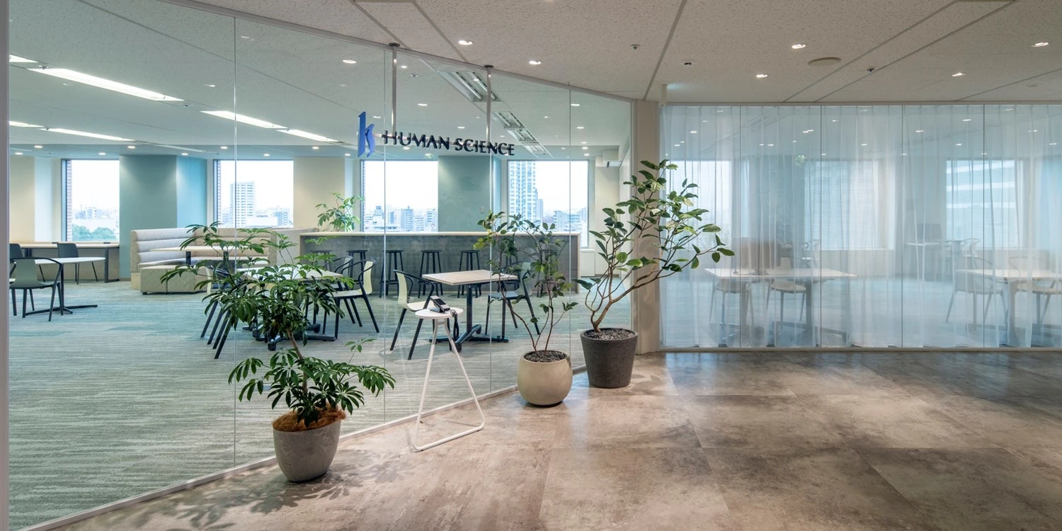 働き方の選択肢が多様化する中で、常に変化に対応しながら最適解を見つけていく「アジャイルオフィス」をデザインしました。社員の皆さまの業務効率を高めつつ、帰属意識や活発なコミュニケーションを生み出す環境を目指しています。ガラス張りのエントランスから抜けて見えるワークスペースには、可動式のフリーアドレスデスク、ファミレススペース、カウンタースペース、個人ブースなど、時間帯や仕事内容によって柔軟に選択できるエリアを点在させました。フレキシブルかつ活発に“働く”を楽しめる空間になっています。また、全体の色味を明るい寒色で統一することで、働く方・来社する方へ、ヒューマンサイエンス様らしい爽やかな印象を与えるオフィスとなりました。