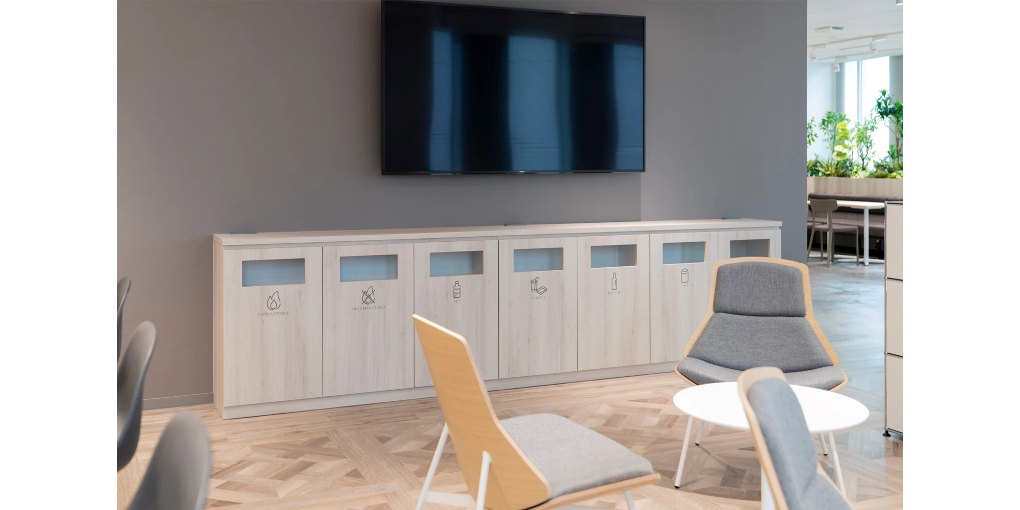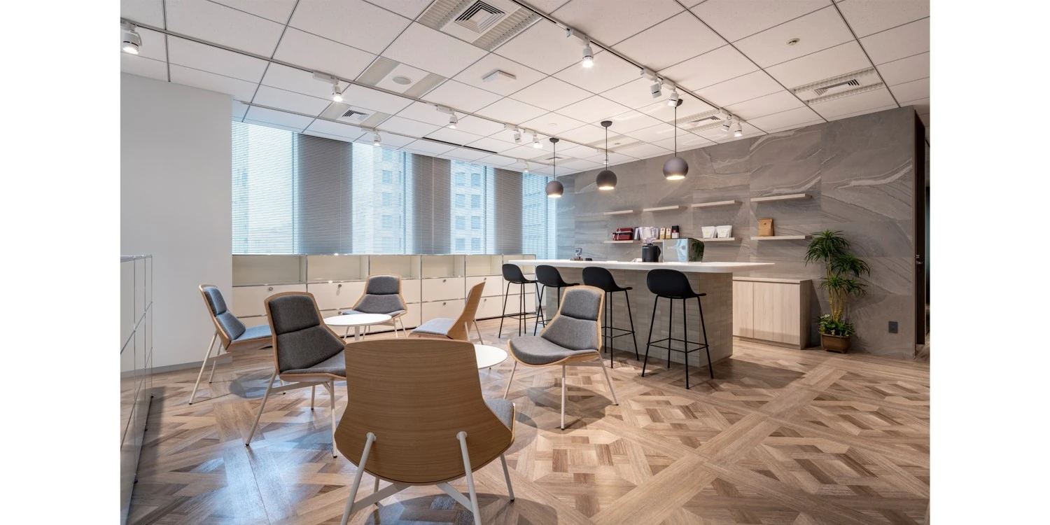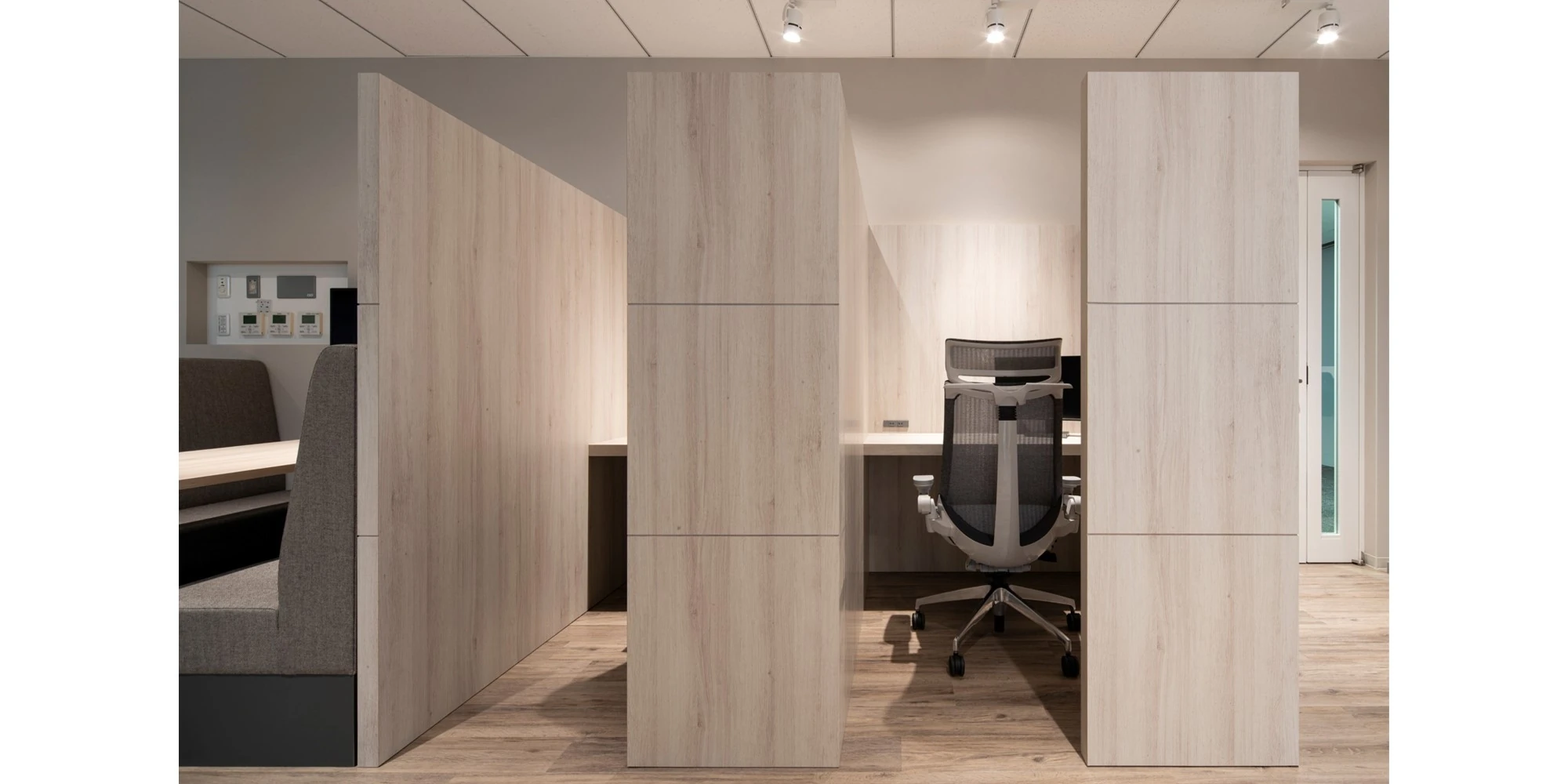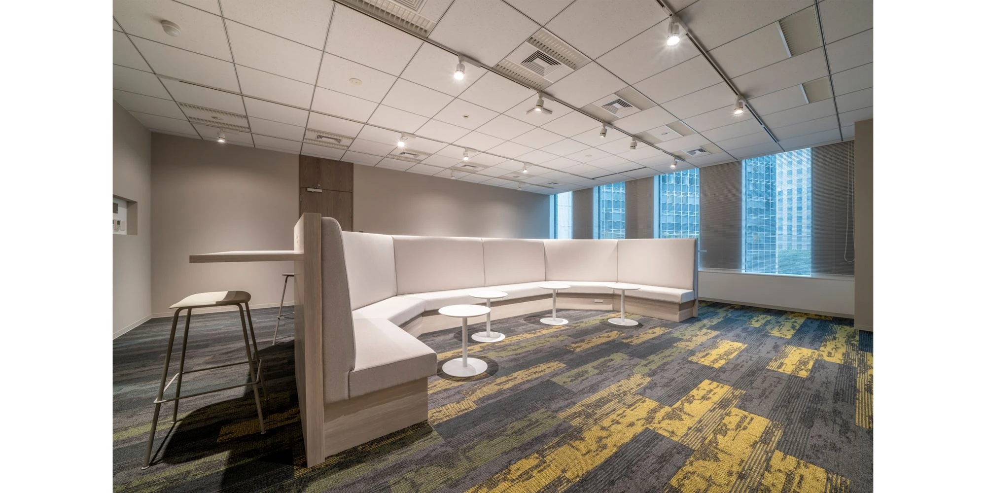 リマテックグループ様の3社統合移転のお手伝いをしました。リモートワークでも業務が進められる現状において、「出社したくなるオフィス」「イノベーションが起こる仕掛けや空間」を実現したいというご要望をいただき、オフィスを設計しました。完全フリーアドレスのレイアウトで、働き方やミーティングに合わせて場所を選択できるよう、カウンターデスク、カフェスペース、集中ブース、ファミレスブース、セミナールームなどさまざまなエリアを用意。一つひとつの素材・家具にも一切妥協しない、こだわりのオフィス空間となりました。