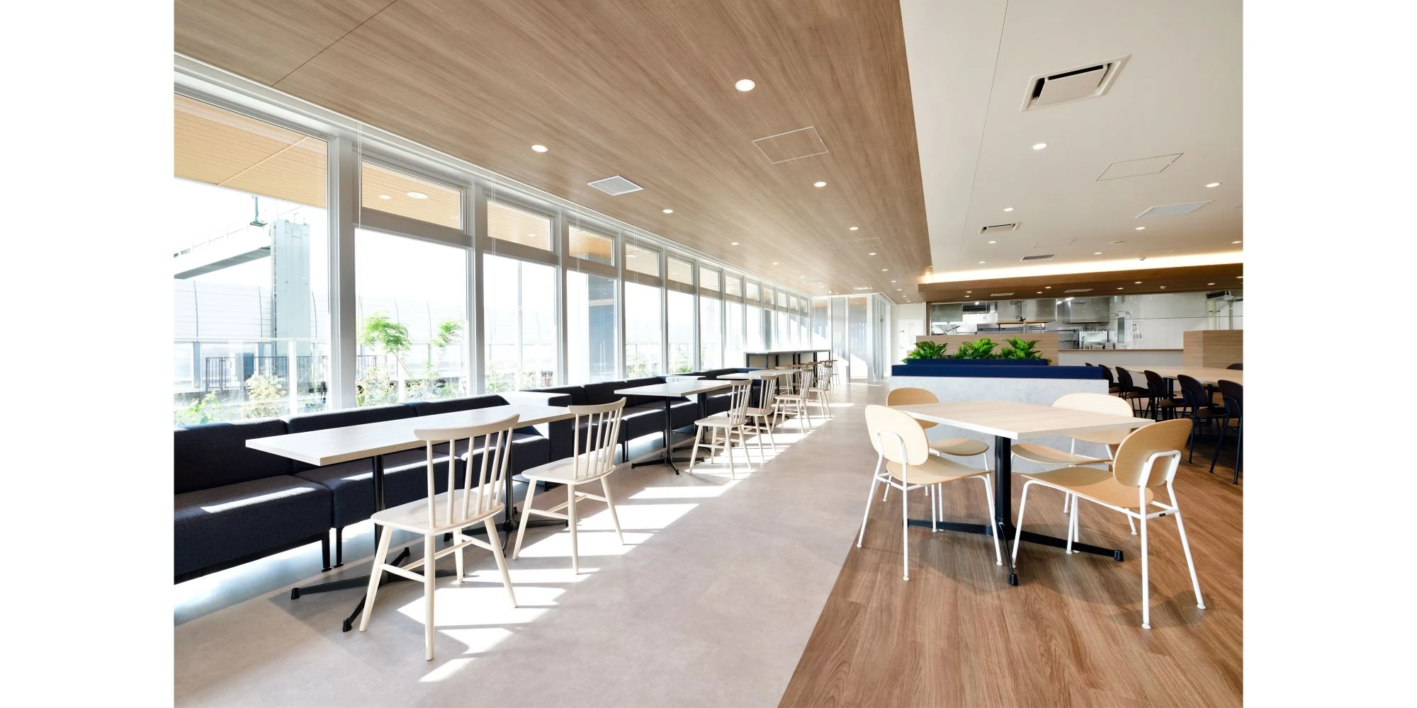 5F建ての新社屋設立に伴うオフィスデザイン・新規什器のお手伝いをしました。「ものづくりの会社でありながらも、人が中心・人の集まる場所にしたい」という想いを最初にうかがい、オフィスの使い方・働き方を考えたり、社員様のご意見を取り入れたりと、お客様と一丸となってプロジェクトを進められたことが印象的です。新社屋に入ると、エージェンシーアシスト様の事業内容が一目で分かるパーツを施したシンボリックなエントランスがお出迎え。社員の皆さまが集まる食堂は、暖かみのある木目やブリックタイル・グリーンを取り入れ、コミュニケーションが活発化するようデザインしています。