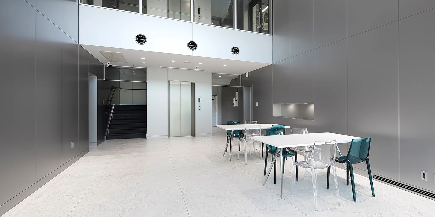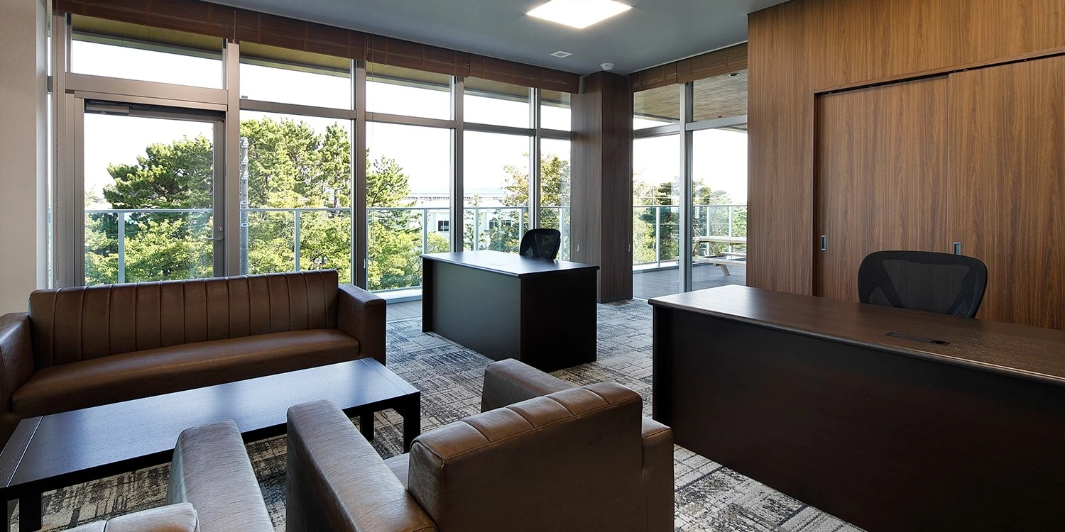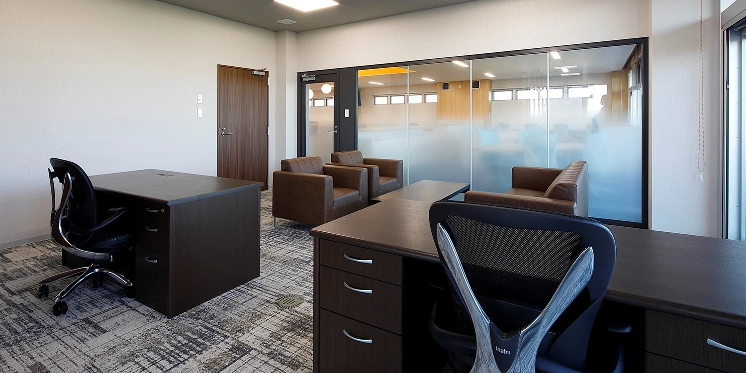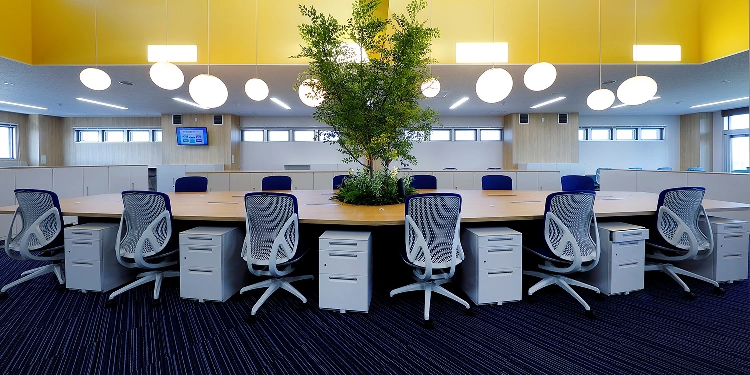 自社ビル建て替えのタイミングで、3フロアのうち3階オフィススペースと1階エントランスをお手伝いしました。「釣り」を楽しむ人をサポートする府中屋様、オフィスのコンセプトは「昼マヅメ」。本来は朝と夕方、魚たちが最も活発に活動する時間を「マヅメ時」と呼びます。釣り人たちの待ち焦がれる「マヅメ時」のように、府中屋の皆さまがこのオフィスで働く昼間の時間が、待ち遠しく、“大漁の成果”につながる時間になればという願いを込めました。多様なスペース構成で働く場所を選びやすく、大きな窓からたくさん入る光を生かした明るいデザインで活発な雰囲気のオフィスができあがりました。