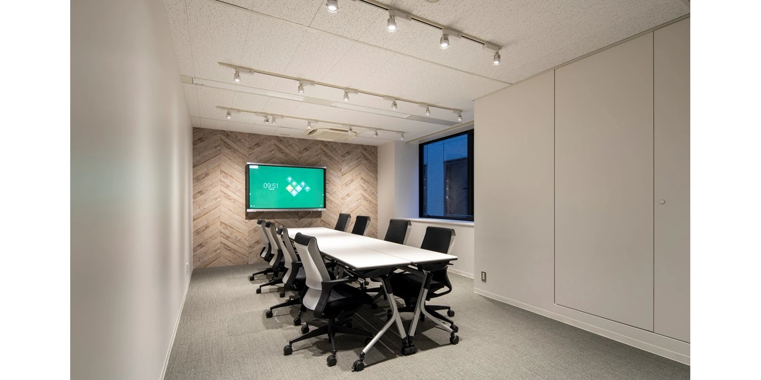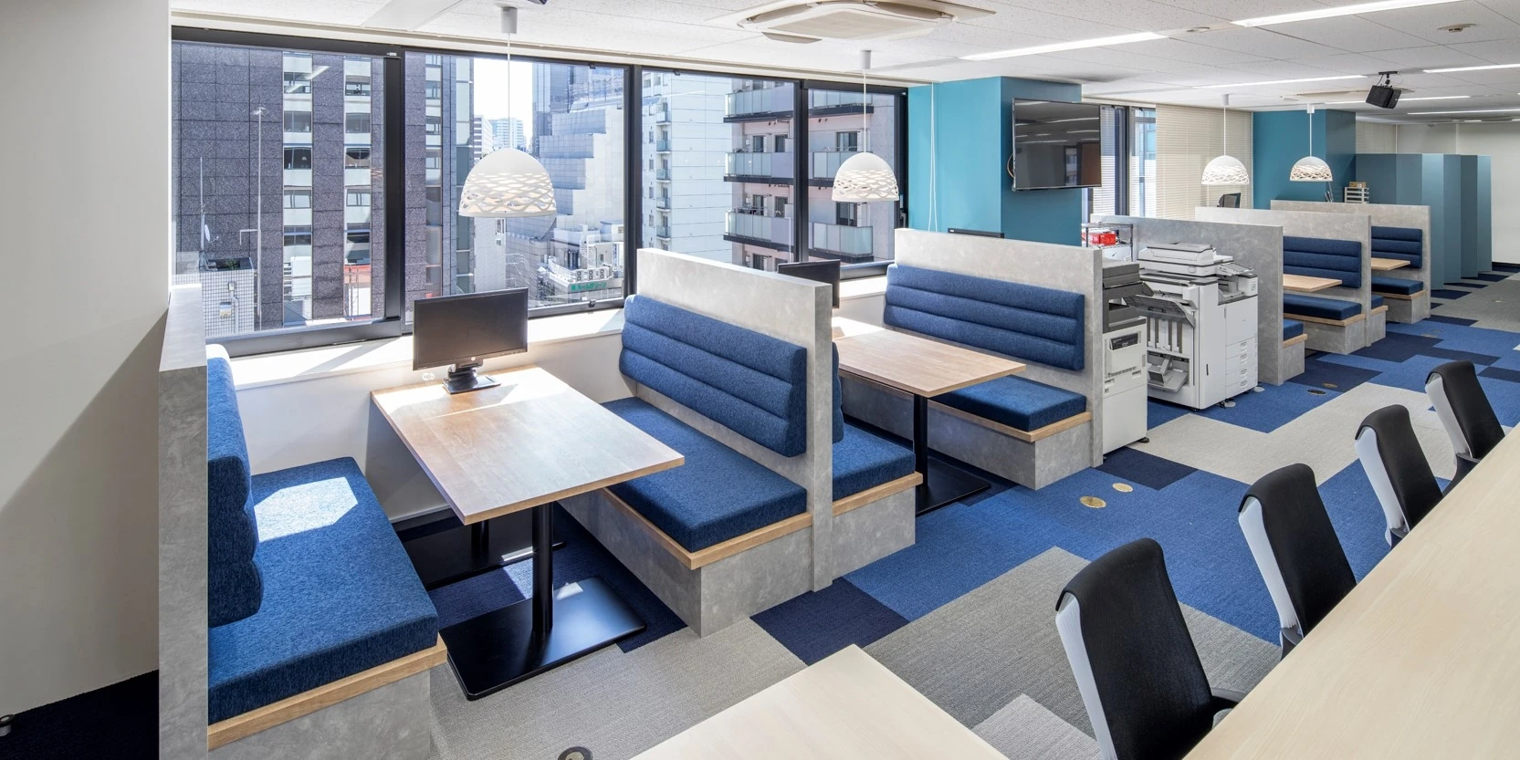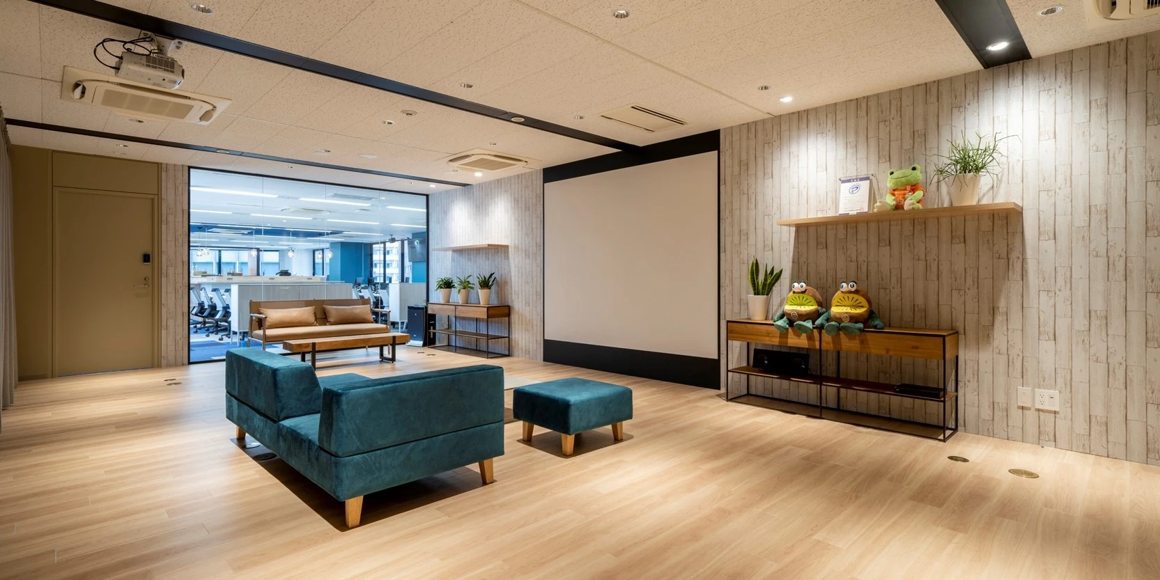 グッドウェーブ様とエヌ・エイ様 2社の合同移転をお手伝いしました。サーフショップのテイストを取り入れ、床材の貼り分けで波の動きをイメージしています。ファミレスブースやオンラインブースのほか、執務室中央にシンボリックなカウンターを配置し、コミュニケーションが取りやすく、仕事の内容によって働く場所を選べるABWを取り入れました。壁の色や家具には一部遊び心を出し、他にはないオリジナリティのある空間になっています。エントランスから入ったラウンジスペースは家具の配置を変えることでセミナー開催にも対応することができ、来社された方にもブランドを感じてもらえるつくりになっています。