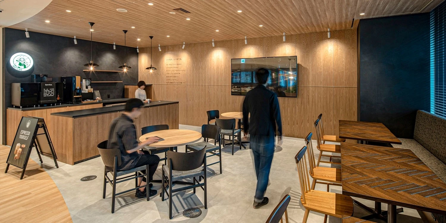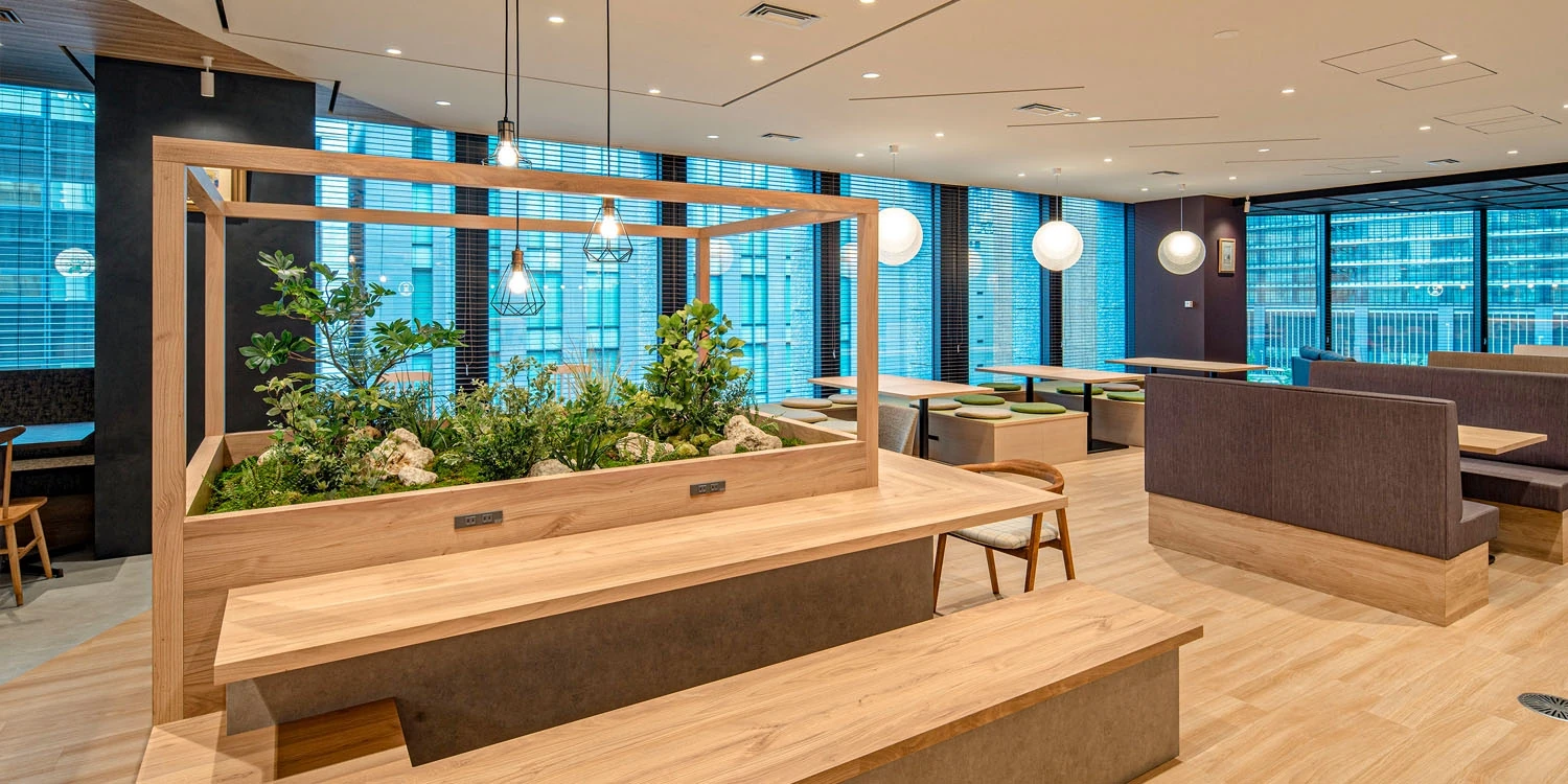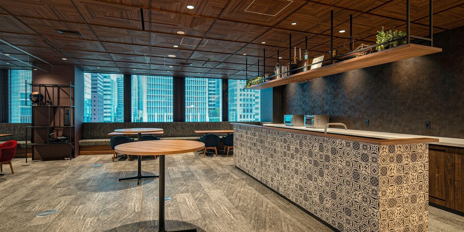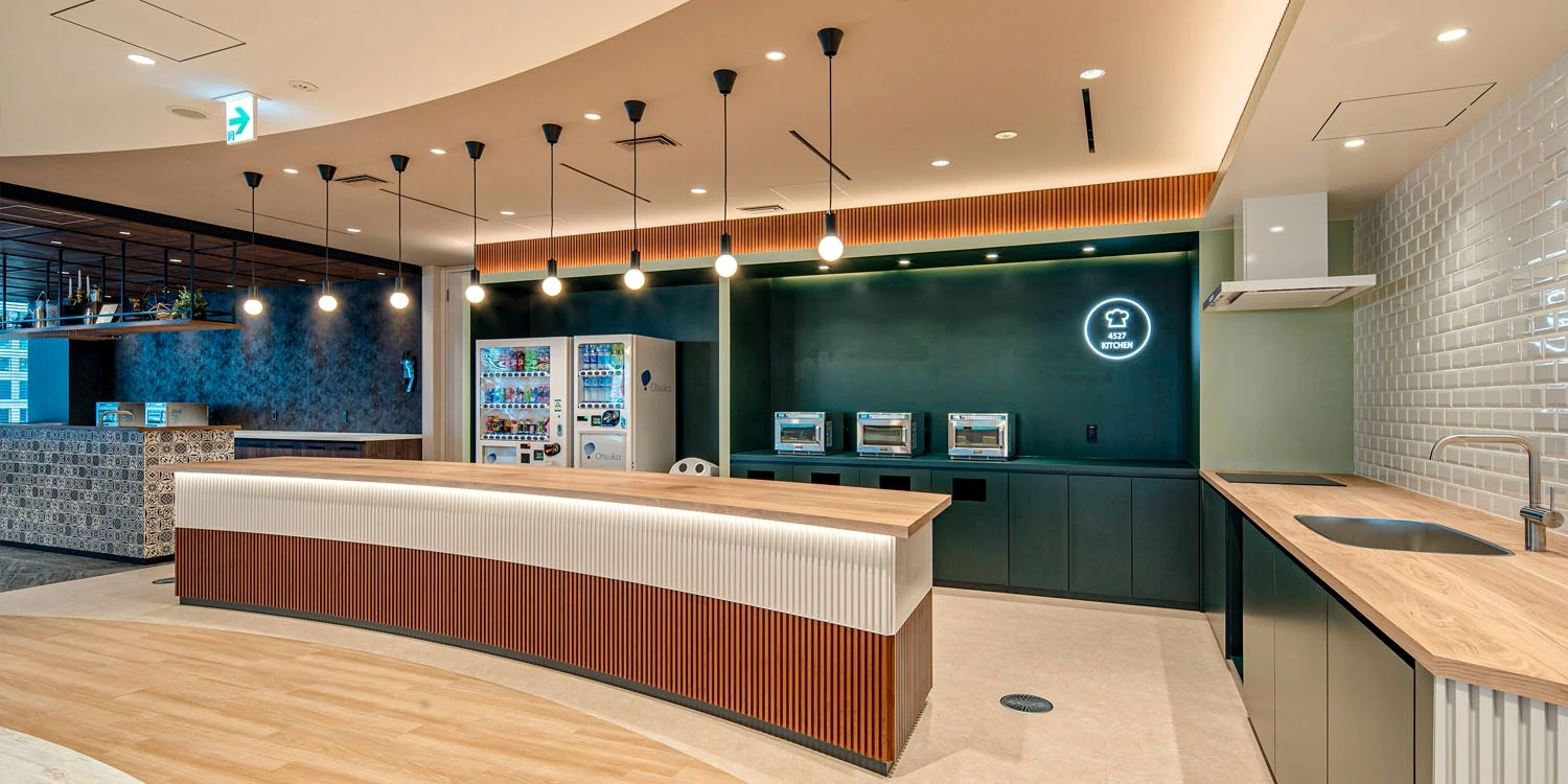 東京・神田にある新社屋の6階スペースをカフェラウンジとしてデザインしました。昭和の大横綱、大鵬幸喜の全盛期に設立した大鵬薬品工業様。本社代表電話番号でも使用する「4527(横綱 よこづな)」の語呂合わせを、ラウンジスペースの名称としても活用し「4527 LOUNGE」と名付けました。中央の床と天井の円のサイズを意図的に変えることでその差分を出し、大鵬薬品工業様のロゴのリング形状を表現しています。家具は動かしやすいものを多く採用しており、さまざまなレイアウトを生み出すことができます。全て目線より下に配置することで、空間の抜け感を演出しました。1つの空間の中に「ラウンジ」「キッチン」「カフェ」があるため、それぞれの世界観が崩れないよう素材選びにもこだわりました。