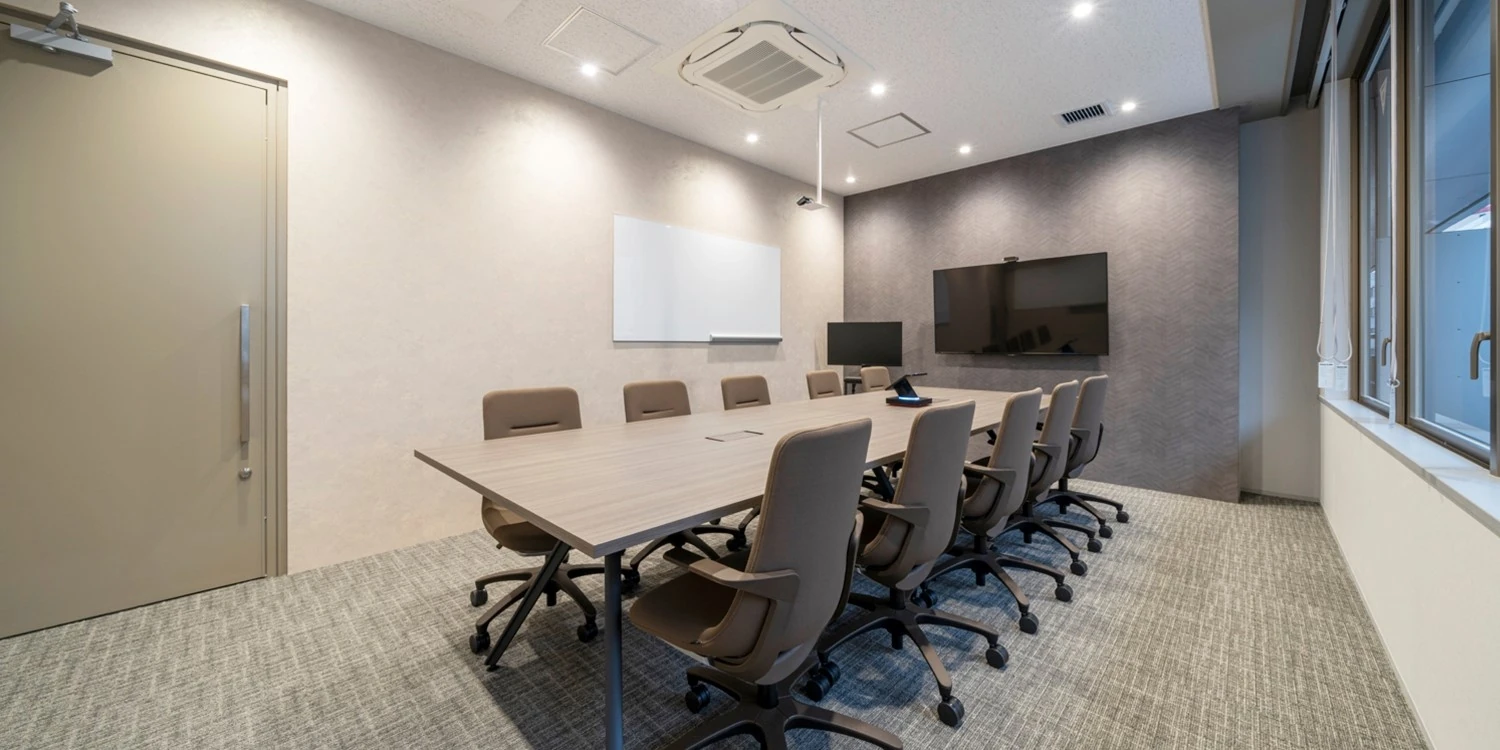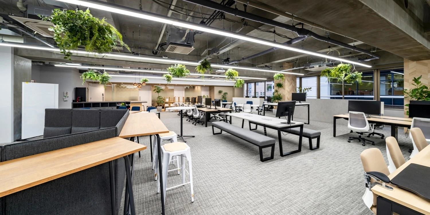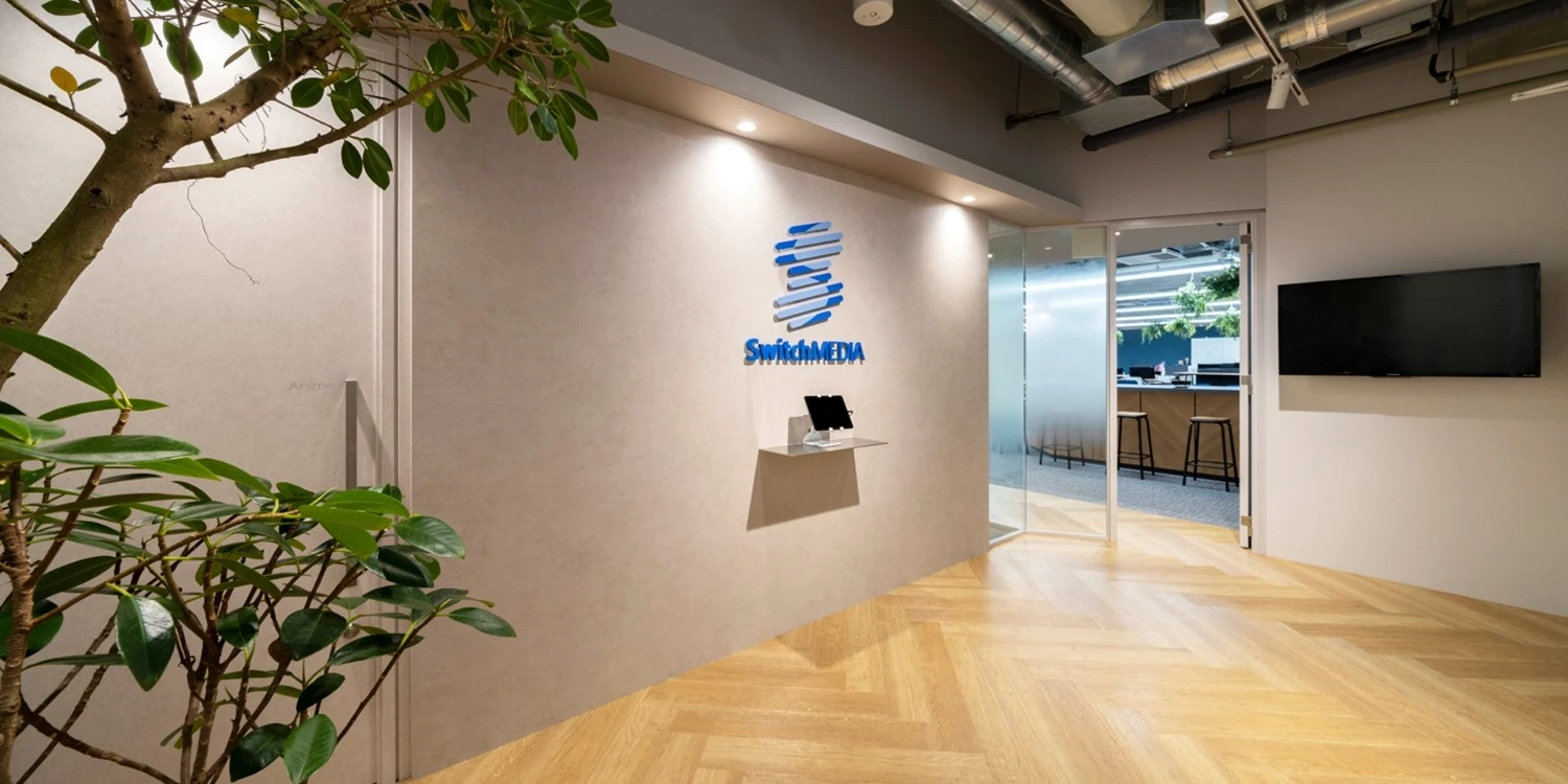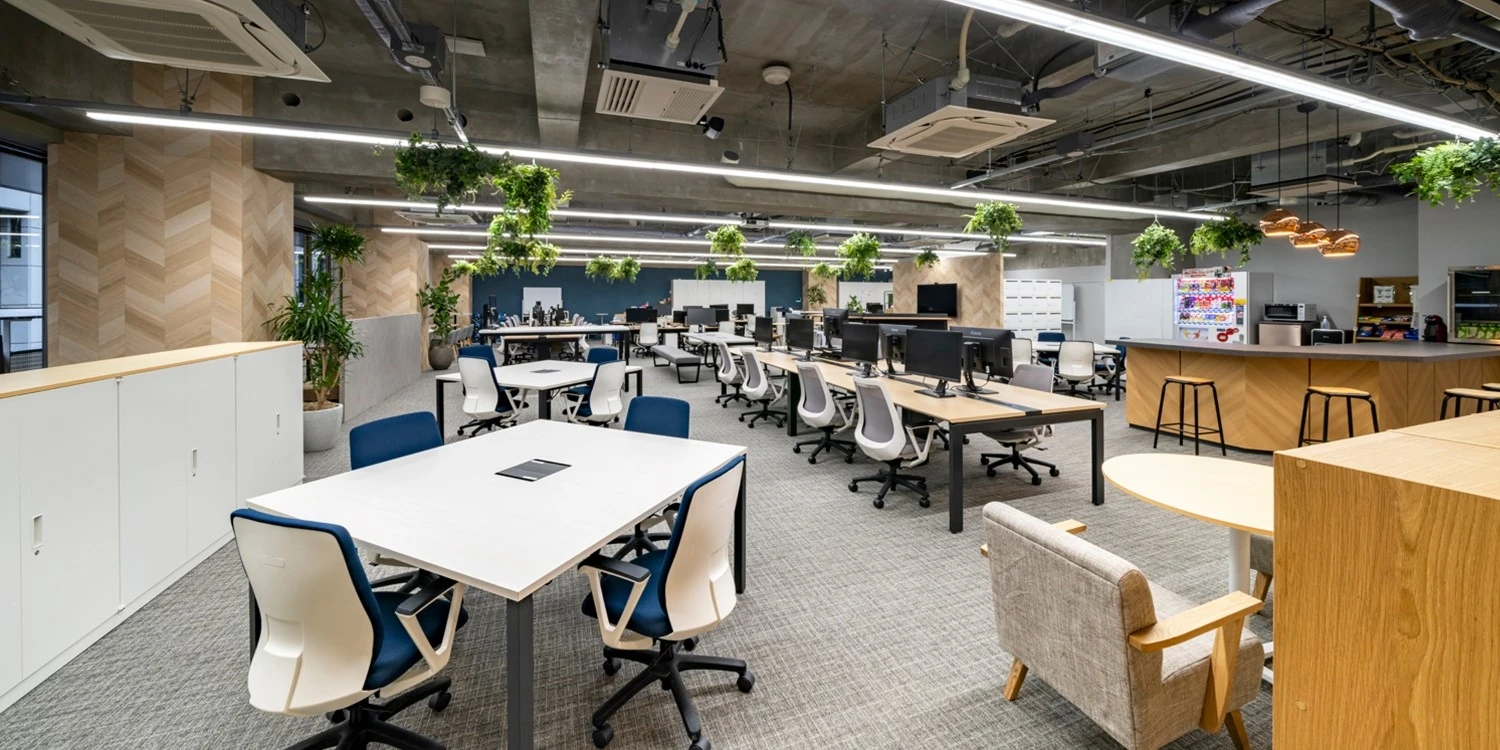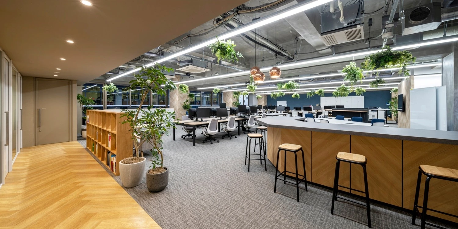 天井スケルトンのデザイナーズ物件へのご移転プロジェクトでした。すでにリモートワークを積極的に導入されているので“オフィスに来ることの意味”に着目し、働きやすい空間を重視しプランニングしました。天井がスケルトンで高く開放的な空間ですが、冷たい印象にならないようにアクセントとして植栽パネルを吊るし空間に変化をもたらせました。スタンディング席、集中スペース、モニタースペースなどオフィス内にABWの働き方を積極的に導入し、快適で生産性が上がるオフィスとなりました。また今回のご移転を機に社名も変更したため、ロゴのデザイン製作もお手伝いしました。オフィスに加えロゴの製作と、トータルでブランディングをお手伝いしました。