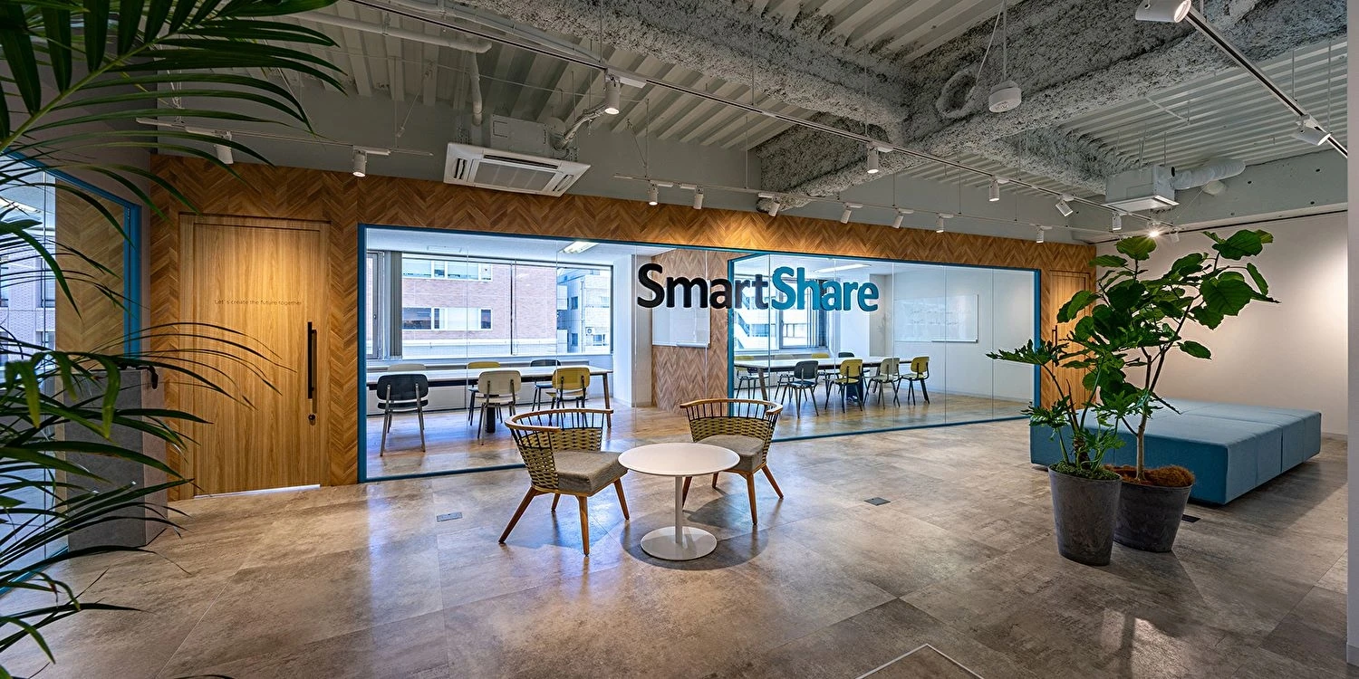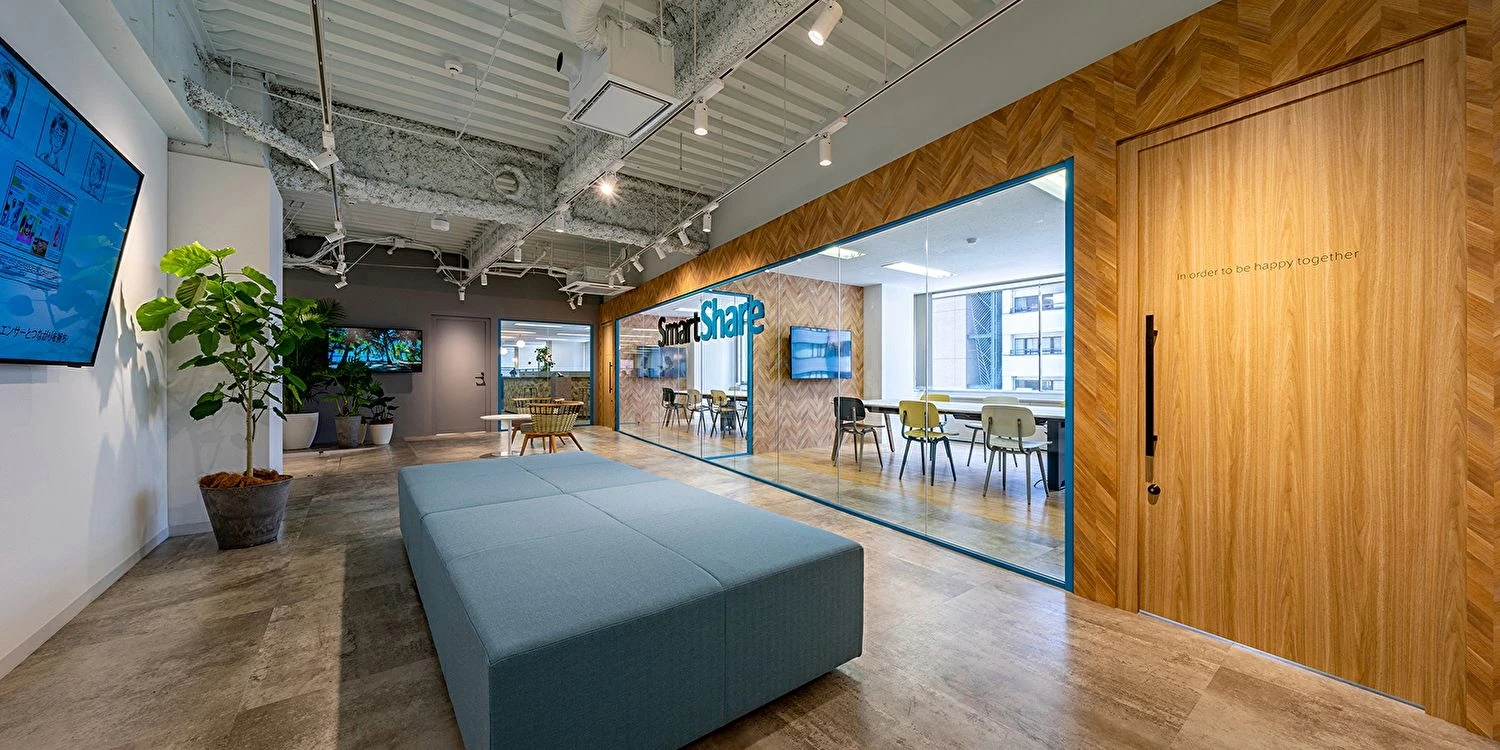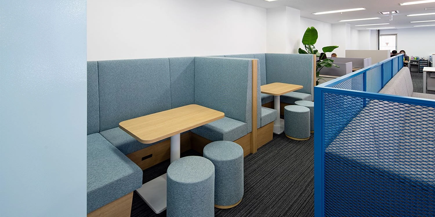 ご移転に伴い、固定席からフリーアドレスへと働き方の変化を実現しました。様々な働くエリアの中でも、オフィスの中央に一体感を生むことができるL字のソファ席を設けたことにより自分たちの考えを共有する場として、移転前の課題であったコミュニケーション不足の解消を促しております。また、コーポレートカラーのブルーを散りばめたり、壁にアートペイントをすることで、視覚からスマートシェア様らしさを感じることができるオフィスとなりました。