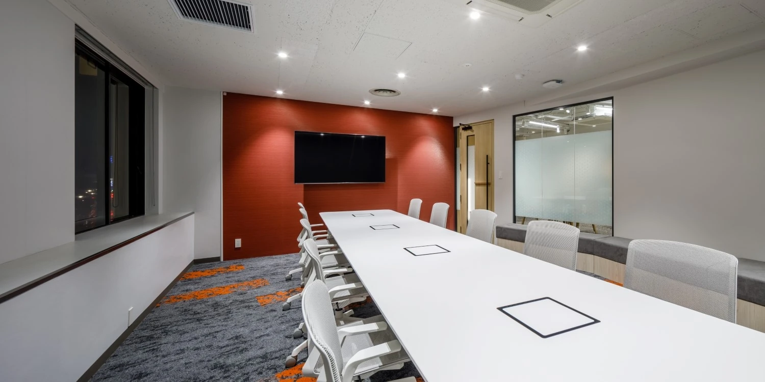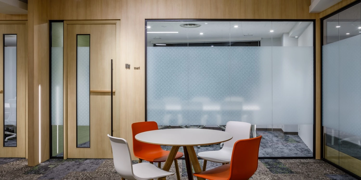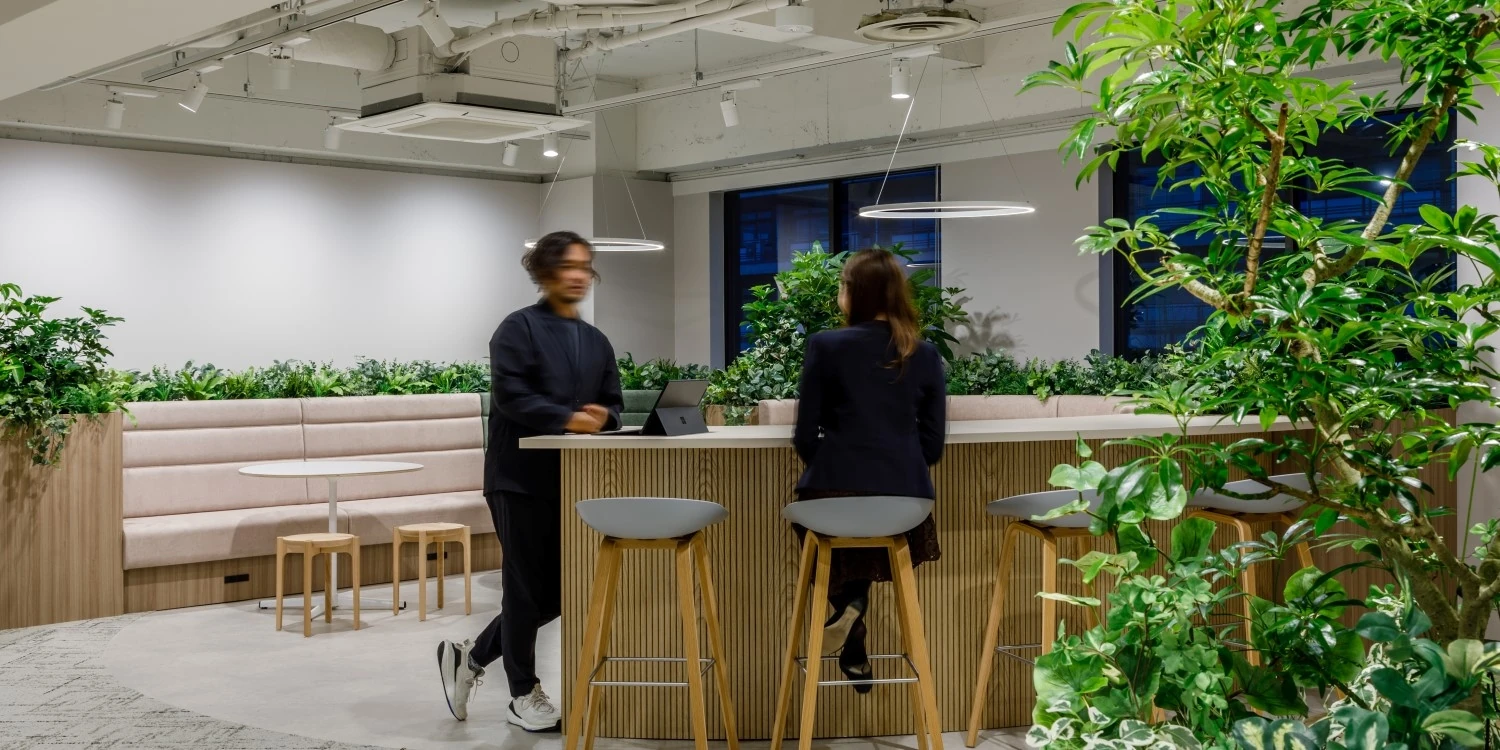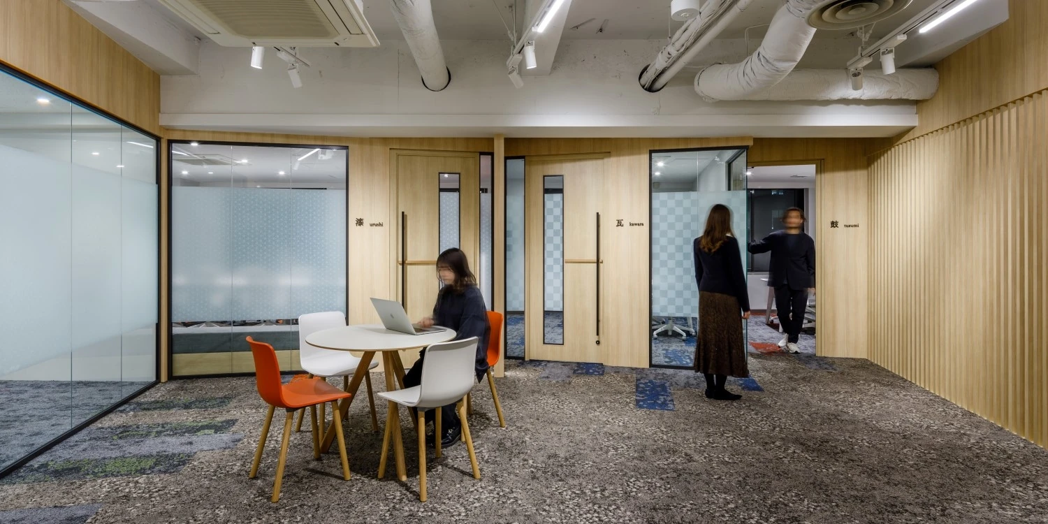 熊本県で一番、働く社員の居心地が良いオフィスにしたいとご要望をいただき、熊本の県木で常緑広葉樹でもある「クスノキ」から着想を得てデザインしました。強い生命力と枝葉の広がり、そして自然と集まりたくなる包容力は、この土地の象徴となっているように感じられます。会議室のある5階を「枝葉のゾーン」とし、壁のつくり、カーペットの貼り分けやルームサインにこだわりました。4階はその木漏れ日の下に集まって働く「根幹ゾーン」とし、フリースぺースのグリーンや造作家具が象徴的なフロアです。明るく開放感のある洗練された空間となりました。