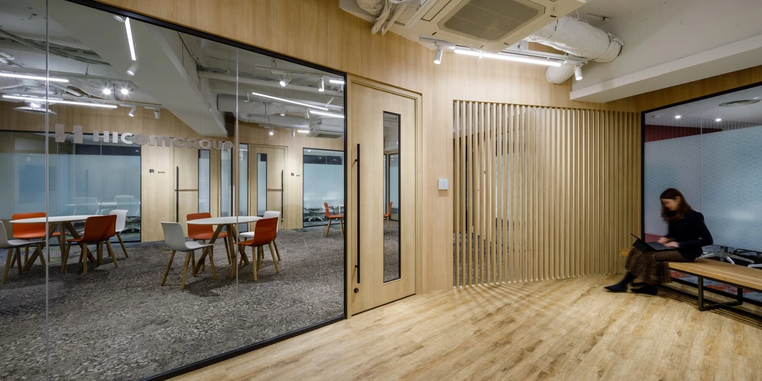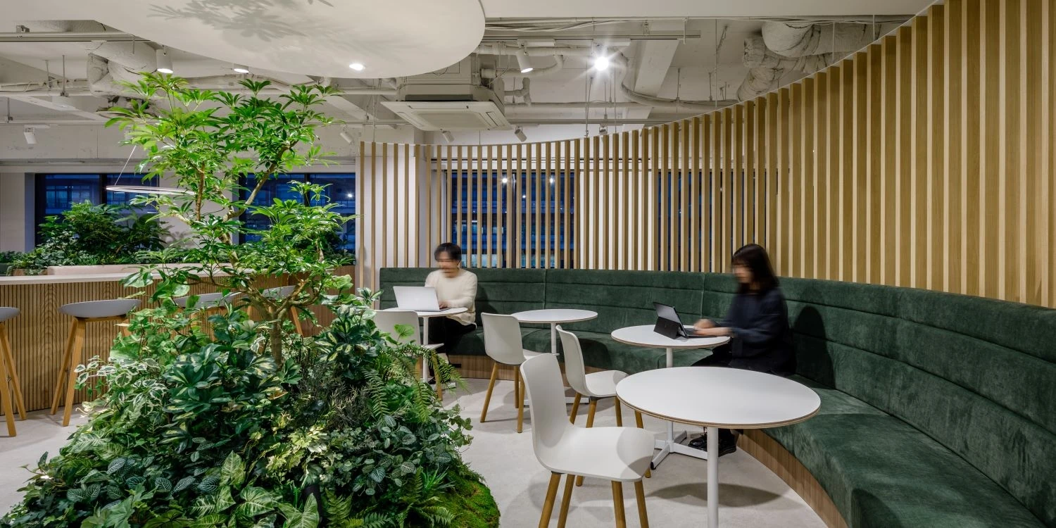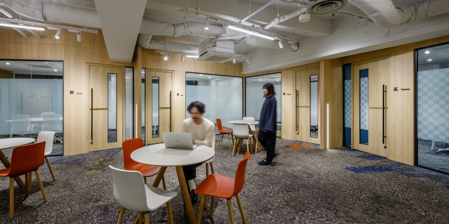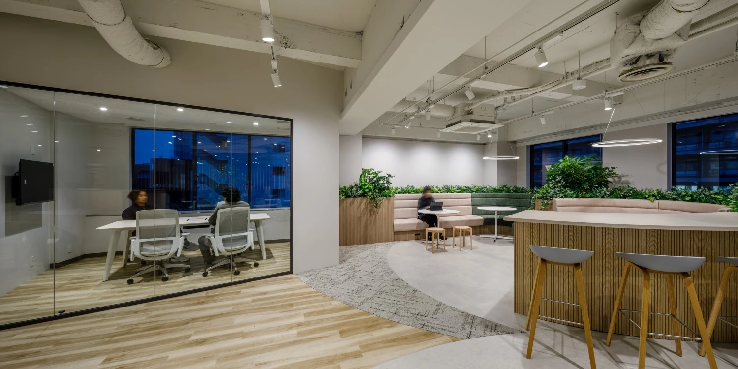熊本県で一番、働く社員の居心地が良いオフィスにしたいとご要望をいただき、熊本の県木で常緑広葉樹でもある「クスノキ」から着想を得てデザインしました。強い生命力と枝葉の広がり、そして自然と集まりたくなる包容力は、この土地の象徴となっているように感じられます。会議室のある5階を「枝葉のゾーン」とし、壁のつくり、カーペットの貼り分けやルームサインにこだわりました。4階はその木漏れ日の下に集まって働く「根幹ゾーン」とし、フリースぺースのグリーンや造作家具が象徴的なフロアです。明るく開放感のある洗練された空間となりました。