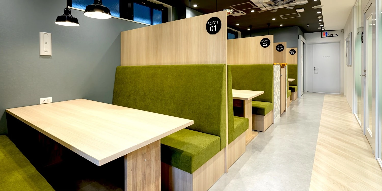 名古屋・浄心という閑静な住宅エリアの駅前にスタイリッシュな空間が完成しました。新築の2階建てビルの路面店で、駅を出てすぐに「OPENHOUSE」のサインと大型モニターが目に入ります。室内は、天井のカラーを外観のスタイリッシュな雰囲気と連動させつつオープンハウス様らしさも表現したデザインで、ブランディングを意識し他店舗との統一感を出しています。来客スペースは、お客様同士の目線が合わないよう配慮しつつ、キッズスペースの様子もわかるよう設計しています。