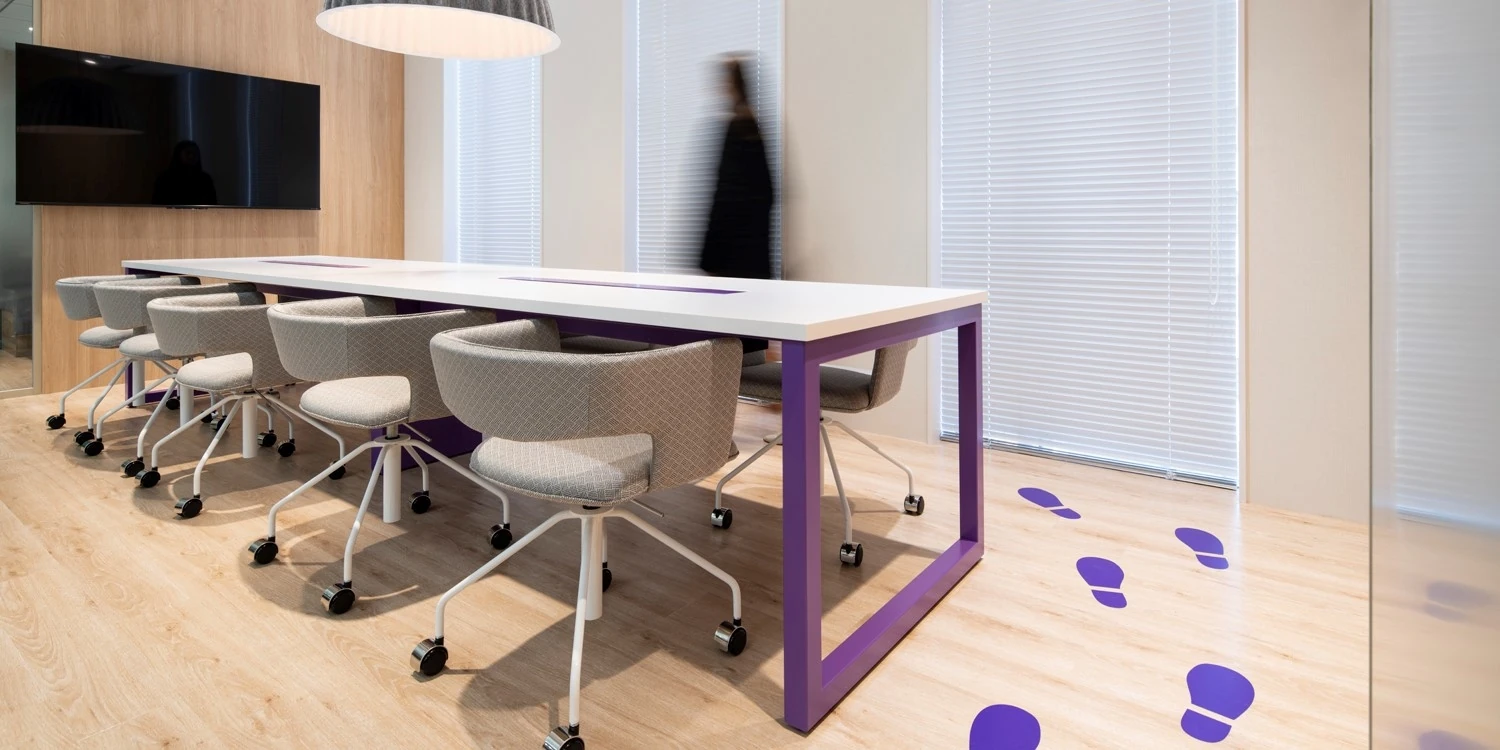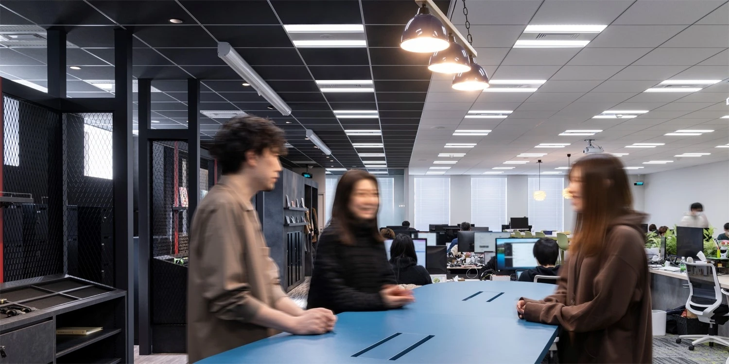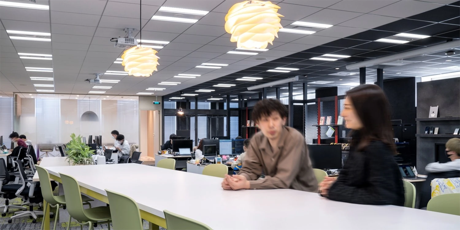 デザインの明暗コントラストと5色のロゴカラーが印象的な、遊び心のあるオフィス