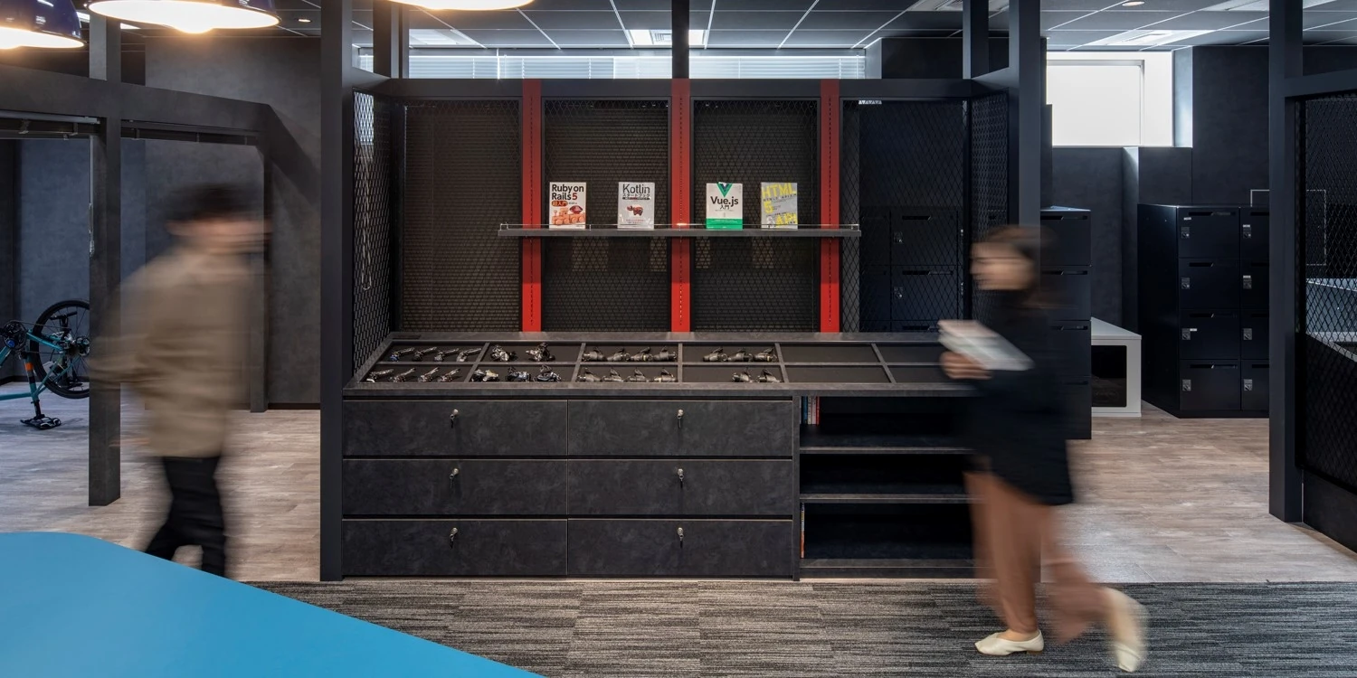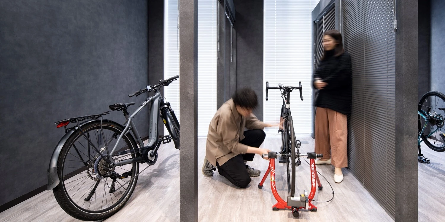以前ご移転をお手伝いした7階のオフィスに続き、今回は同ビル5階への増床をお手伝いしました。5階はソニックス様の事業の1つである『自転車に関するシステム開発』を行っている社員様専用のエリアで、自転車専用スペースやハードウェア機器用の壁面収納棚をオリジナルで制作しました。