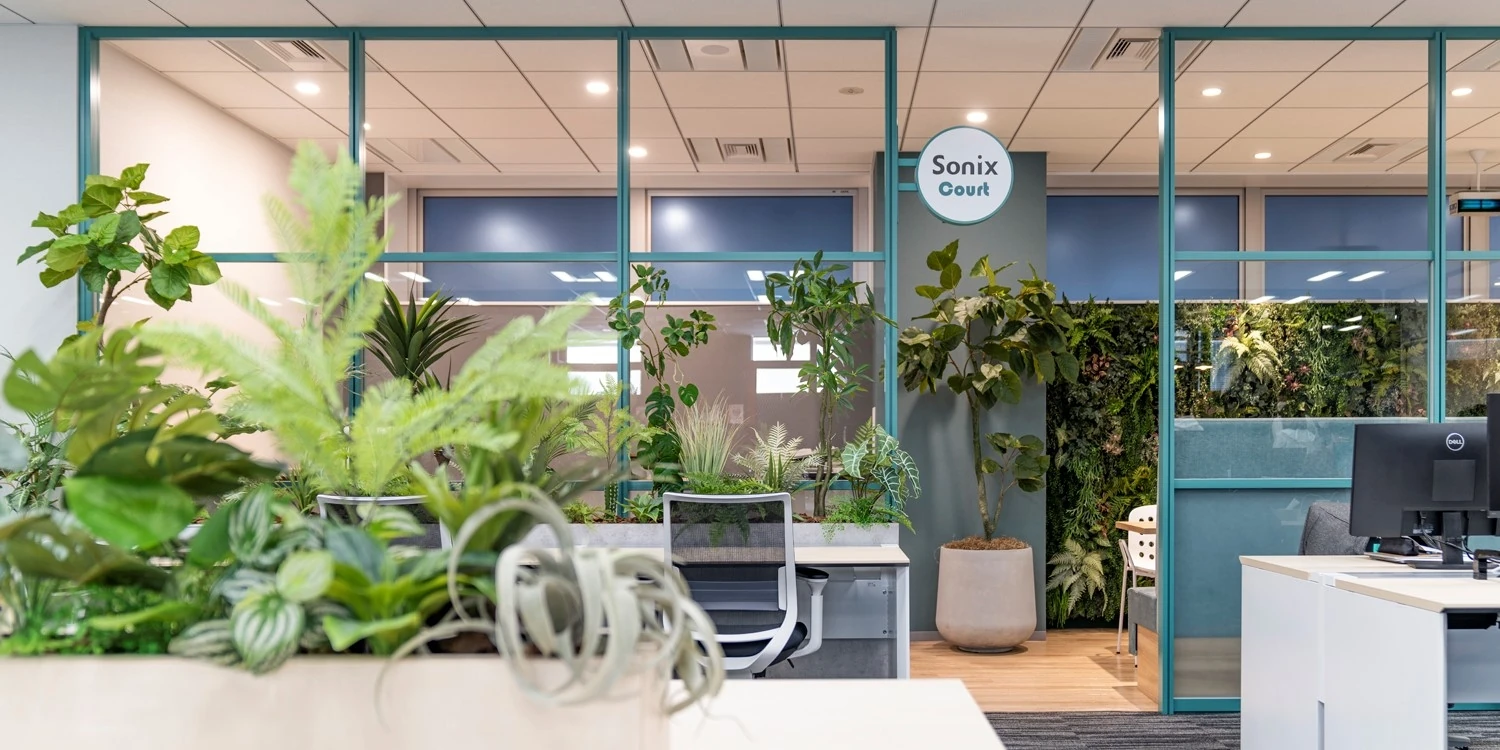 空間自体のコンセプトを明暗ではっきりと分け、自転車・ハードウェア関連エリアはブラック基調の無骨な印象、ワークスペースやリフレッシュエリアは植物をふんだんに使用した有機的な印象と、対比的に仕上げました。ソニックス様のロゴカラー5色をオフィス内にポイントでデザインすることで見る角度によって印象が変化する、遊び心を忘れないオフィスです。