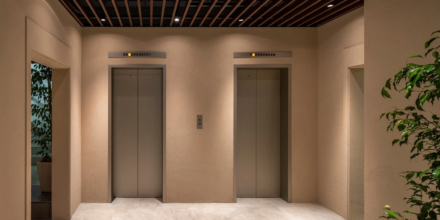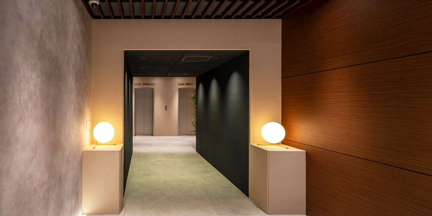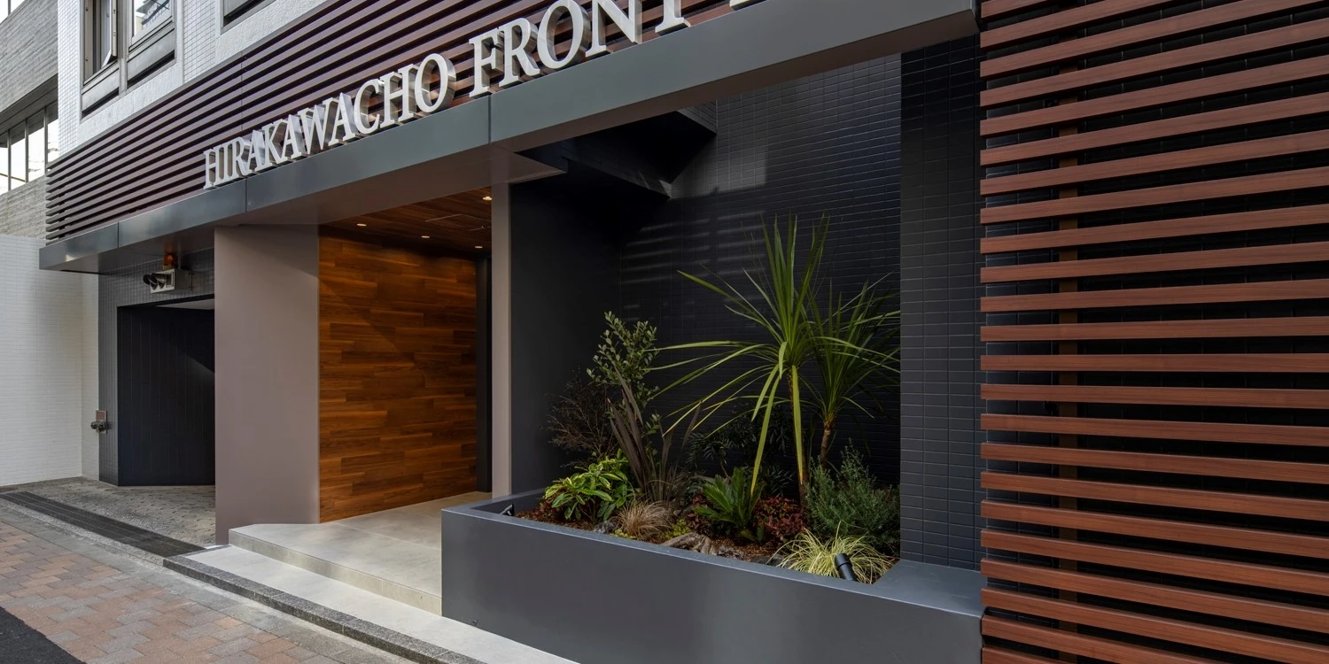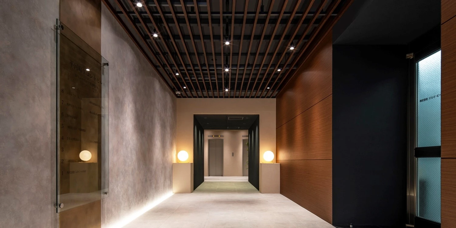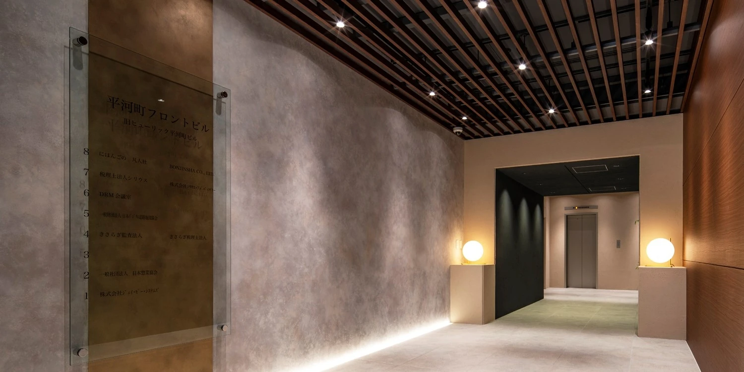 オフィスビルの外壁・1Fエントランスホールのリニューアルプロジェクト。デザインテーマは、ビルのある千代田区平河町・麹町付近のイメージから「Rerulate(律する、気品、信頼感)」としました。外壁は、周辺ビルや景観になじむ色使いを心がけ、ビルに元からある特徴的な段差を活かしてメリハリをつけました。ルーバー(細長い板材)を横に通すことにより、通行する方の目を引くデザインに仕上げております。エントランスホールは、外壁の印象を大切にし、木目で流れるような奥行き感を演出しました。