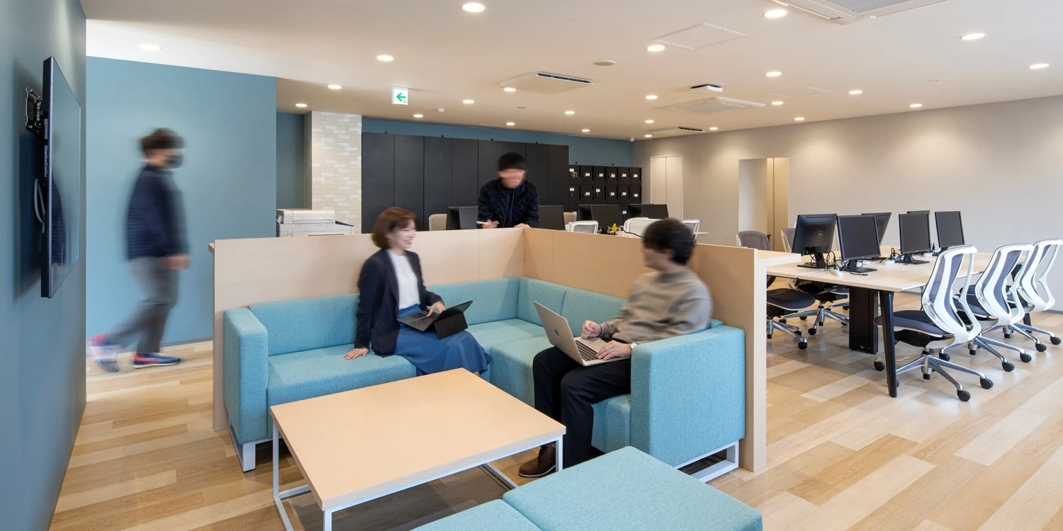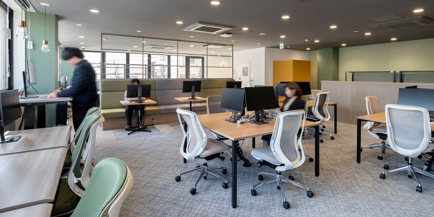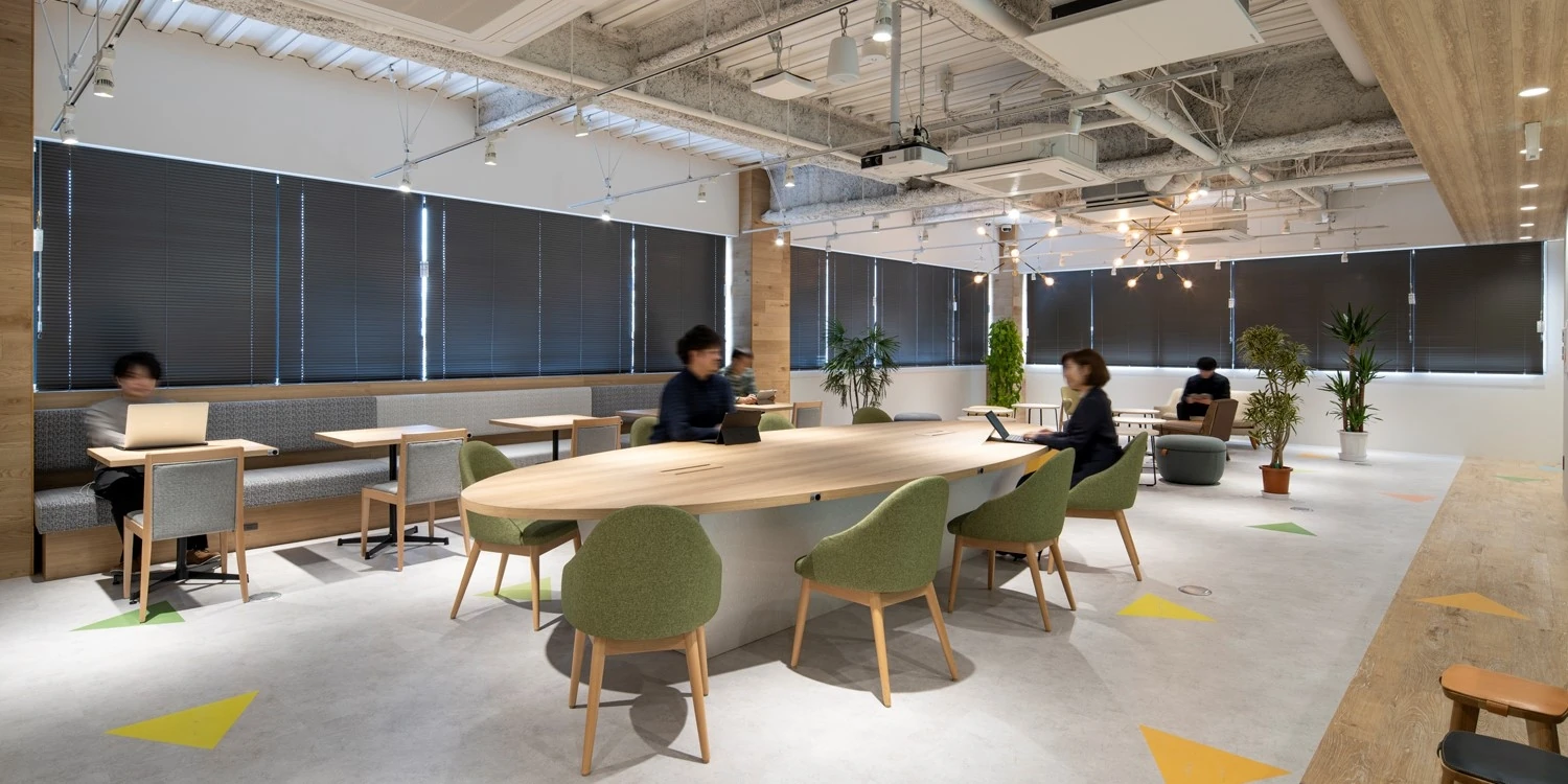 社屋の新築、働く環境の整備という創業100年を超える老舗企業様の新たな取り組みをお手伝いしました。これまで固定席で働いていた中、新オフィスではフリーアドレスを採用。フロアごとに異なるデザインとし、1階にはイートインも可能な自社製品を販売する店舗を設置、カフェのようなデザインを施しました。2・3階はワークスペース、4階がオープンスペース兼リフレッシュスペース、5Fが役員室兼ワークスペースとなっており、フロアをまたいでどこでも働くことができます。リフレッシュスペースの床にはロゴマークからインスピレーションを得た三角形をデザインするなど、働き方が変わっても、創業時から変わらない「小善本店らしさ」は残したデザイン・プランニングをしました。
