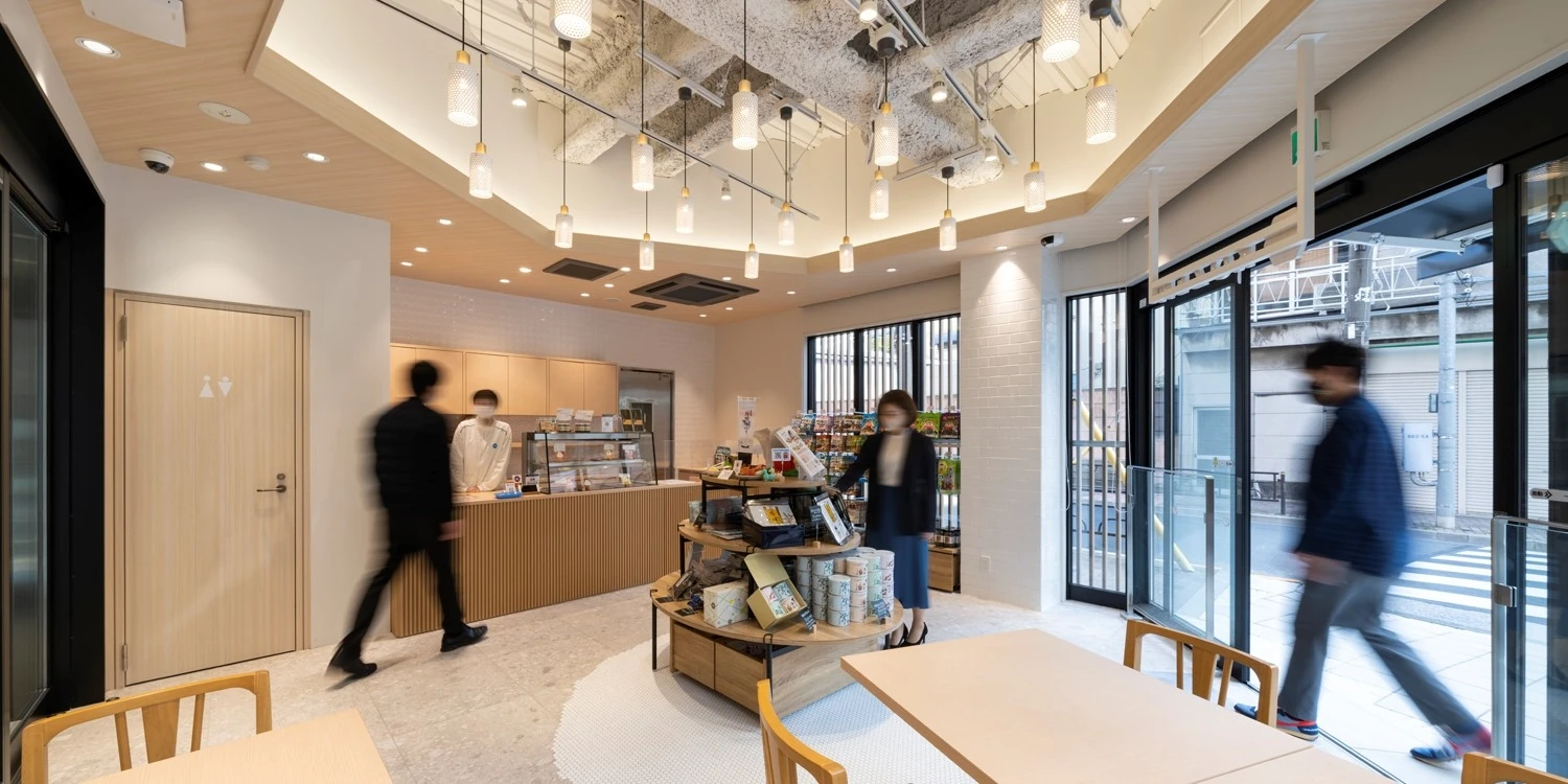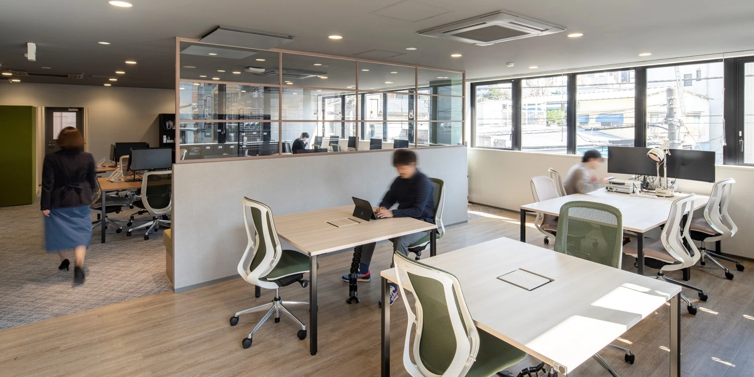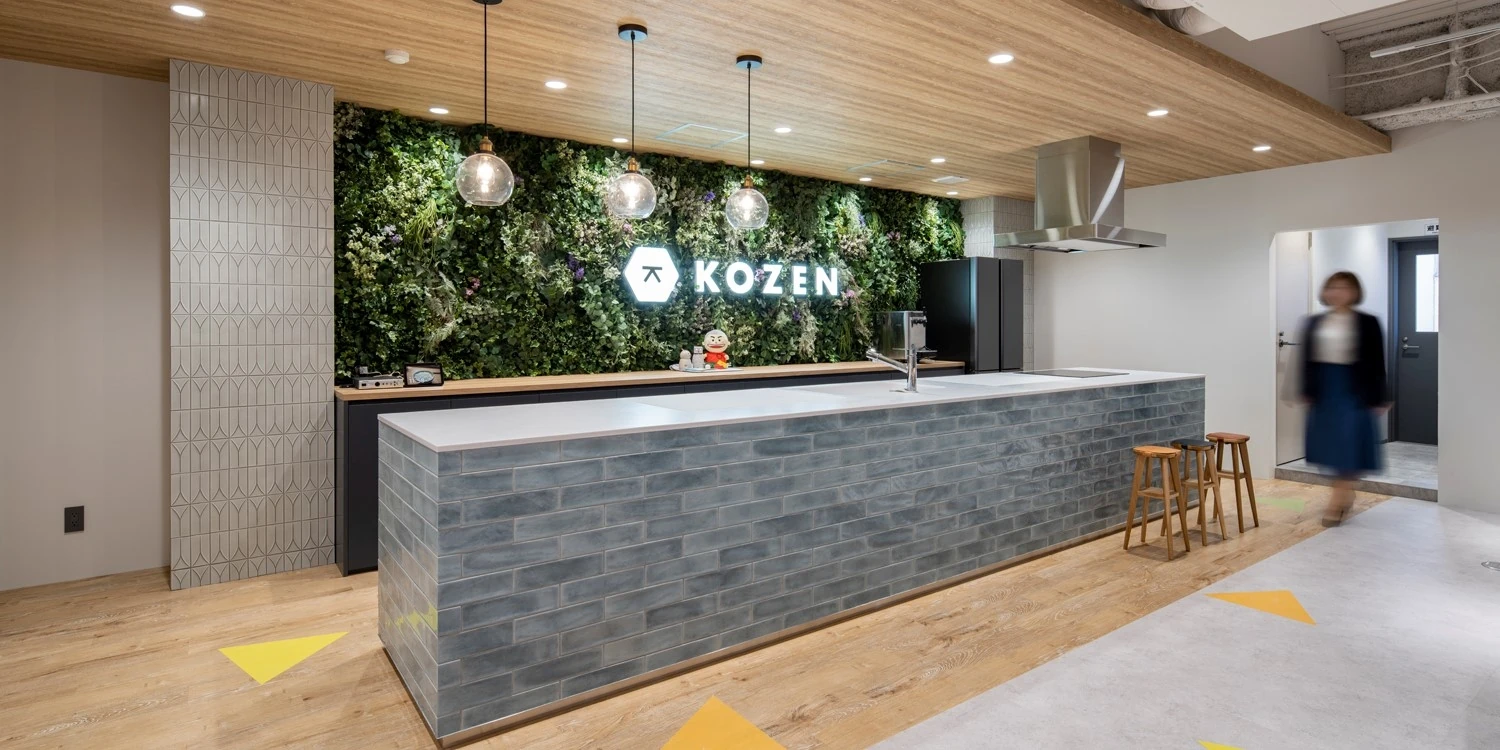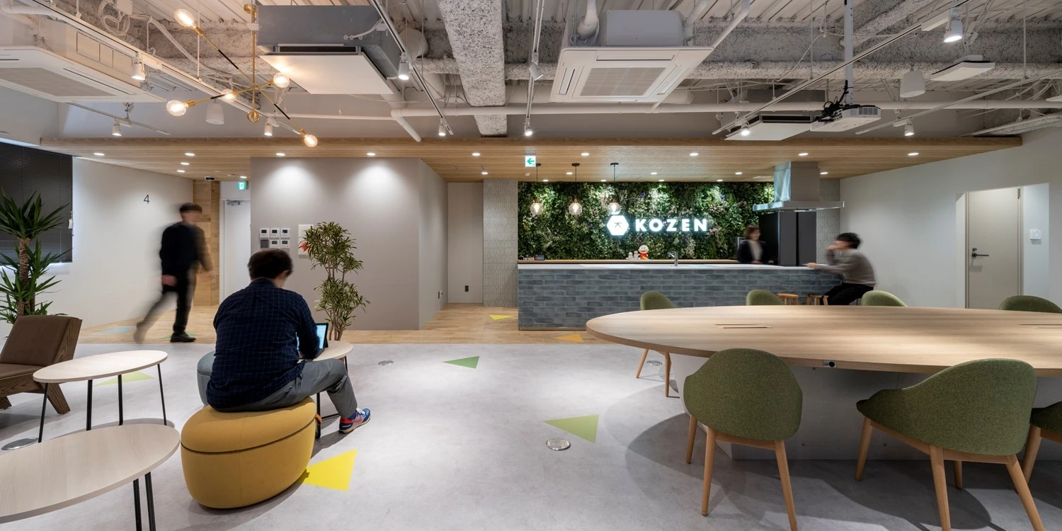 社屋の新築、働く環境の整備という創業100年を超える老舗企業様の新たな取り組みをお手伝いしました。これまで固定席で働いていた中、新オフィスではフリーアドレスを採用。フロアごとに異なるデザインとし、1階にはイートインも可能な自社製品を販売する店舗を設置、カフェのようなデザインを施しました。2・3階はワークスペース、4階がオープンスペース兼リフレッシュスペース、5Fが役員室兼ワークスペースとなっており、フロアをまたいでどこでも働くことができます。リフレッシュスペースの床にはロゴマークからインスピレーションを得た三角形をデザインするなど、働き方が変わっても、創業時から変わらない「小善本店らしさ」は残したデザイン・プランニングをしました。