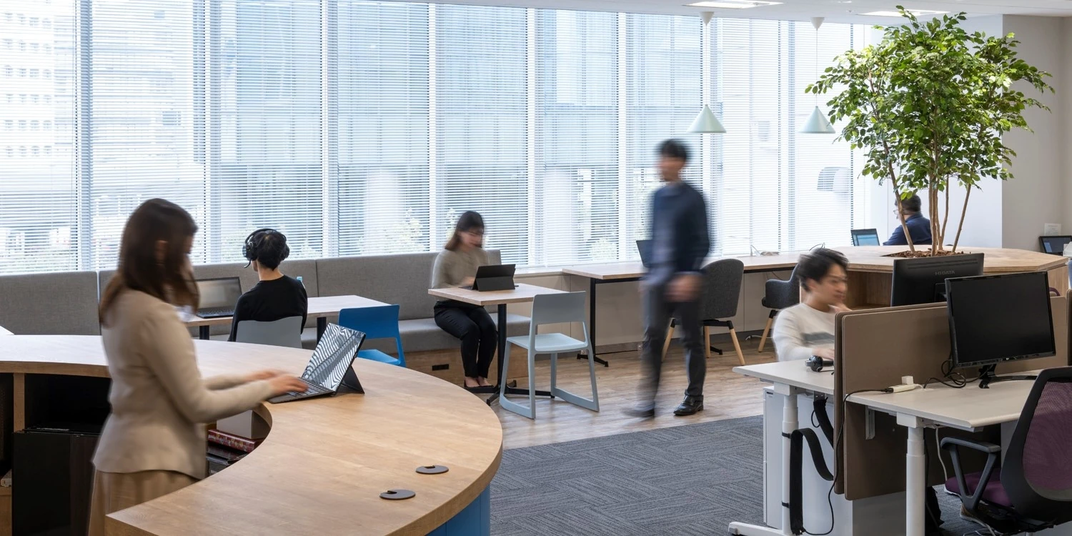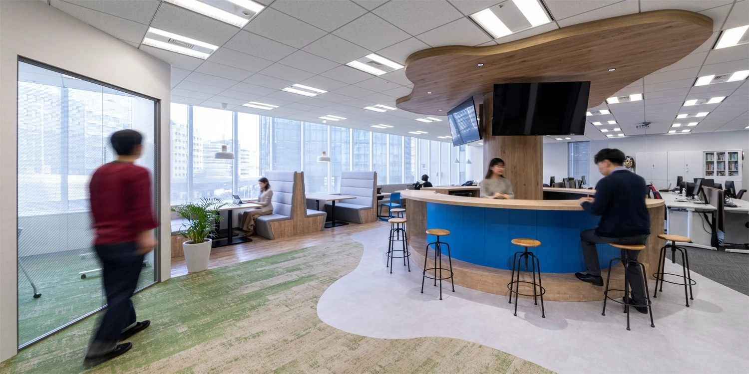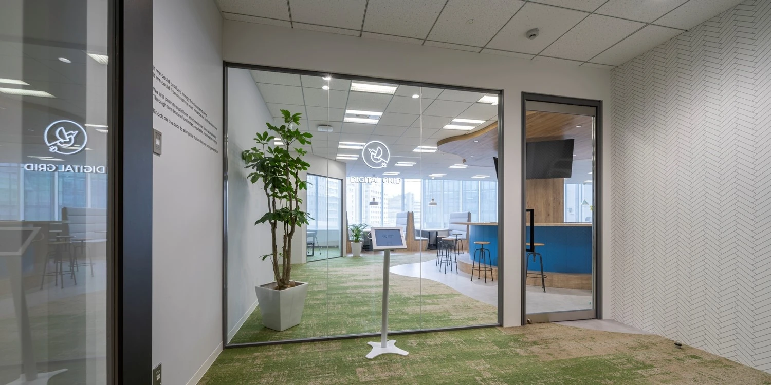 事業拡大を進める中でのご移転プロジェクトをお手伝いしました。コロナ禍ということもあり、「出社することに意味がある空間」「コミュニケーション活性化」を目的に、社員にとって戻ってきたくなる場所となるよう「Perche -止まり木-」というコンセプトの元、オフィスをデザインしました。エントランスはガラス張りにし、ガラス面にデジタルグリッド様の事業でもある電力を表現した発光サインを設置。入ってすぐの場所にシンボルとなる「デジグリの木」というビッグカウンターを置き、コミュニケーションポイントとしました。ワークスペースにはできるだけ壁を立てず、開放感を出すとともにコミュニケーションを取りやすいよう工夫しています。床はタイルカーペットのグラデーション貼り分けや曲線での施工を設えたほかオリジナルで製作した家具は色味を統一するなど、デザイン面でも多くのこだわりがあるオフィスです。