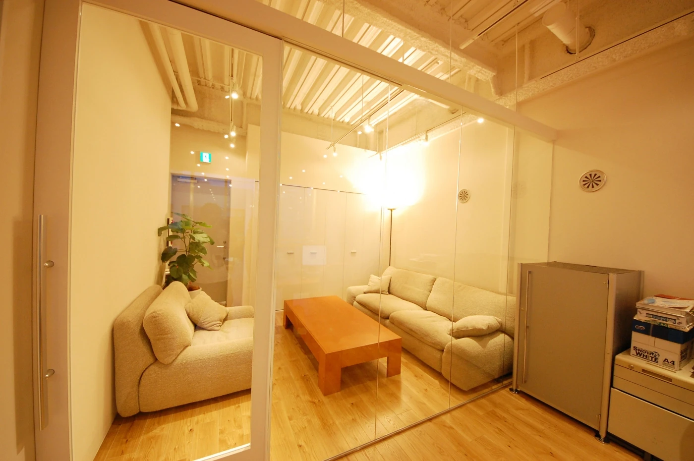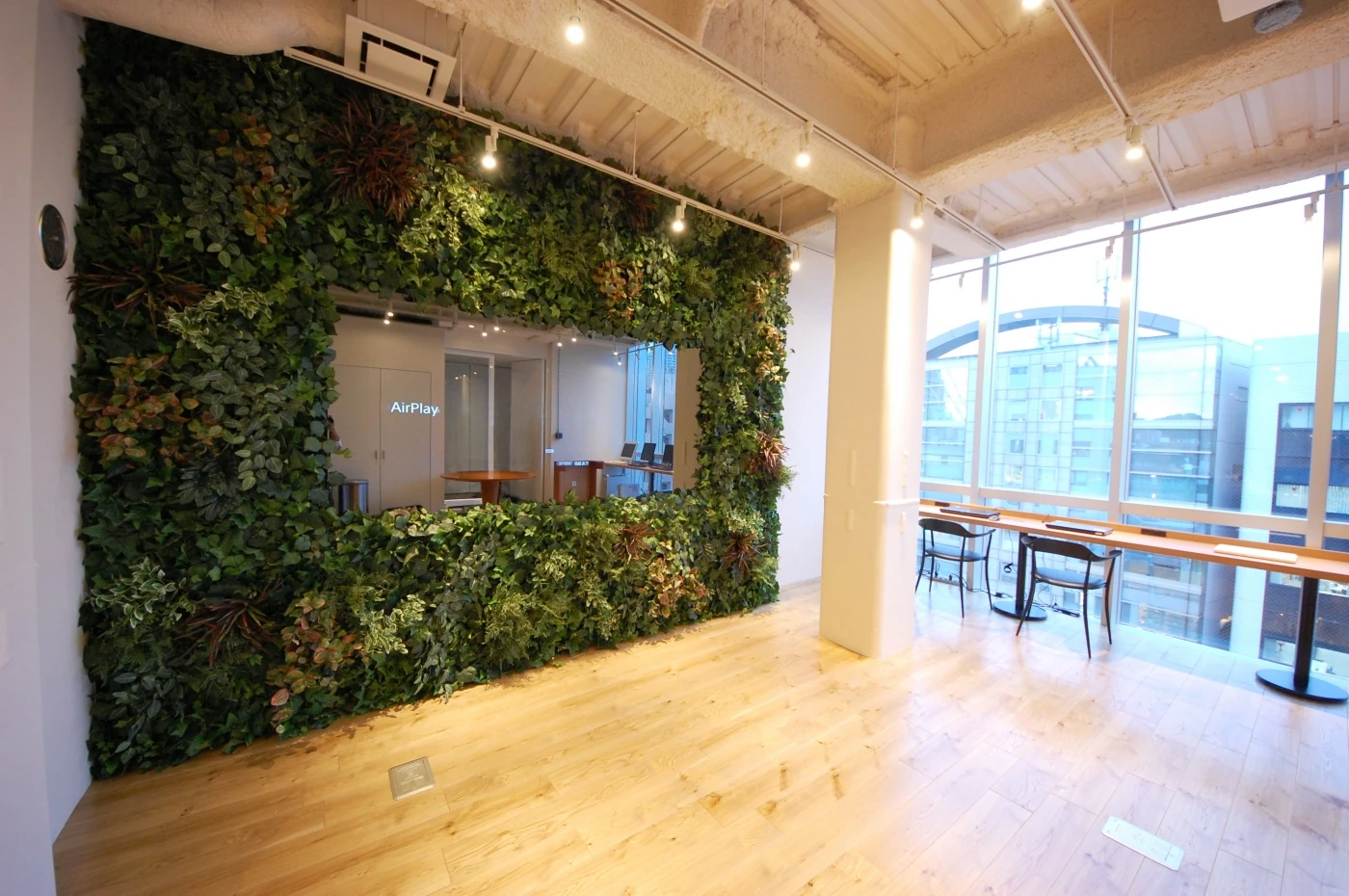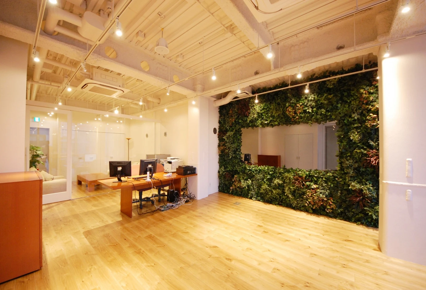 シンプルで上品な、飽きのこない空間を目指しました。オフィス正面のモニター付グリーンウォールは、プレゼンテーションや、ミーティング、さらには、シアターとして使用可能なスペースです。また、木目と白い塗装壁で温かみを感じると共に、間仕切りをガラスにすることで、限られた空間の中に解放感をプラス。大窓を活かしたカウンターデスクは、電源とLANを完備し、使うシーンを選ばないエリアになりました。スケルトン天井という武骨さを活かしつつ、質感のある素材を用いることで、暖かく親しみのあるオフィスが完成しました。