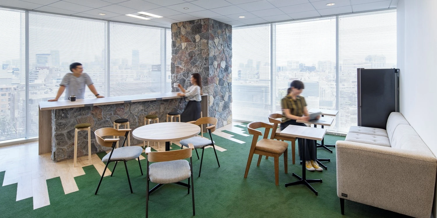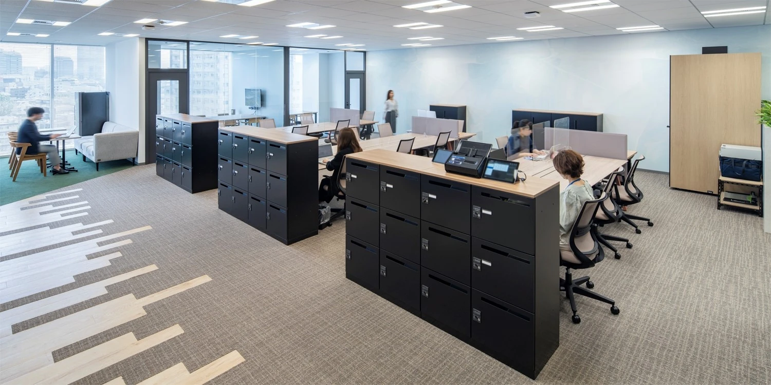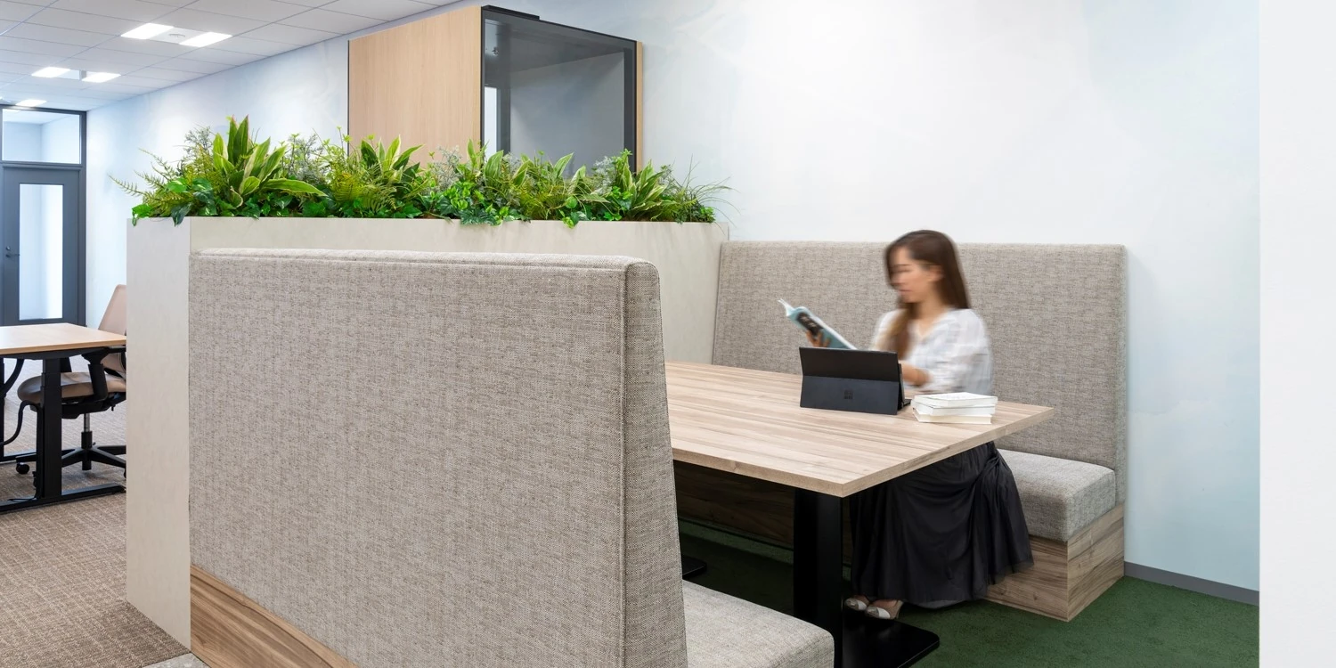 HyLife Pork Japan(ハイライフポークジャパン)様の成長に伴うご移転プロジェクト。活発にコミュニケーションを取れること、わくわくする空間かつレストラン「代官山ハイライフポークテーブル」のようににぎやかで明るいイメージをオフィスで実現することを目指し、コンセプトは「HyLife Park」としました。「Park」の明るくさわやかな雰囲気を演出するため、受付ベンチはグリーンと木目のデザインを基調としたナチュラルなデザインに。エントランスの受付カウンターにはタイルを貼って楽しさを演出し、ワークスペースの壁は空をイメージしたクロスを採用しました。働き方に合わせてシーンを選ぶことができるレイアウトで、自席での集中した作業、創造的なチームミーティング、リフレッシュとメリハリをつけやすく、ゾーンごとに床を貼り分けることで視覚的にもわかりやすくしました。リラックスしながらコミュニケーションも活性化する工夫をオフィス内に散在させています。