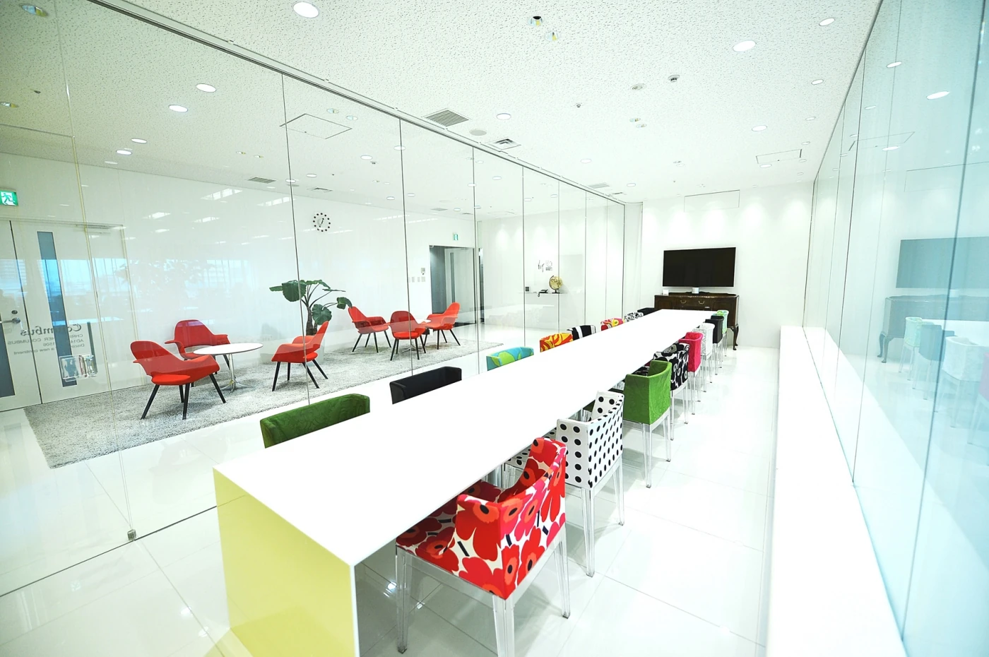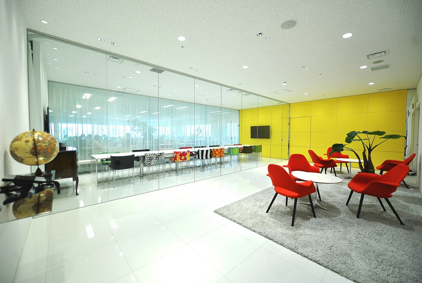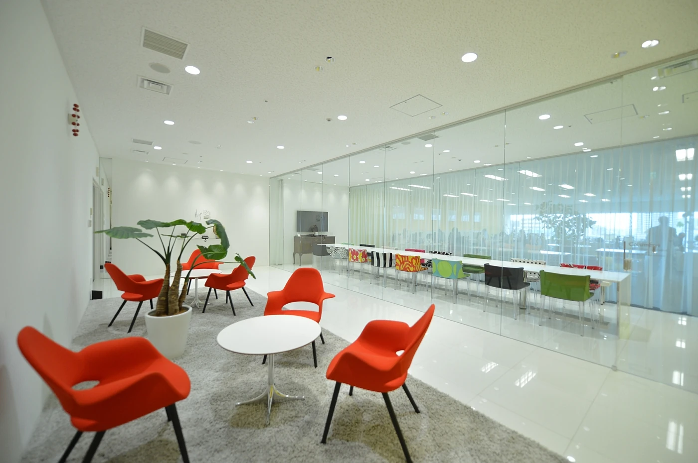 エントランスは、ガラスの間仕切りで、会議室との繋がり感を演出。「おもてなしや偶発的な出会い」を演出するホテルロビーの要素をエントランスに取り入れることで、コミュニケーションや企業ブランドイメージの向上、感動を提供する"魅せるオフィス"を実現しました。