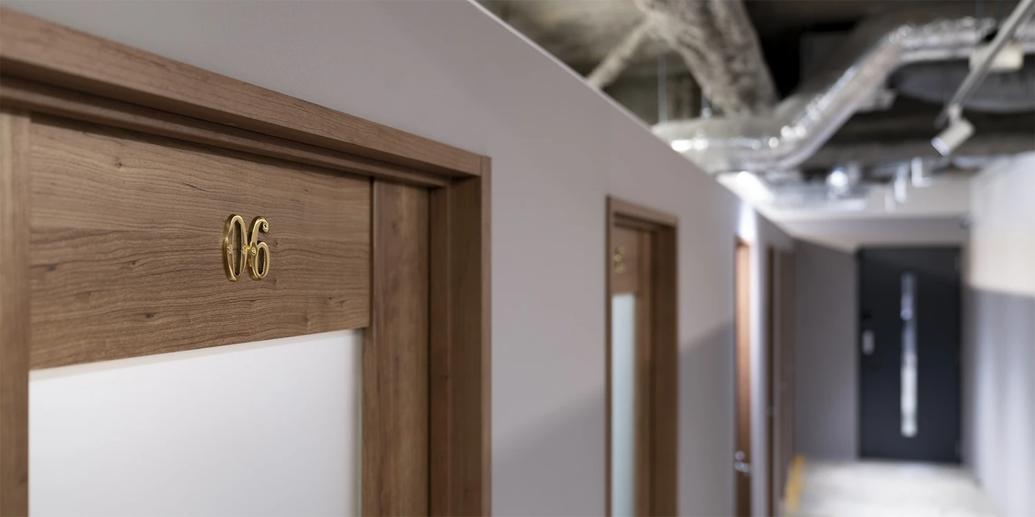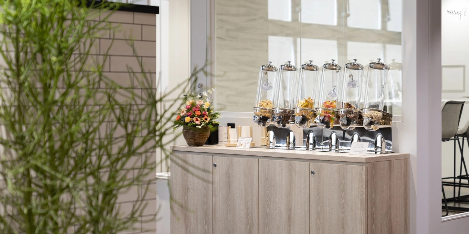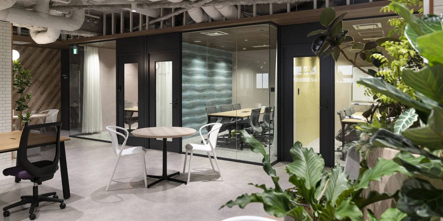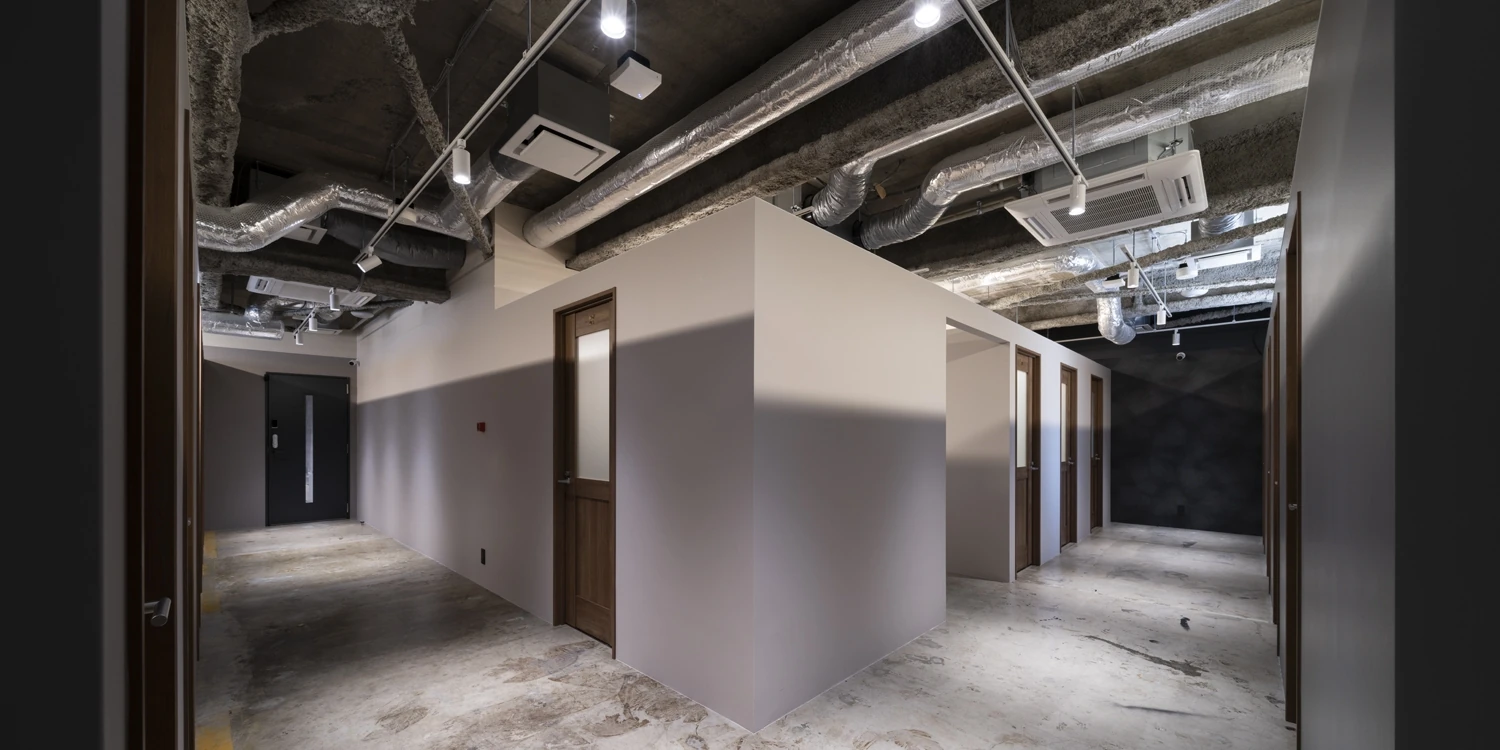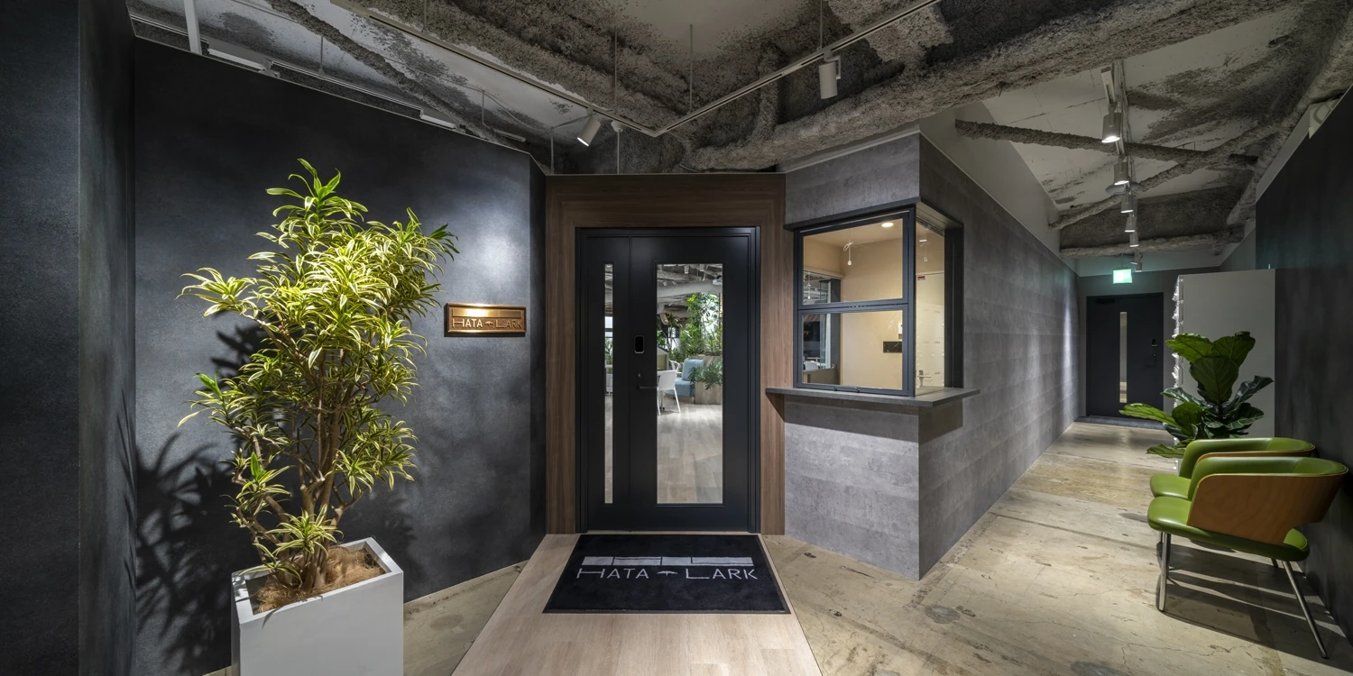 自社ビルの倉庫として使用していたフロアをコワーキングスペース『HATA-LARK』としてリニューアルしたプロジェクト。フロア内には1名から使用できるレンタルオフィス、コワーキングエリア、会議室、キッチンスタジオなど様々なユーザーの使用を想定したスペースを複数設けました。ビジネスユーザーの使用だけでなく、地域に根ざした場所になるようキッチンスタジオも企画、設計しています。室内にはグリーンを各所に設置しており、リラックスして自分らしく働くことができるとともにユーザーの自然発生的なコミュニケーションを促します。会議室はアクセントクロスで空間に遊び心を取り入れ、明るい雰囲気に。廊下は元々あった床の風合いを活かし、部分的にモルタル以外の素材を用いて空間にリズムをつけました。シェアオフィスのサインには真鍮色のものを用い、特別感を出しています。お店のコンセプトをオフィスデザインで形にしたほか、今回はシンボルロゴやカラーリング、看板、マットのデザインまで一緒に製作しており、デザインの統一を通してブランディング構築をお手伝いしました。