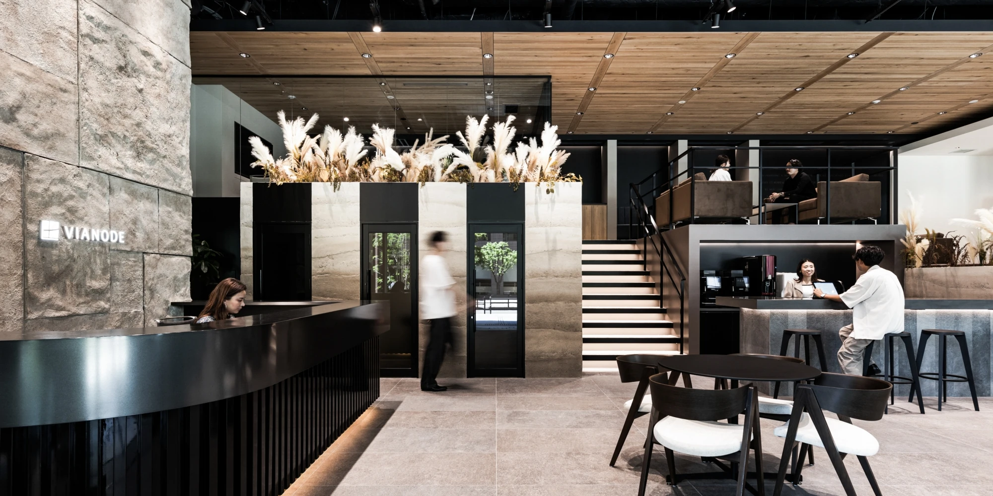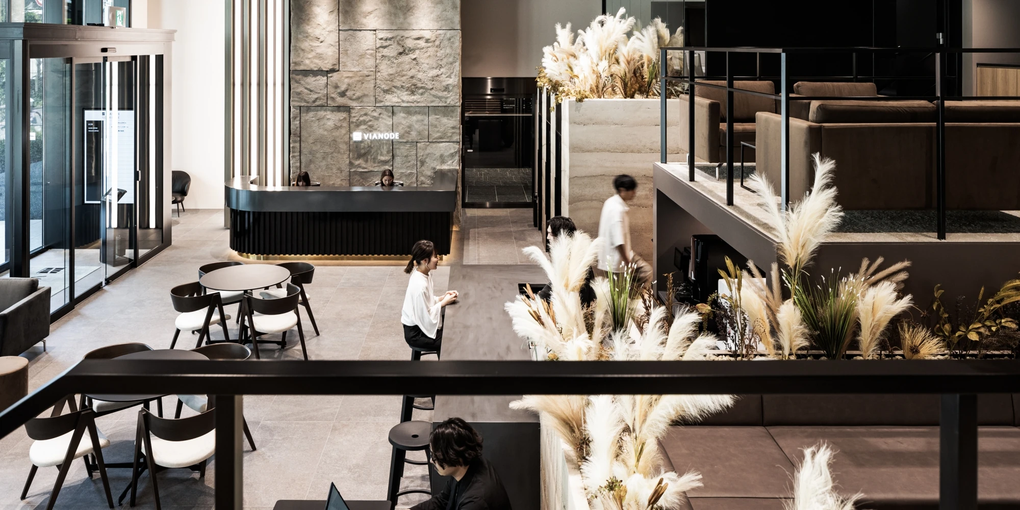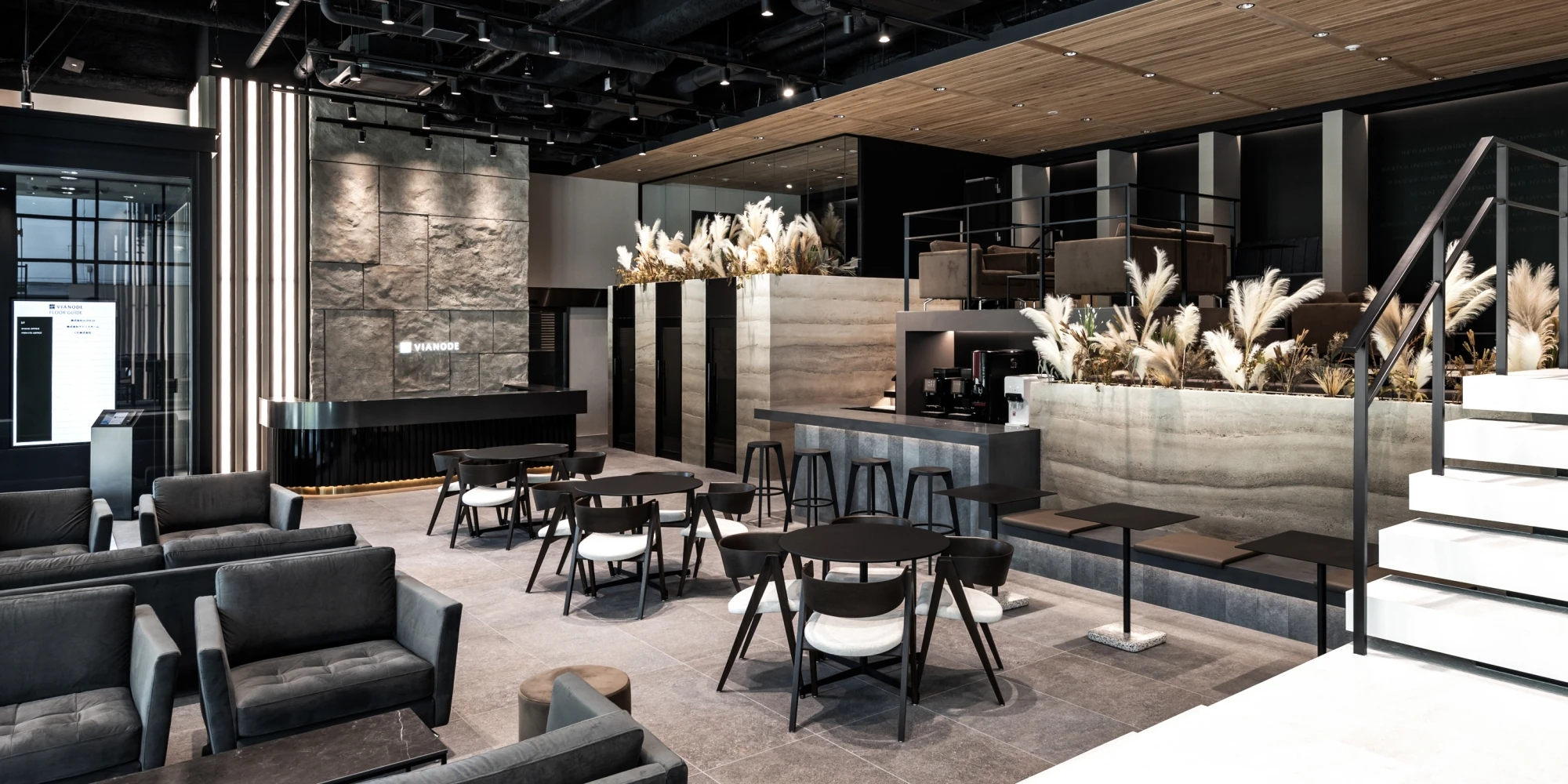 「Vianode SHIN-OSAKA(ヴィアノード新大阪)」は、大和ハウス工業様が手がけるオフィスビル。新築ビル11階建てのうち1階を入居者が共用で利用可能なビジネスラウンジ、3階をシェアオフィスにし、ビル入居者の利便性向上、ビルの利用価値向上を目的に設計・デザインしました。デザインコンセプトは『Villa(ヴィラ)』。“日常の中の非日常”を体感することを最大のゴールに、「その場所で体験できる価値」をいかにデザインの力で高めるかを軸に空間構成を行いました。“非日常”から導いたキーワード「ワーケーション」や「リゾート」をテーマに、1階ビジネスラウンジは天井高約6mの広々と開放的な空間を活かし、スキップフロアを採用。壁面には地層を連想させる意匠を施し木目天井のディティールにもこだわりました。人と人とのリアルなコミュニケーションを後押しするため、それぞれの業務内容に合わせて選べる多様な環境を用意しています。3階は、シェアオフィス契約者様専用スペースとし、約210坪(700平方メートル)のスペース内に、1名用の半個室を30室、1〜8名用の完全個室を27室用意しました。人数や企業の成長フェーズに合わせて場所を選ぶことができます。ビル一棟でのABWを実現し、洗練された知的創造性を高めるデザイン空間を提供しています。