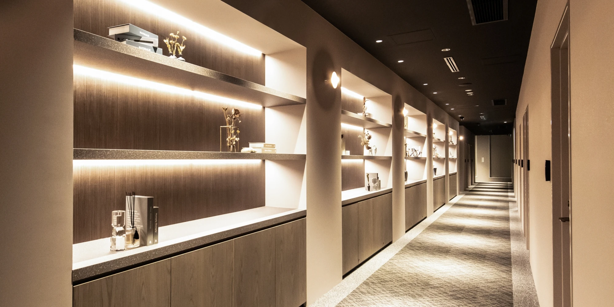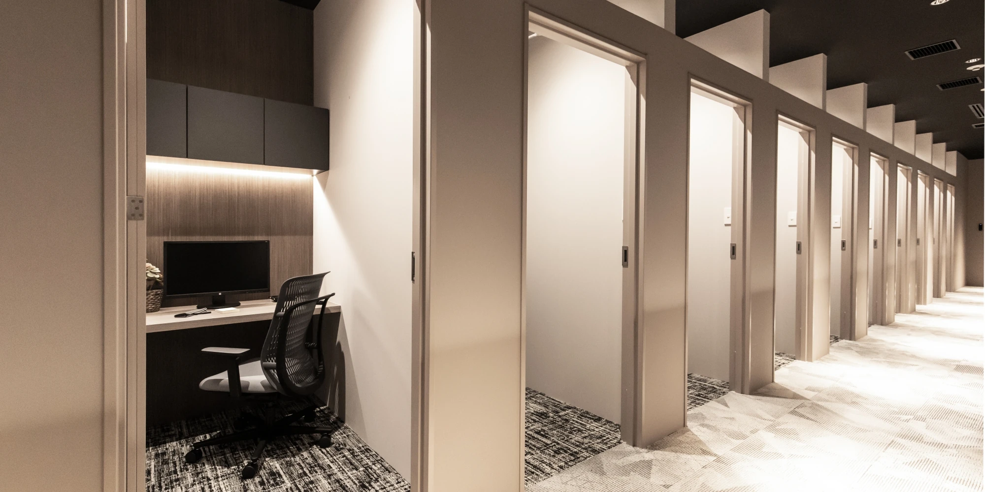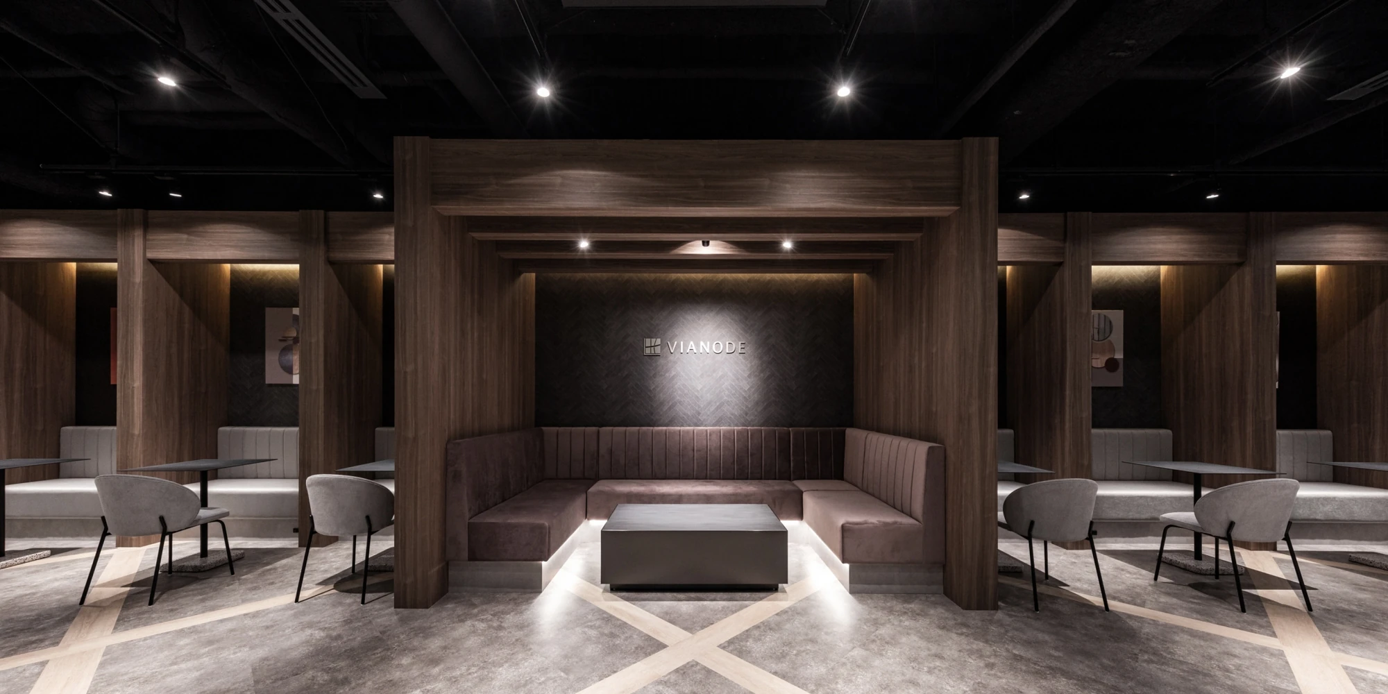 「Vianode SHIN-OSAKA(ヴィアノード新大阪)」は、大和ハウス工業様が手がけるオフィスビル。新築ビル11階建てのうち1階を入居者が共用で利用可能なビジネスラウンジ、3階をシェアオフィスにし、ビル入居者の利便性向上、ビルの利用価値向上を目的に設計・デザインしました。デザインコンセプトは『Villa(ヴィラ)』。“日常の中の非日常”を体感することを最大のゴールに、「その場所で体験できる価値」をいかにデザインの力で高めるかを軸に空間構成を行いました。“非日常”から導いたキーワード「ワーケーション」や「リゾート」をテーマに、1階ビジネスラウンジは天井高約6mの広々と開放的な空間を活かし、スキップフロアを採用。壁面には地層を連想させる意匠を施し木目天井のディティールにもこだわりました。人と人とのリアルなコミュニケーションを後押しするため、それぞれの業務内容に合わせて選べる多様な環境を用意しています。3階は、シェアオフィス契約者様専用スペースとし、約210坪(700平方メートル)のスペース内に、1名用の半個室を30室、1〜8名用の完全個室を27室用意しました。人数や企業の成長フェーズに合わせて場所を選ぶことができます。ビル一棟でのABWを実現し、洗練された知的創造性を高めるデザイン空間を提供しています。