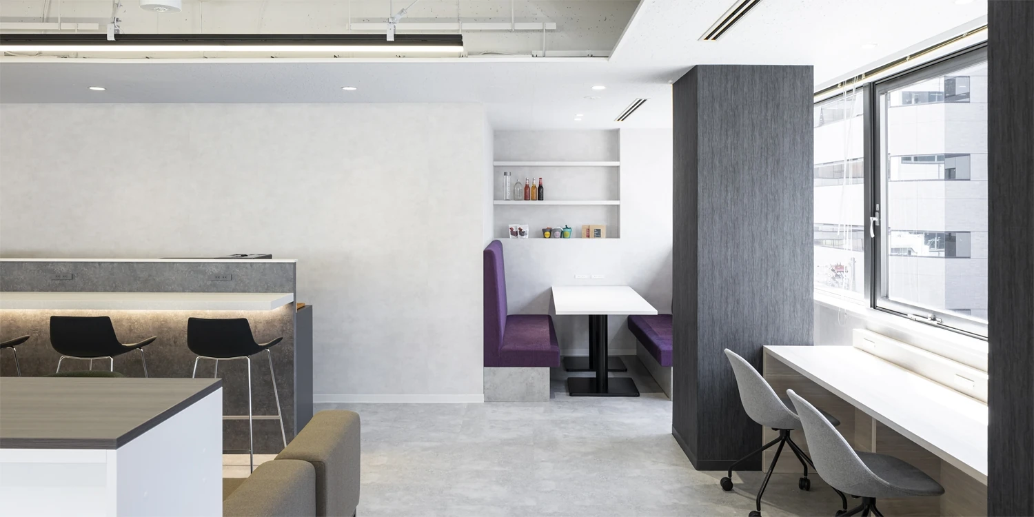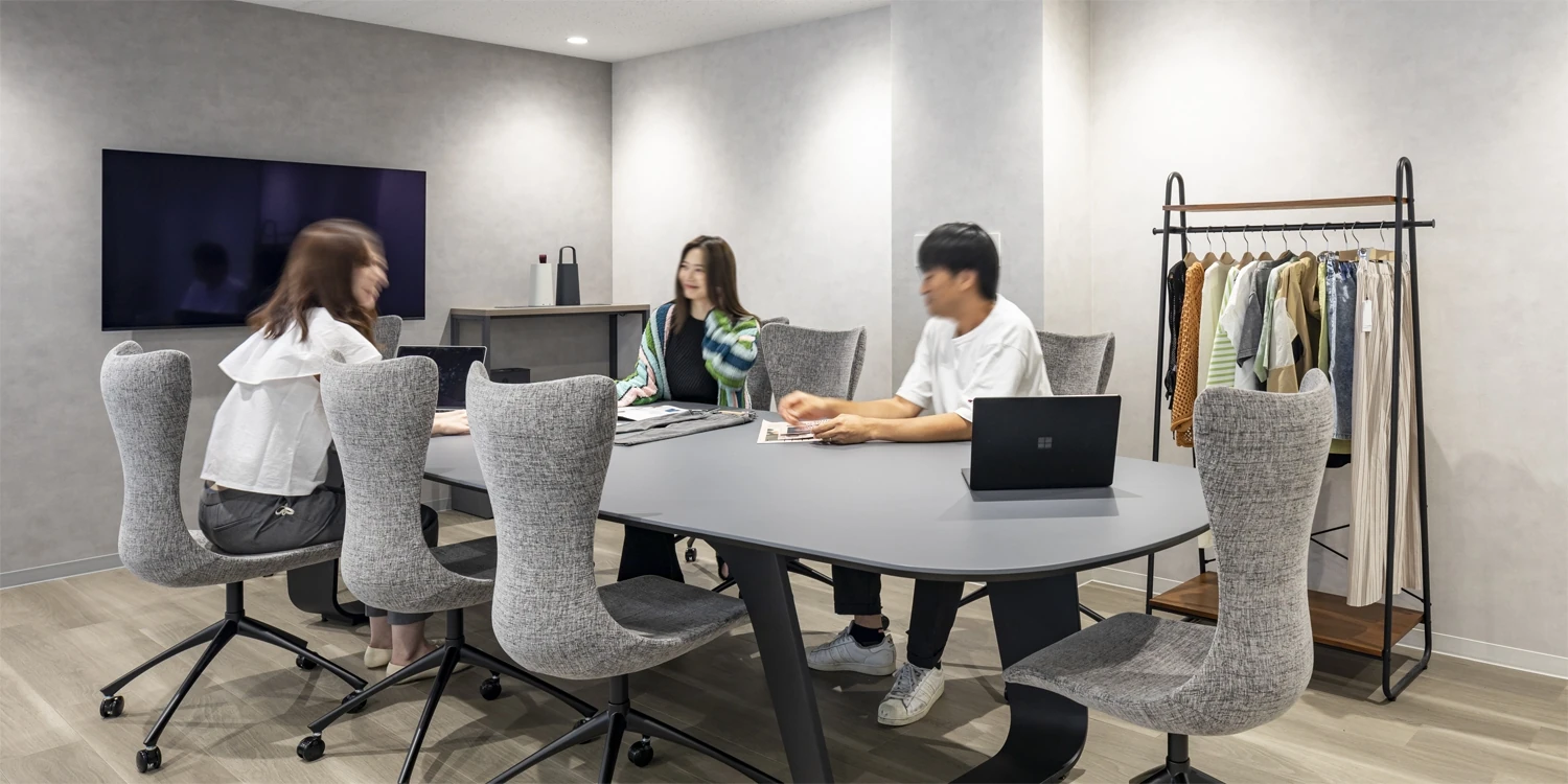 2つの事業部署で一つの空間を使うとのことで、「部署間のコミュニケーション」「商品の魅せ方」「開放感」「スタイリッシュさ」これらに注目し、オフィスをデザインしました。エントランスにはカジュアルなフリーエリアを設け、来客の方にもオープンな雰囲気が伝わるよう演出しています。スケンルトン天井と会議室の壁にガラスを用いることで限られたスペースの中でも開放感のある空間を目指しました。ワークスペース内にはソファやカウンタースペース等を設置し、場面に合わせた働き方ができるようレイアウトを工夫しています。ベースとなる空間は白を基調としたスタイリッシュな見た目にし、デスクやチェアなどオフィス内の家具をポイントカラーで配色しました。服飾を扱う企業のファッショナブルなセンスを表現しています。