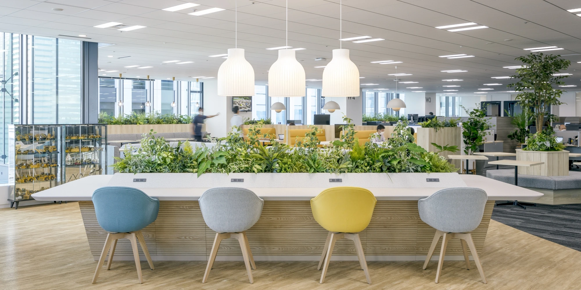 多様な働き方の実現・出社やコミュニケーションの価値を感じられることを目的としたオフィス改装をお手伝いしました。テレワークを併用しているため、出社時にその日の仕事内容や気分によって働く場所を選べるよう用途ごとに複数のエリアをつくりました。エリアの区切りは床の張り替えや家具の色味を変えることで表現し、リフレッシュスペース・ワークスペース・集中スペースとそれぞれメリハリを効かせたデザインになっています。エントランスの壁面・造作カウンターにはモルタルを使用し、重機を扱うクールなイメージを表現しました。また、窓際に設けたリフレッシュスペースはキャタピラージャパン様のコンセプトカラーであるイエローを多用し、明るく開放的な雰囲気を演出しています。メリハリが効いた中につながりを感じられる、社員の皆さまの働きやすさを第一に考えたオフィスとなりました。