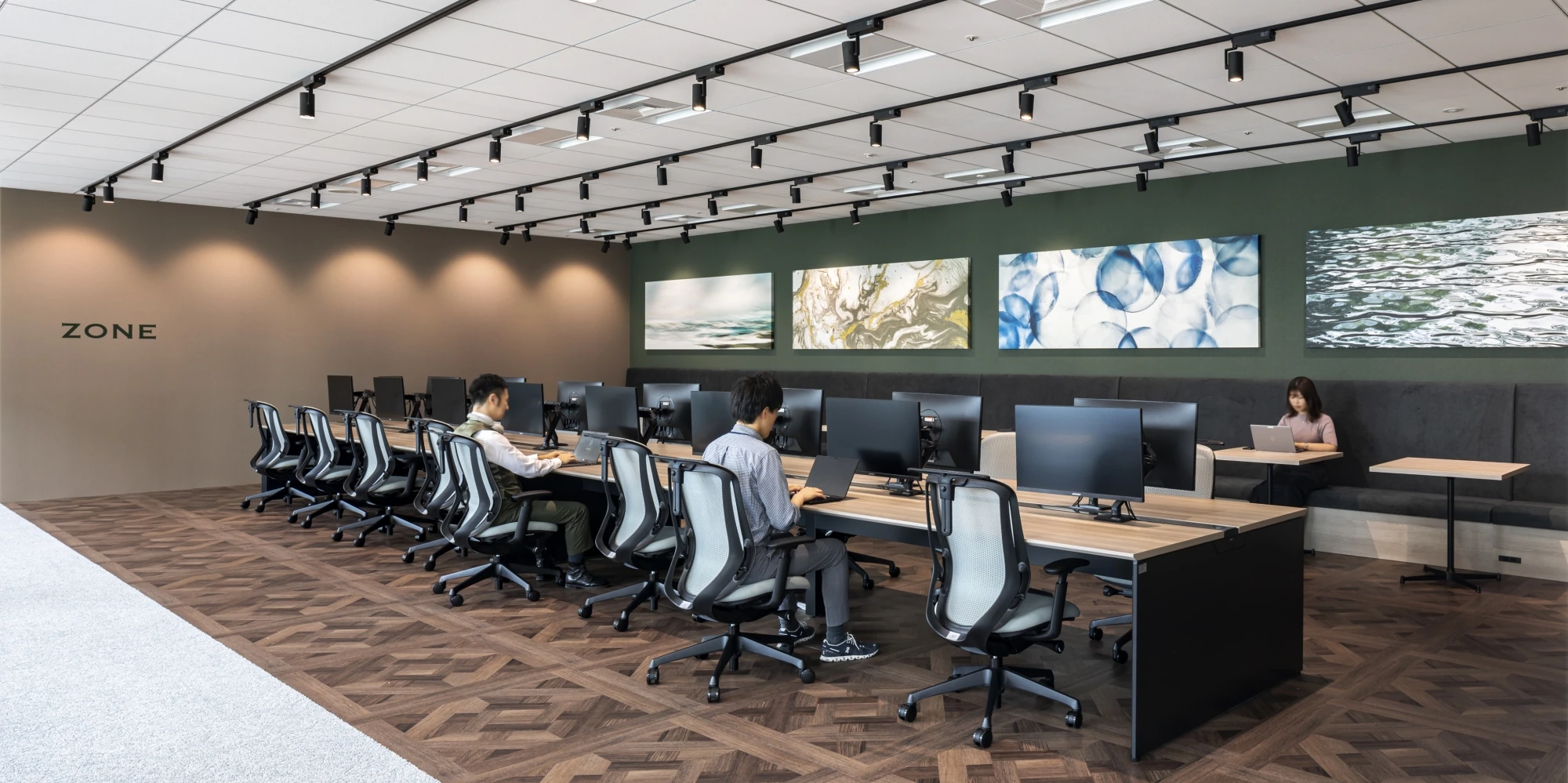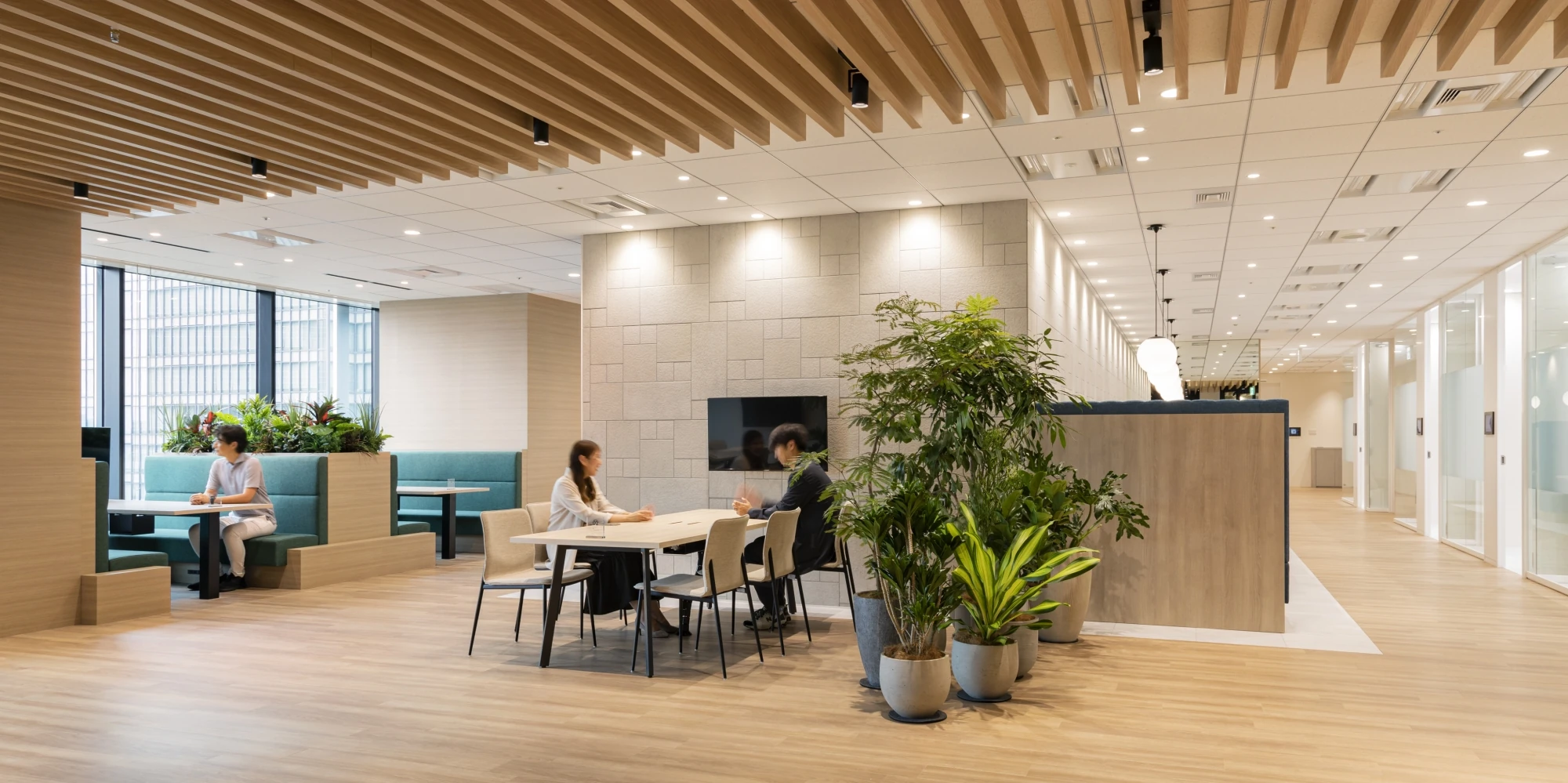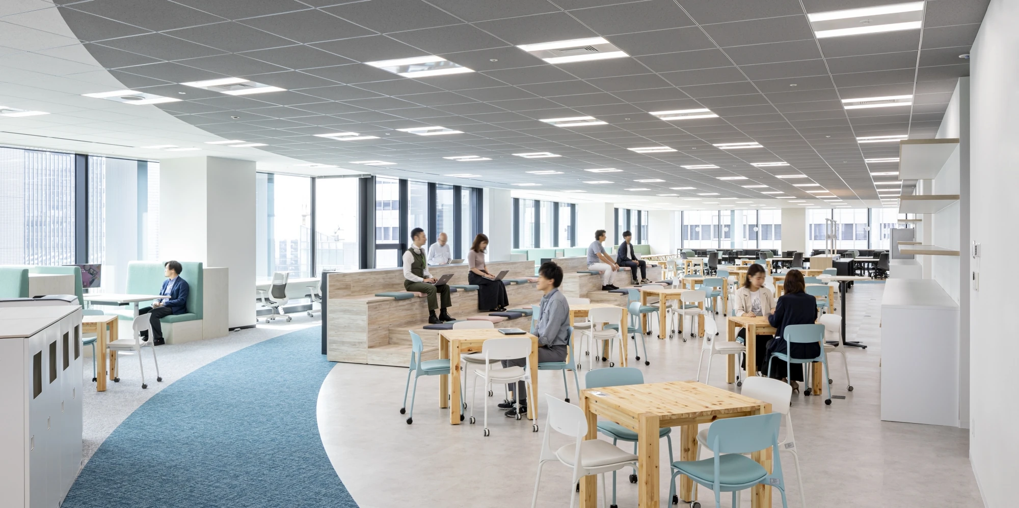 新オフィスのコンセプトは「CIRCLE FOREST」。社員同士やお客様、関係会社様などとのコミュニケーションが活性化されることを第一に考え、執務室内はコミュニケーションが自然発生するようワンフロアで回遊しやすい導線計画、家具配置としました。デザインはコンセプトに合わせて「水」や「森」を連想できる色使いと曲線を取り入れ、特にエントランス、商談エリアは、植栽と木目を中心とし訪れたお客様にとっても気持ち良く感じられるお出迎え空間となっています。ワークスペースでは新たにフリーアドレスを導入し、社員が自ら働く場所を選択し、生産性の向上とイノベーションの創出を図ることができるよう各種ワークデスクを設けました。窓際にはソロワークから打ち合わせまで様々な使い方ができるソファスペースや個室型ワークブース、カウンター席などを設置。コラボレーションエリアは大型モニターやひな壇を設置し、社員同士のコミュニケーションにとどまらず社外とのコラボレーションも想定したスペースとしました。