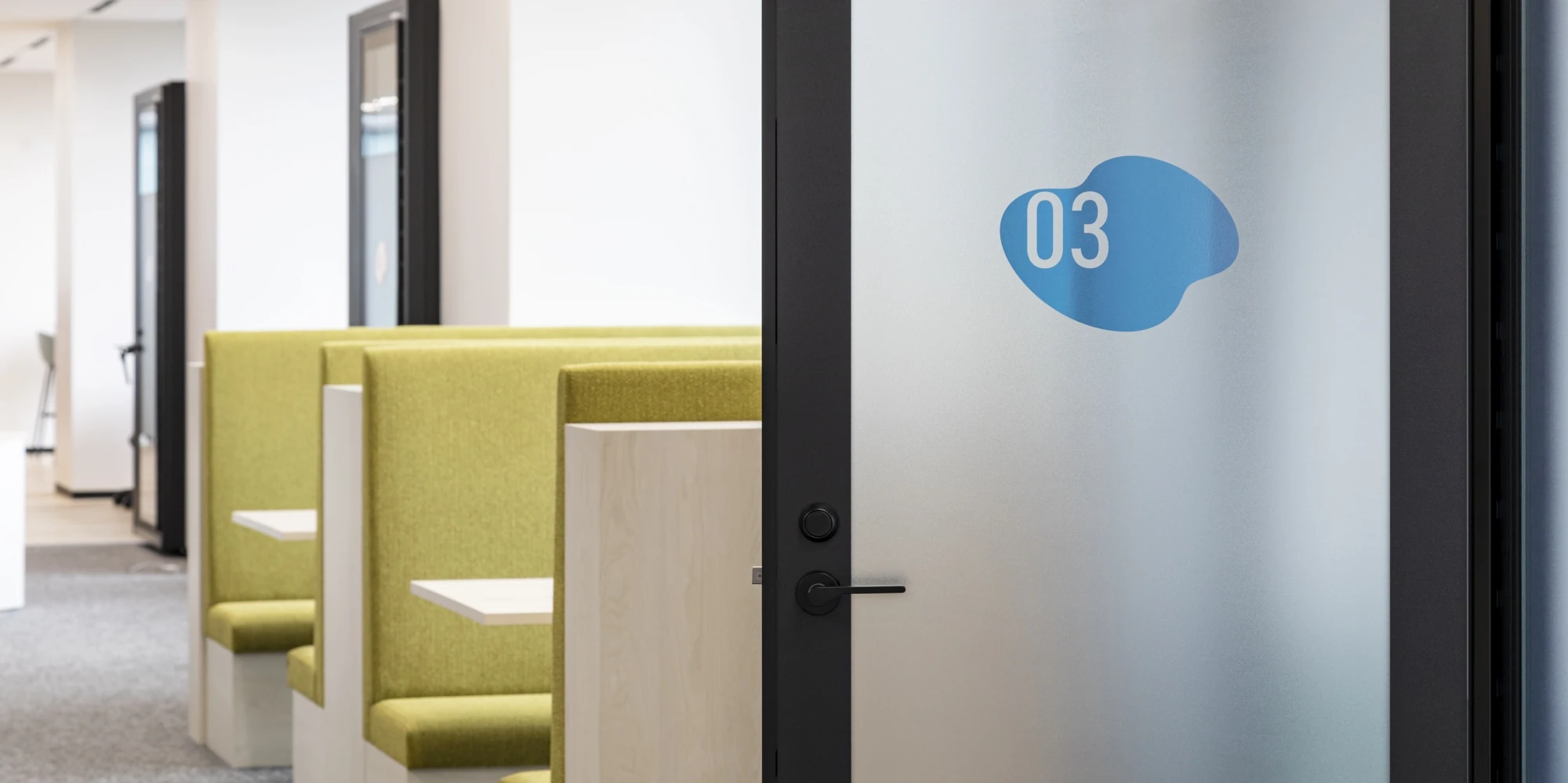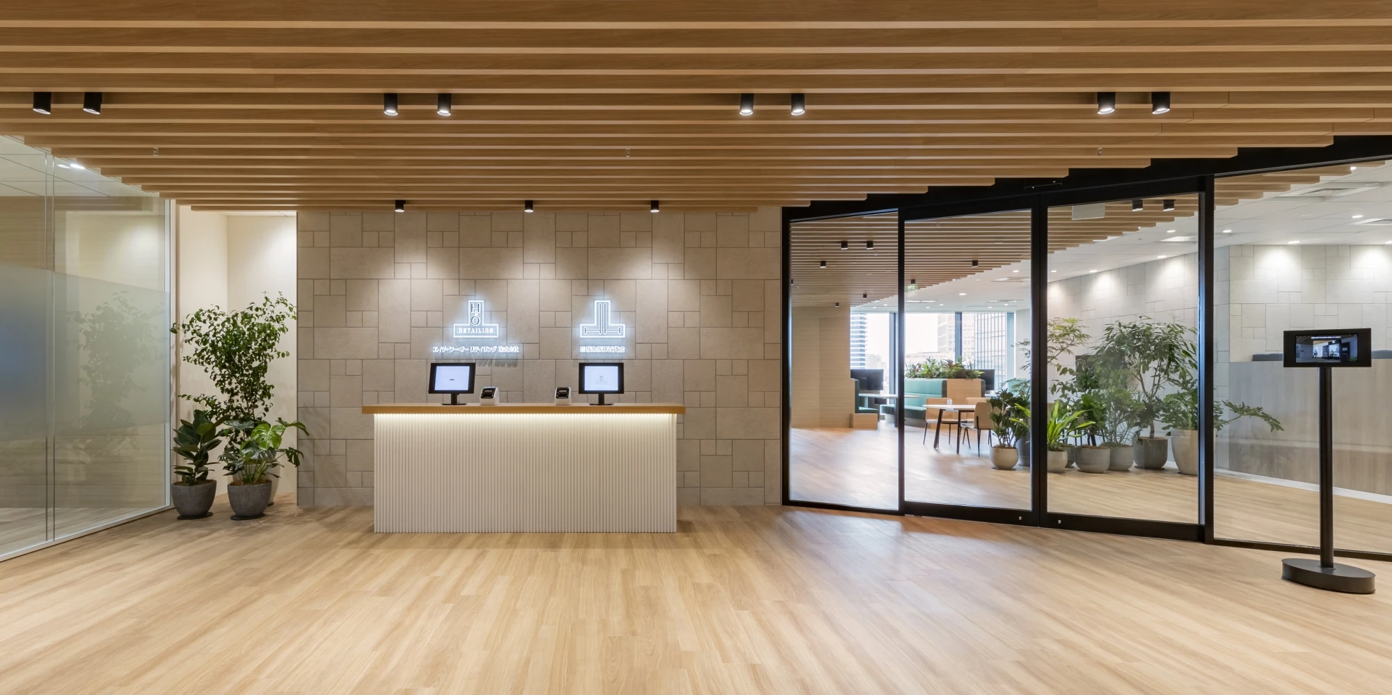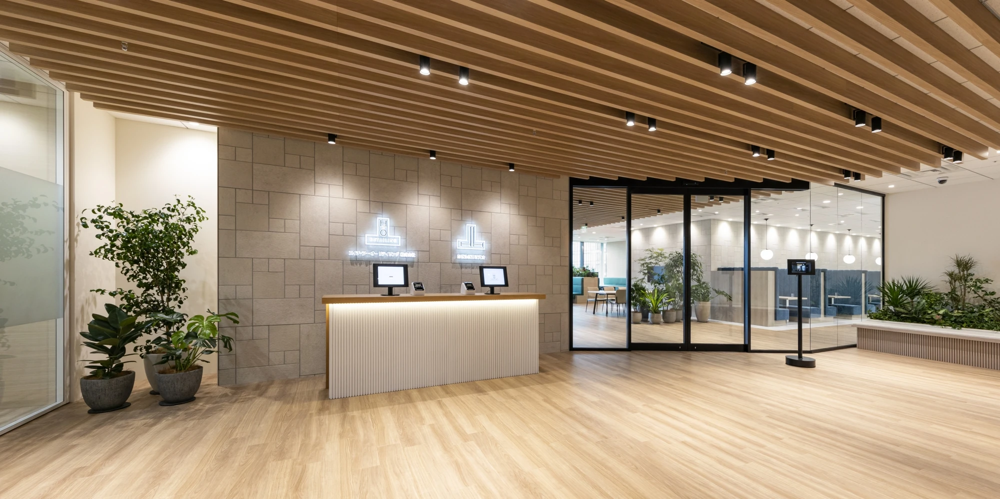 新オフィスのコンセプトは「CIRCLE FOREST」。社員同士やお客様、関係会社様などとのコミュニケーションが活性化されることを第一に考え、執務室内はコミュニケーションが自然発生するようワンフロアで回遊しやすい導線計画、家具配置としました。デザインはコンセプトに合わせて「水」や「森」を連想できる色使いと曲線を取り入れ、特にエントランス、商談エリアは、植栽と木目を中心とし訪れたお客様にとっても気持ち良く感じられるお出迎え空間となっています。ワークスペースでは新たにフリーアドレスを導入し、社員が自ら働く場所を選択し、生産性の向上とイノベーションの創出を図ることができるよう各種ワークデスクを設けました。窓際にはソロワークから打ち合わせまで様々な使い方ができるソファスペースや個室型ワークブース、カウンター席などを設置。コラボレーションエリアは大型モニターやひな壇を設置し、社員同士のコミュニケーションにとどまらず社外とのコラボレーションも想定したスペースとしました。