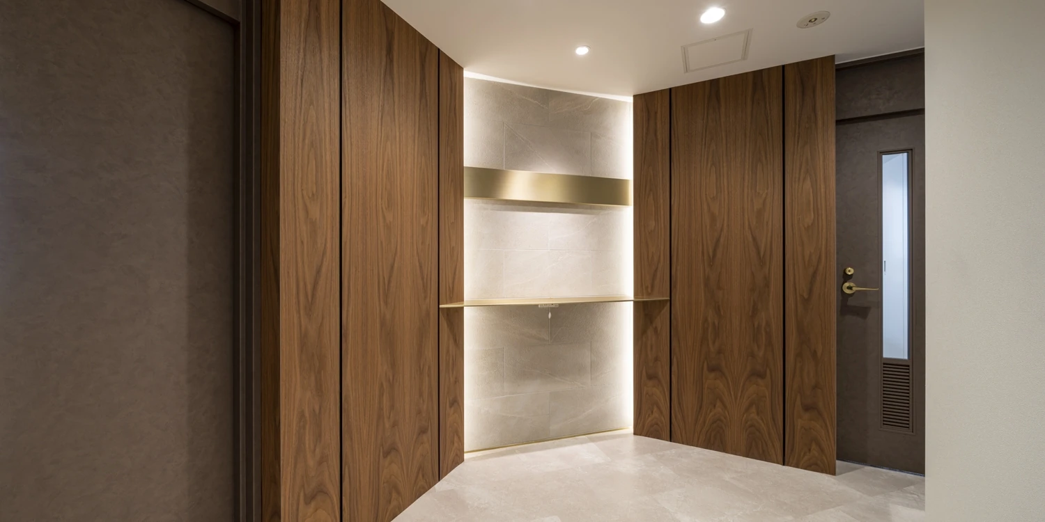 築40年を経過した銀座槙町ビルのバリューアッププロジェクト。ビルのファサード(外観)リニューアルに続いて3階・9階のセットアップオフィスをデザインしました。ファサードと同様ブロンズの色味や素材を使い、デザインテイストを統一しています。一方で3階はオフィス什器あり、9階はオフィス什器なしとし、照明計画もフロアごとに変えてより柔軟にテナント誘致をしやすい仕様としました。執務室内にドライパントリー、打合せブース、WEBミーティングブース、窓向きカウンターを集約し、入居者の多様な働き方をサポートします。