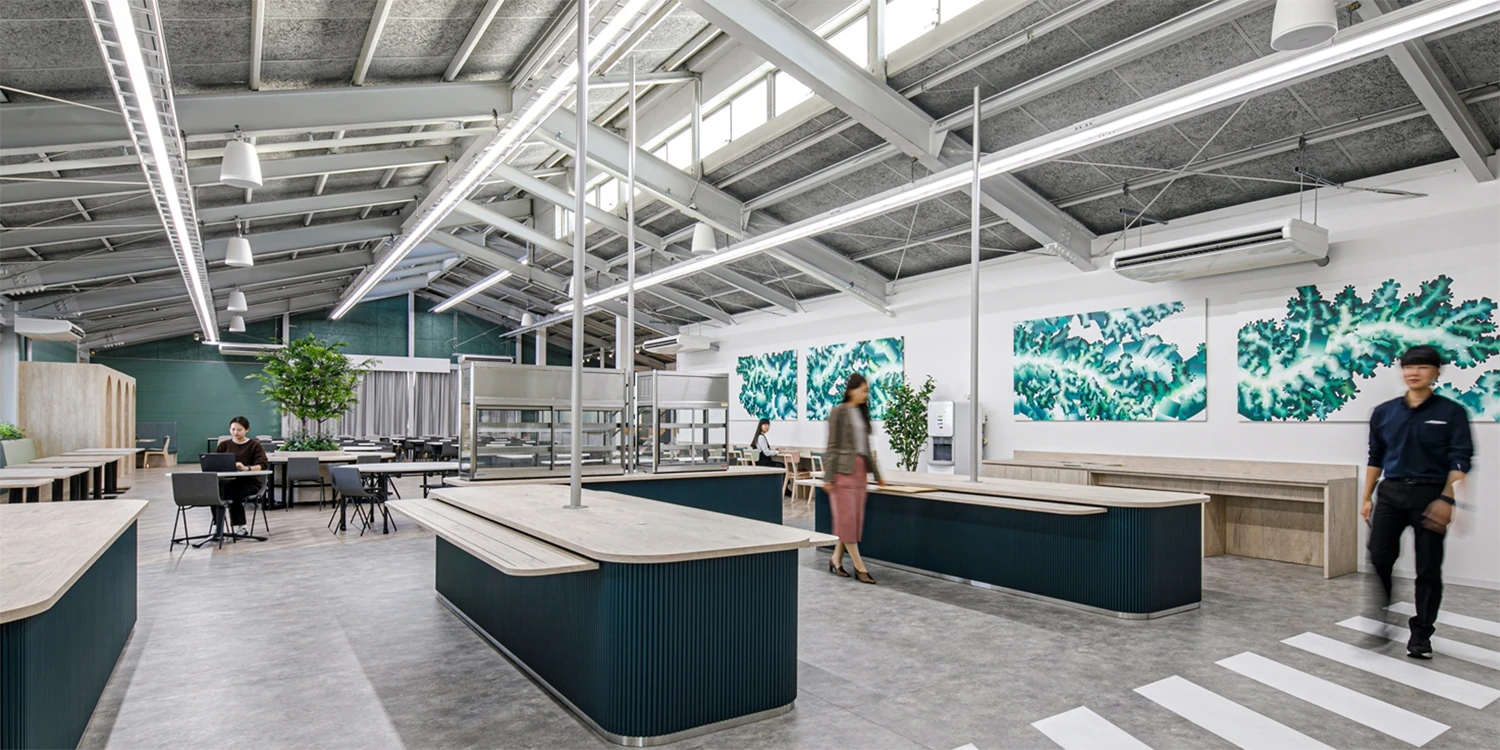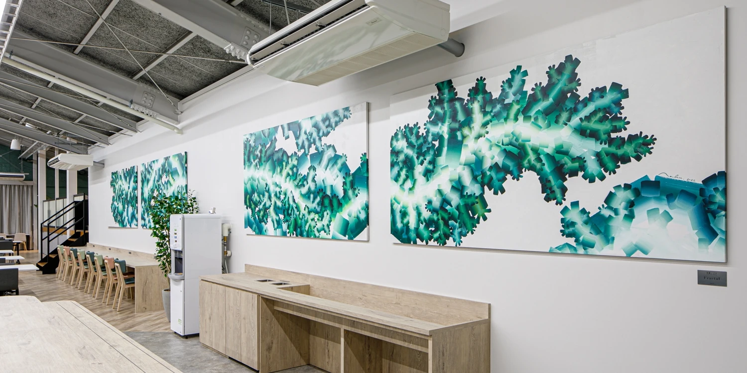 全体コンセプトは『Promenade』。敷地全体を遊歩道に見立て、散歩するように気分に合わせて自ら働き方や心地良い場所を選んで働くことができ、食堂はその散歩道の途中にある公園のような憩いと出会いの場です。創立90周年を目前にし、未来に繋がる場所・会社のビジョン共有の場として、「展望」「眺望」の意味がある『VISTA』と食堂を名付けました。未来への広がりをイメージした絵『fractal』を飾っています。自然界に多く存在する同じ構造の繰り返しをモチーフにした抽象画で、連綿と続くアイセロ様の歴史や未来への繋がりを表現しています。