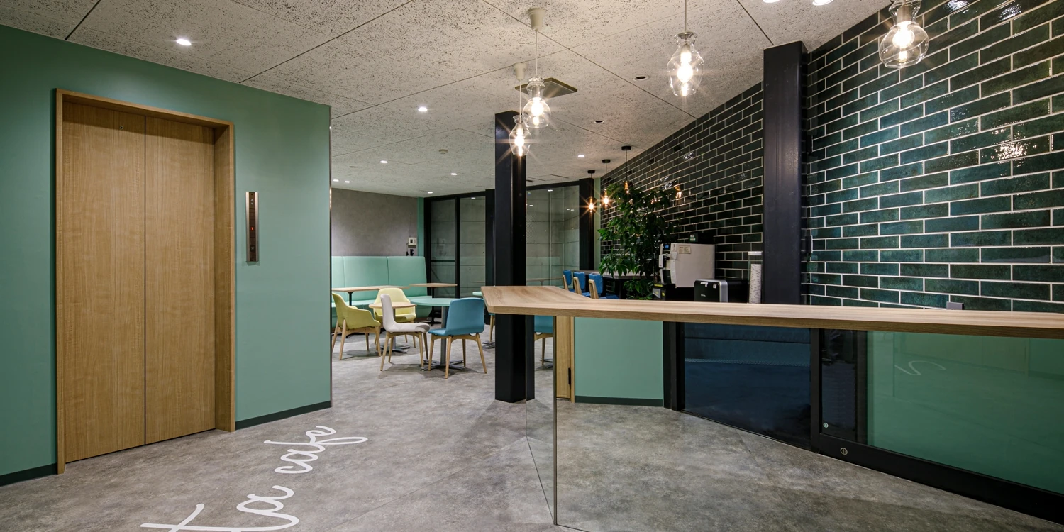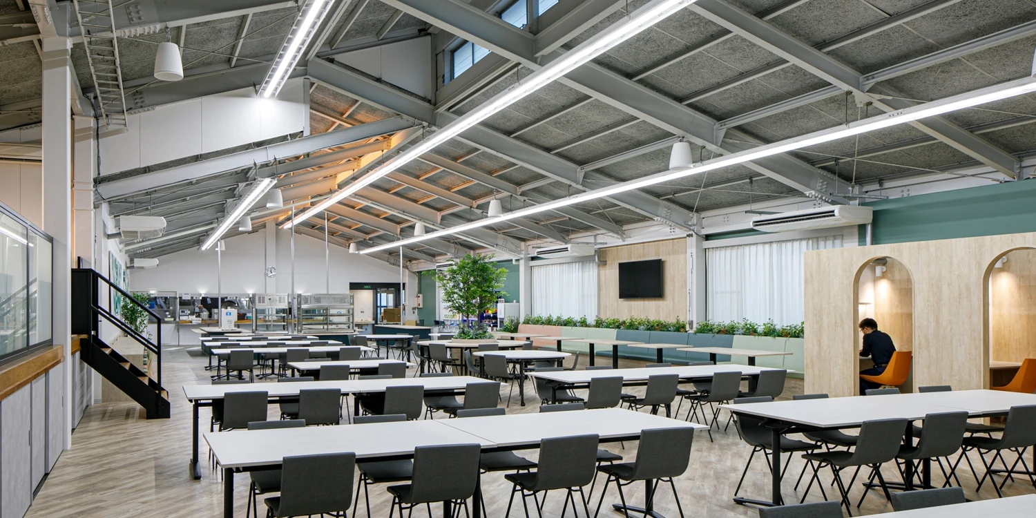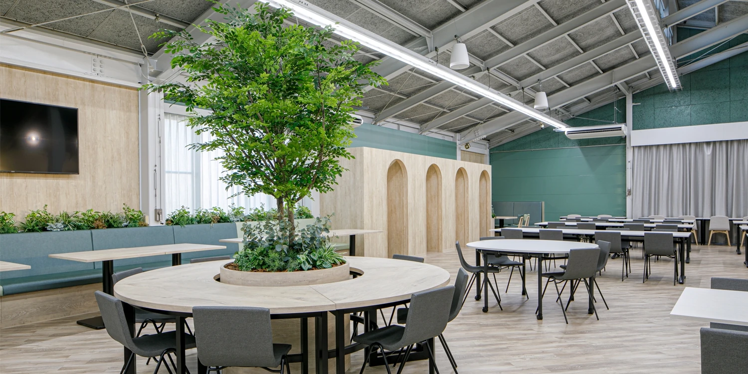 本社食堂の改装プロジェクト。アイセロ様のオフィスで最も多くの人が集まる中心となる場所で、これまでは食事と社内行事のみでの使用でしたが、仕事やコミュニケーションでも使用できる空間にリニューアルしました。