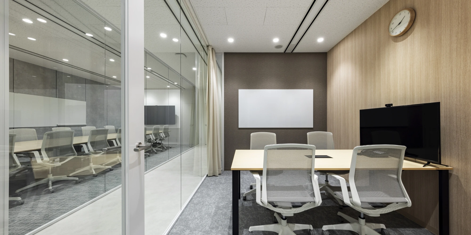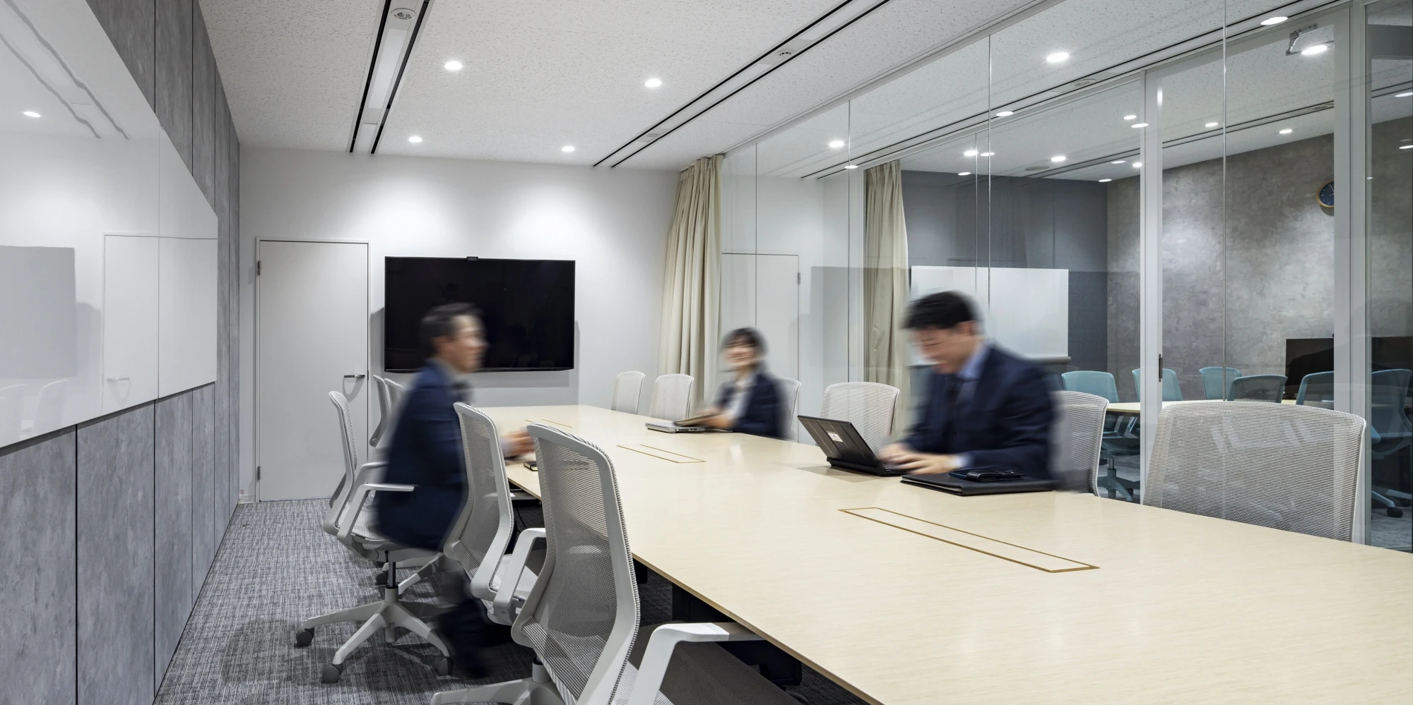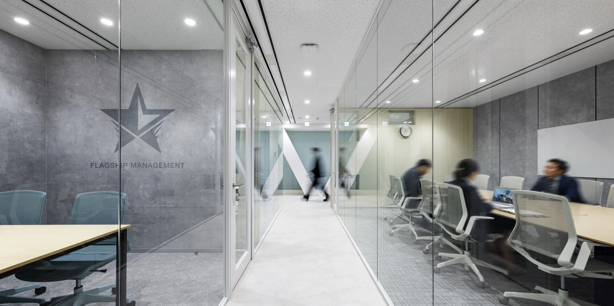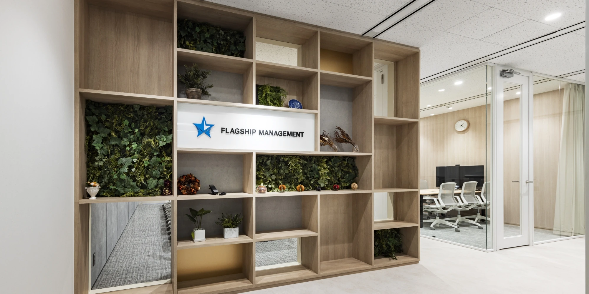 約2年前に続き、今回もオフィス移転をお手伝いしました。前回のオフィスコンセプト「Route of Gold」を今回もオフィスプランに反映。日本一の中小企業診断士事務所を目指すフラッグシップ経営様のステップアップにつながるオフィスをデザインしました。エントランスは複数の棚をオリジナルで設置し、資格関係の掲示はもちろん、お客様にてシーズンに合わせてカスタマイズできるフレキシブル性を確保。ガラスを取り入れて奥行きを演出しました。会議室の壁面にはオリジナルのサインをダイナミックにデザインし、採用や取材などの企業PRで企業ブランドを発信できる特別な部屋へと仕上げました。オフィスには全体的に木目やグリーン、モルタルをデザインに取り入れることでスタイリッシュな空間イメージを表現しており、来社したお客様にも安心感や信頼感を持っていただくことができます。