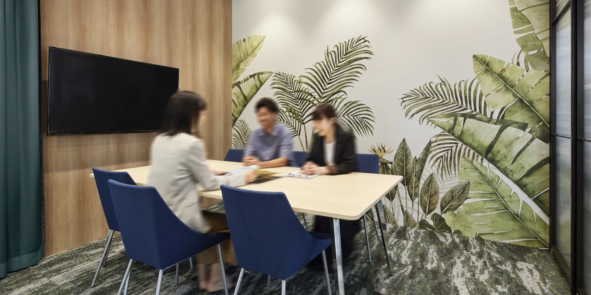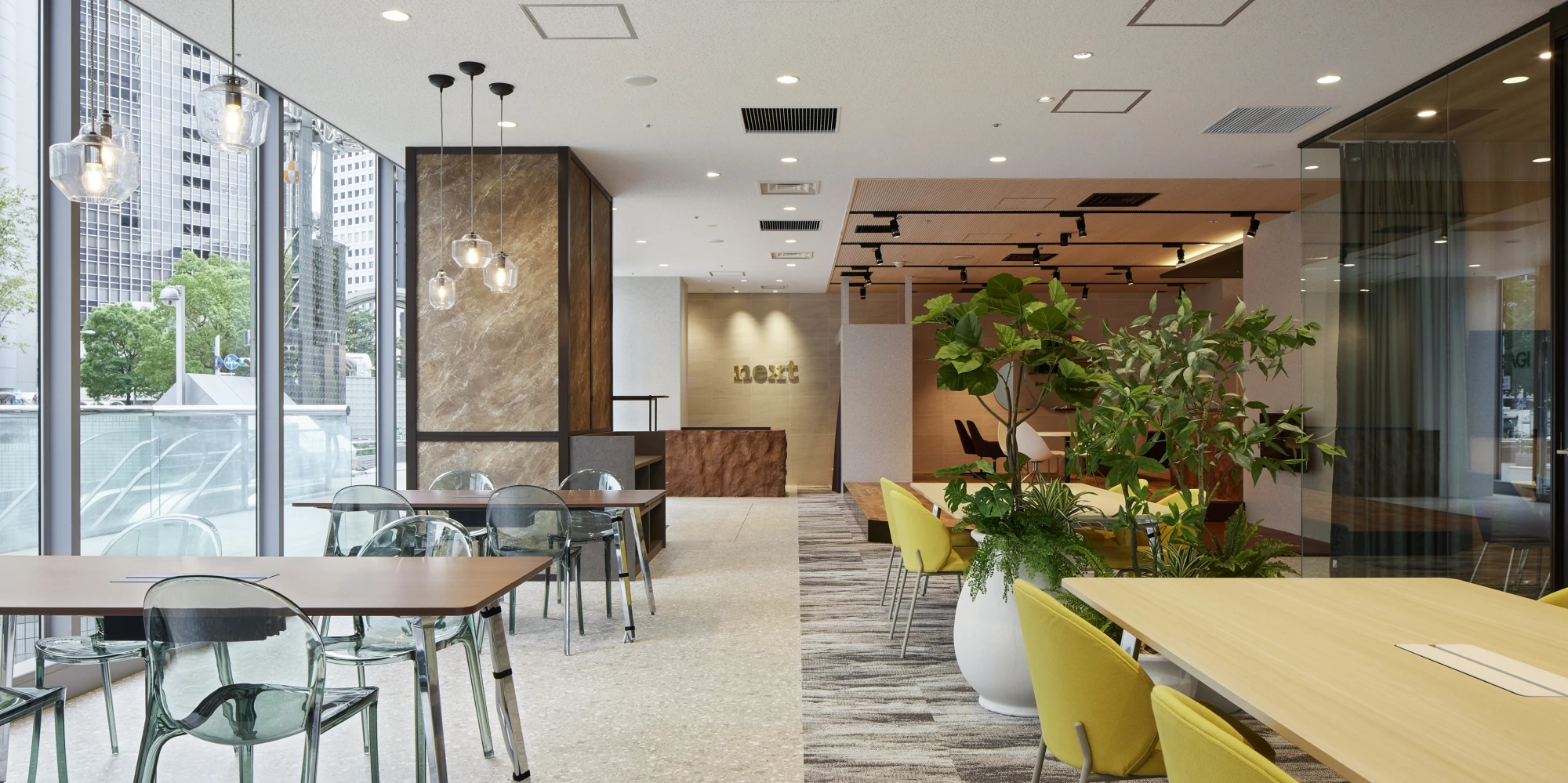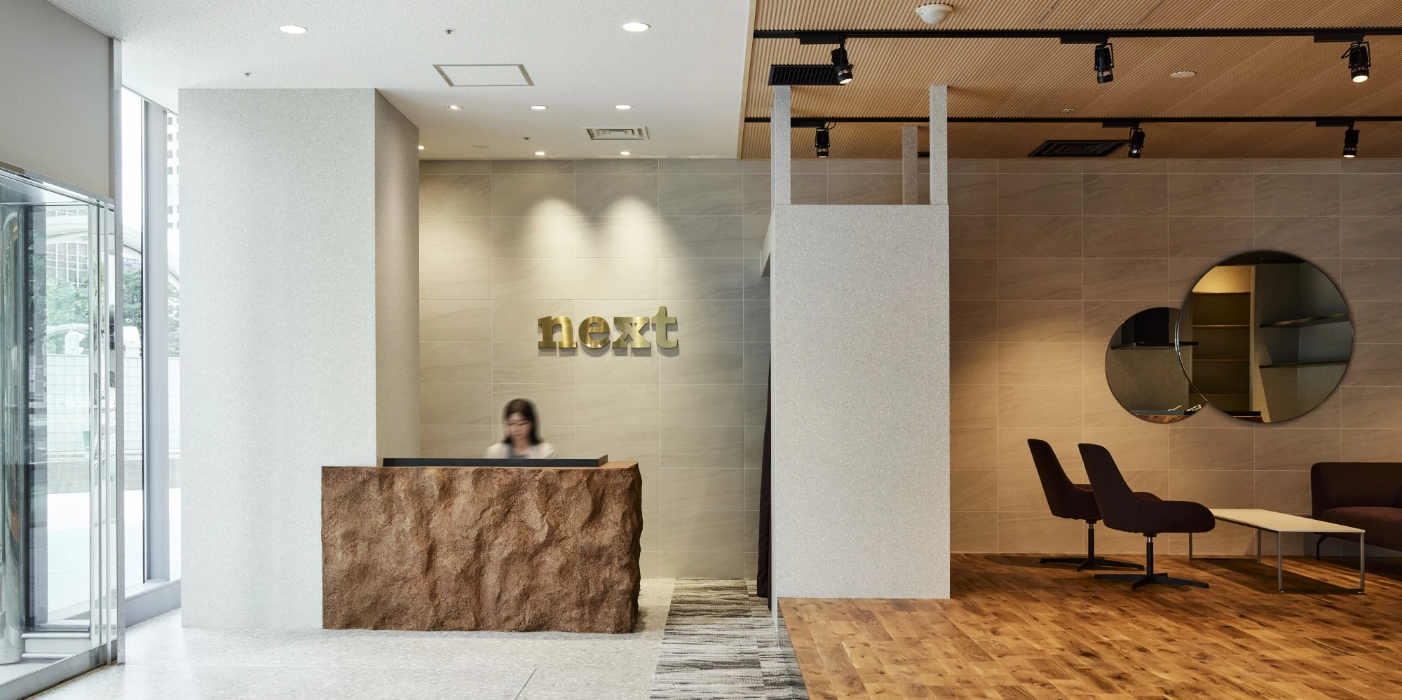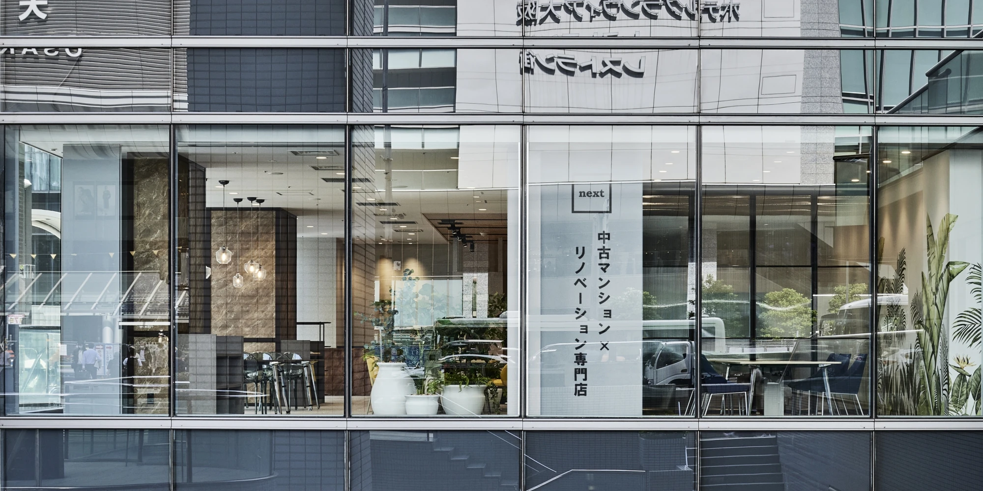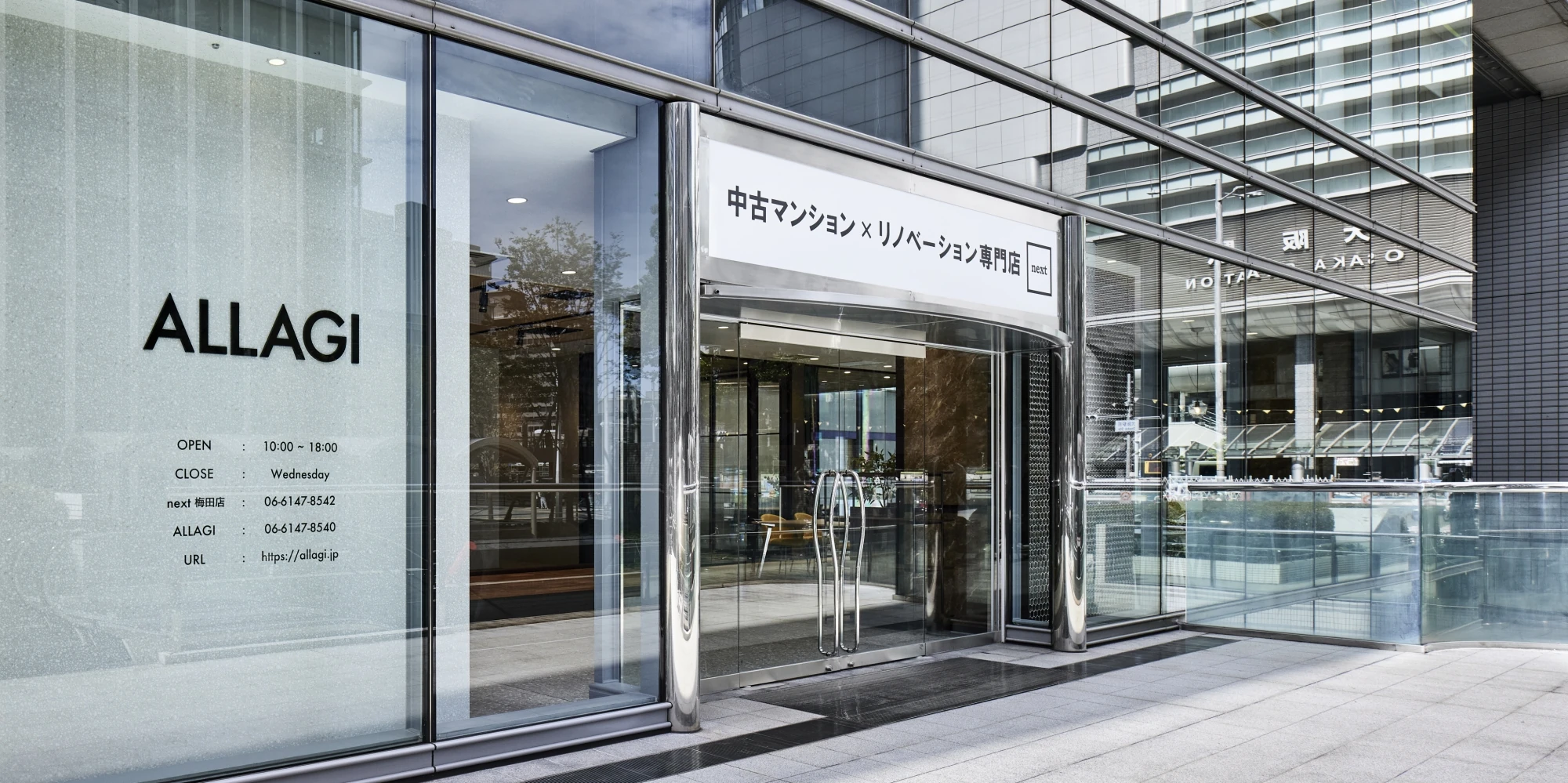 中古マンションや戸建てのリノベーションサービス『next』ショールーム兼ALLAGI本社オフィスのご移転プロジェクト。会社の更なる飛躍も見据えた、大阪府和泉市から大阪市の中心街・JR大阪駅前に位置するビルへのご移転でした。ビルの1階という立地を活かし、通行人の目を引くデザインとなっています。ショールーム自体のデザインも、今までの『next』ショールームにはなかった要素、例えば特殊な造形を使って製作したキッチンカウンターやダイナミックにグリーンが描かれたクロスを取り入れ、洗練されたスタイリッシュさを演出しました。ショールームを訪れるお客様にとって、訪れる度に期待が膨らみ、ワクワクするショールームとなりました。