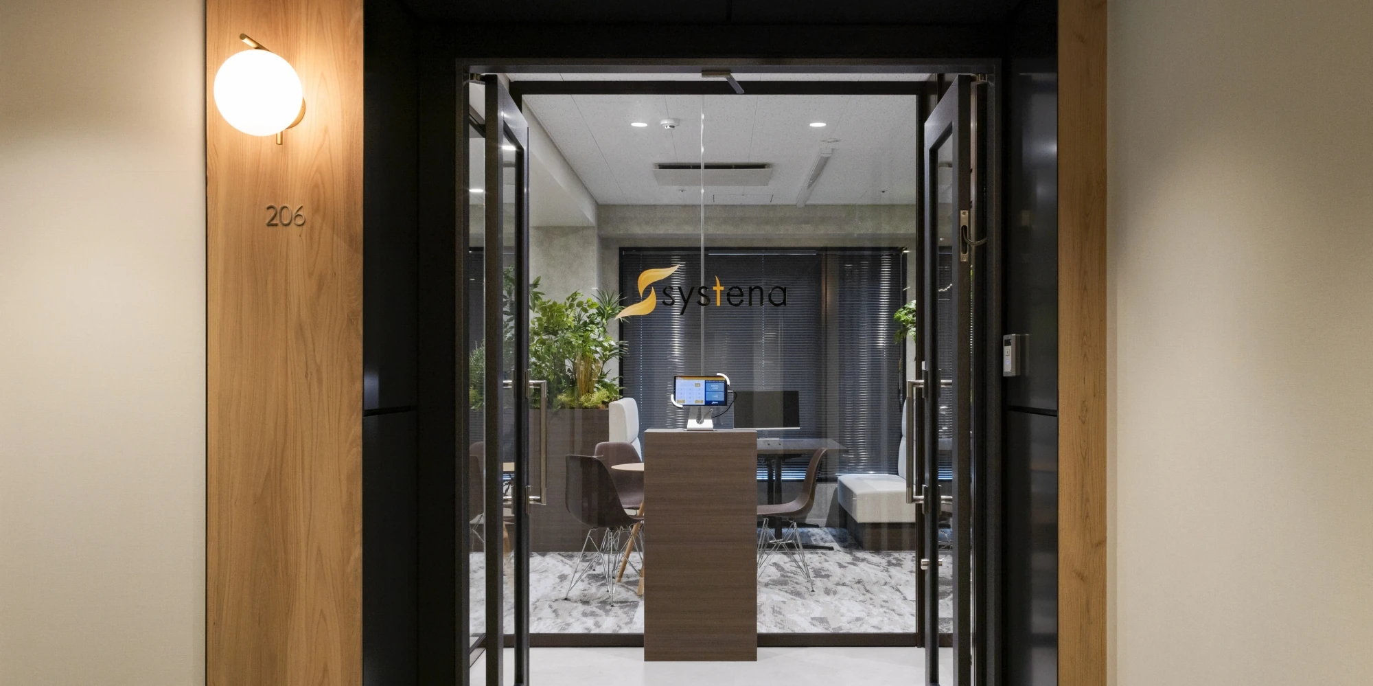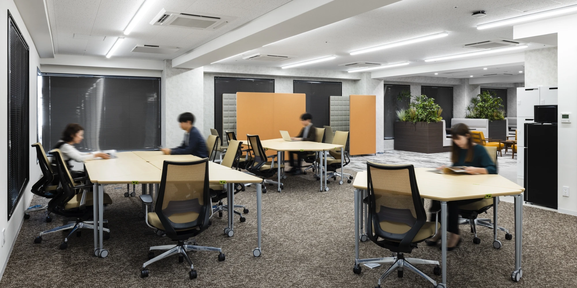 神戸、松山のイノベーションラボに続いて京都イノベーションラボ開設をお手伝いしました。「ハイブリッドワークが普及したシステナ様にとってのニューノーマルな拠点を作る。」という想いのもと、テレワークが可能になった中でも「自宅以上に快適な空間」「多目的・多用途に使える空間」を目指しデザインしました。 エントランスのガラス壁越しにみえるフレキシブルエリアは、木目調ルーバーや石目柄の素材を用いた和風テイストとシステナ様のコーポレートカラーであるオレンジを意識した配色でデザインしています。執務エリアでは、出社率の変化への対応や偶発的なコミュニケーション創出のため、可動型のデスクやチェアを用いたフリーアドレス運用を導入しました。オンライン会議の増加に合わせた個別ブースの設置など、これまでとは違う多様性のあるニューノーマルなオフィスとなりました。