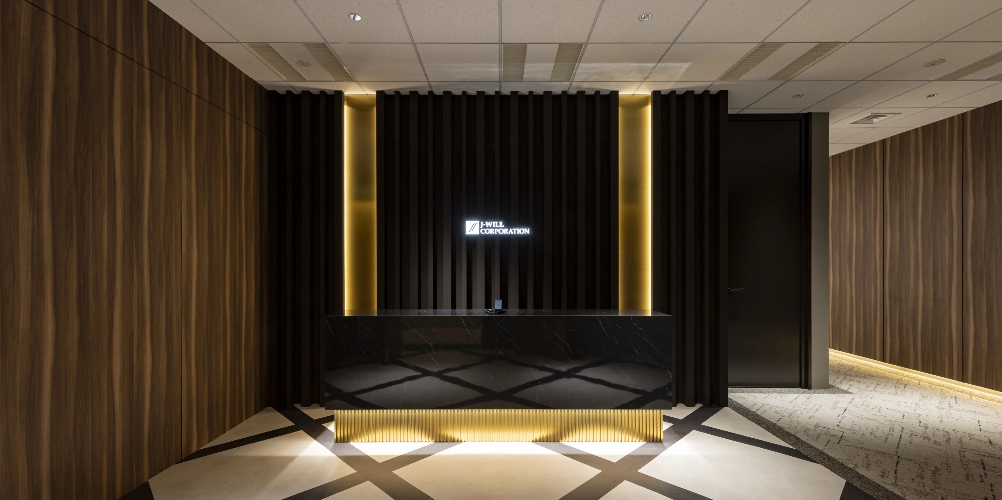 ジェイウィル様にとって初めてのオフィス移転をお手伝いしました。「上質」「洗練」「大人のかっこよさ」のキーワードのもと、家具も含めた内装全体の色味を抑えシックにまとめました。特にエントランスは大理石風の化粧板や発光式のロゴサインを採用し、高級感のある空間でお客様をお出迎えしています。照明演出では、間接照明をメインの光源とすることでホテルライクな上質さを引き出しました。このオフィスから始まる、ジェイウィル様の「新たなステージの幕開け」にふさわしい、洗練されたワークプレイスができあがりました。