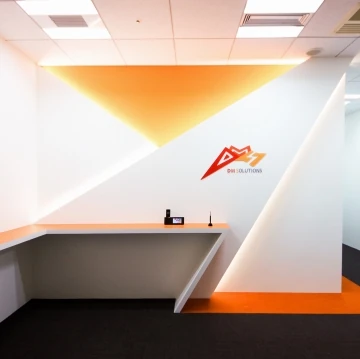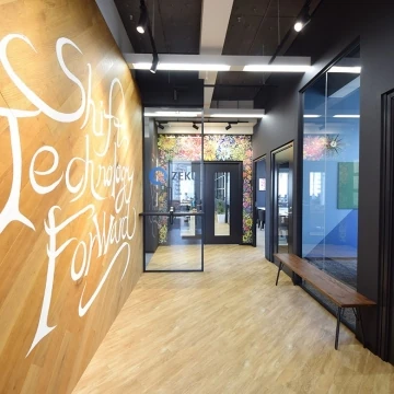 コーポレートカラーを取り入れた幾何学的な模様が会社の思いを表現するオフィス空間