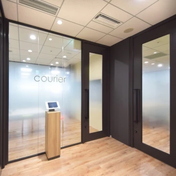 白とガラスで統一された革新性を感じられるオフィスエントランス
