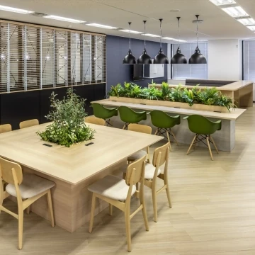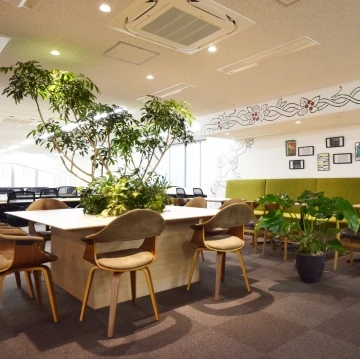 植栽、木目、タイルなど様々な素材が調和し、自然と人々が集まるカフェオフィス