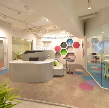 ブルーとホワイトのコンセプトカラーが彩る流れるようなアールデザインオフィス