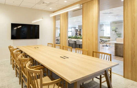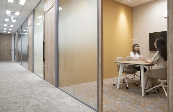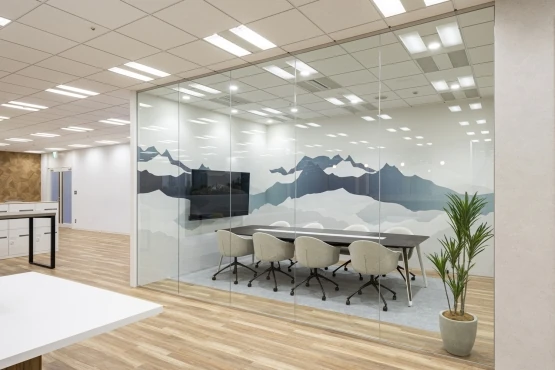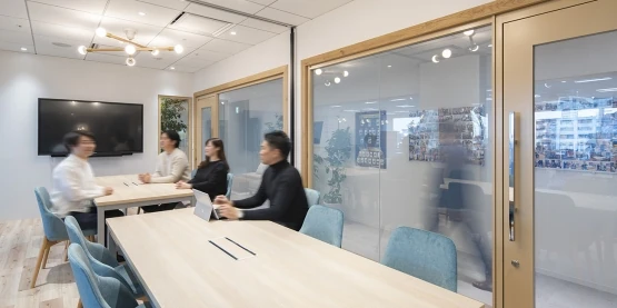 企業成長に柔軟に対応するレイアウト。落ち着きと明るさのあるオフィス空間