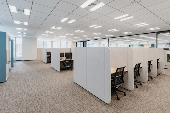 「引く」デザインにより、モノトーンで構成された執務フロア