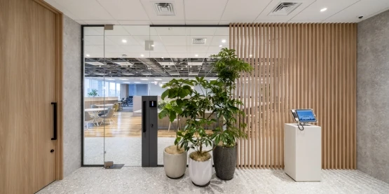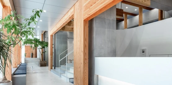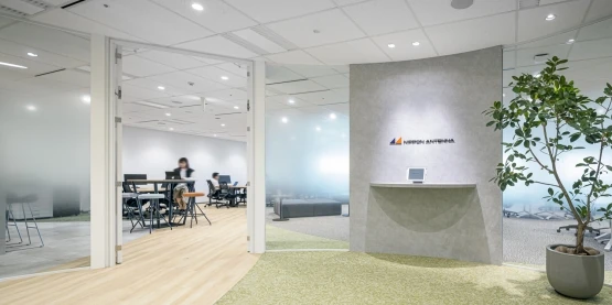 グリーンと木目を使用した落ち着きあるオフィスで多様な働き方を実現