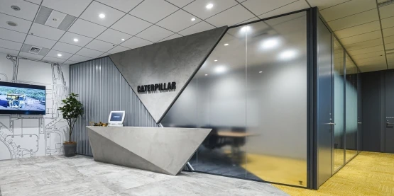 ビルのイメージに合わせたデザイン。シックな雰囲気で信頼感が感じられるオフィス