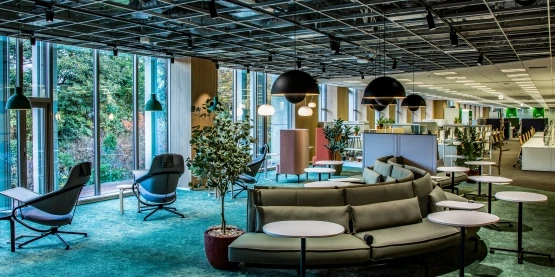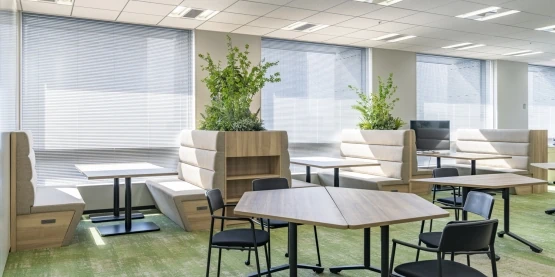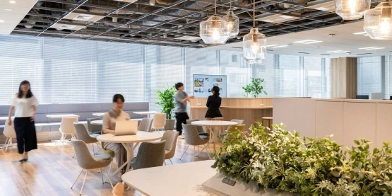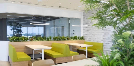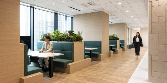 グリーンと木目を使用した落ち着きあるオフィスで多様な働き方を実現