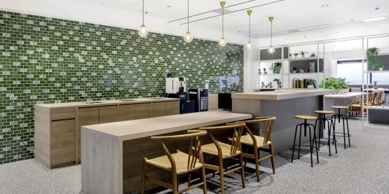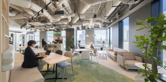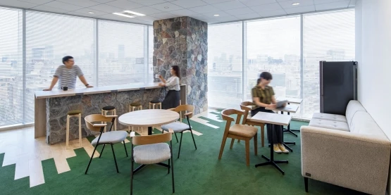 オフィスビル全体で統一感のあるデザイン。多様な働き方ができるセットアップオフィス