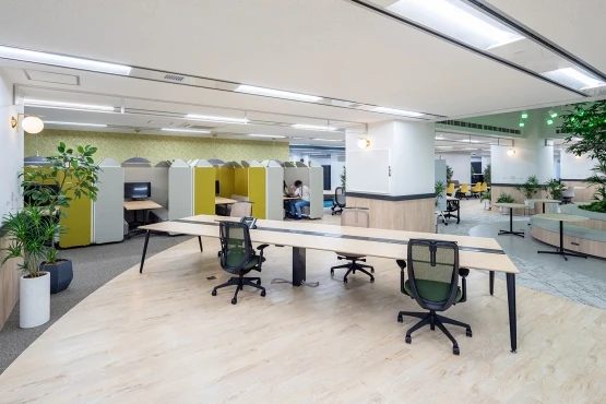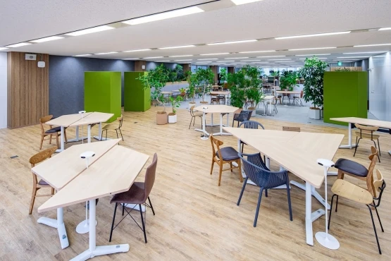 自由に働き方を選択できる木とグリーンを基調としたオフィス