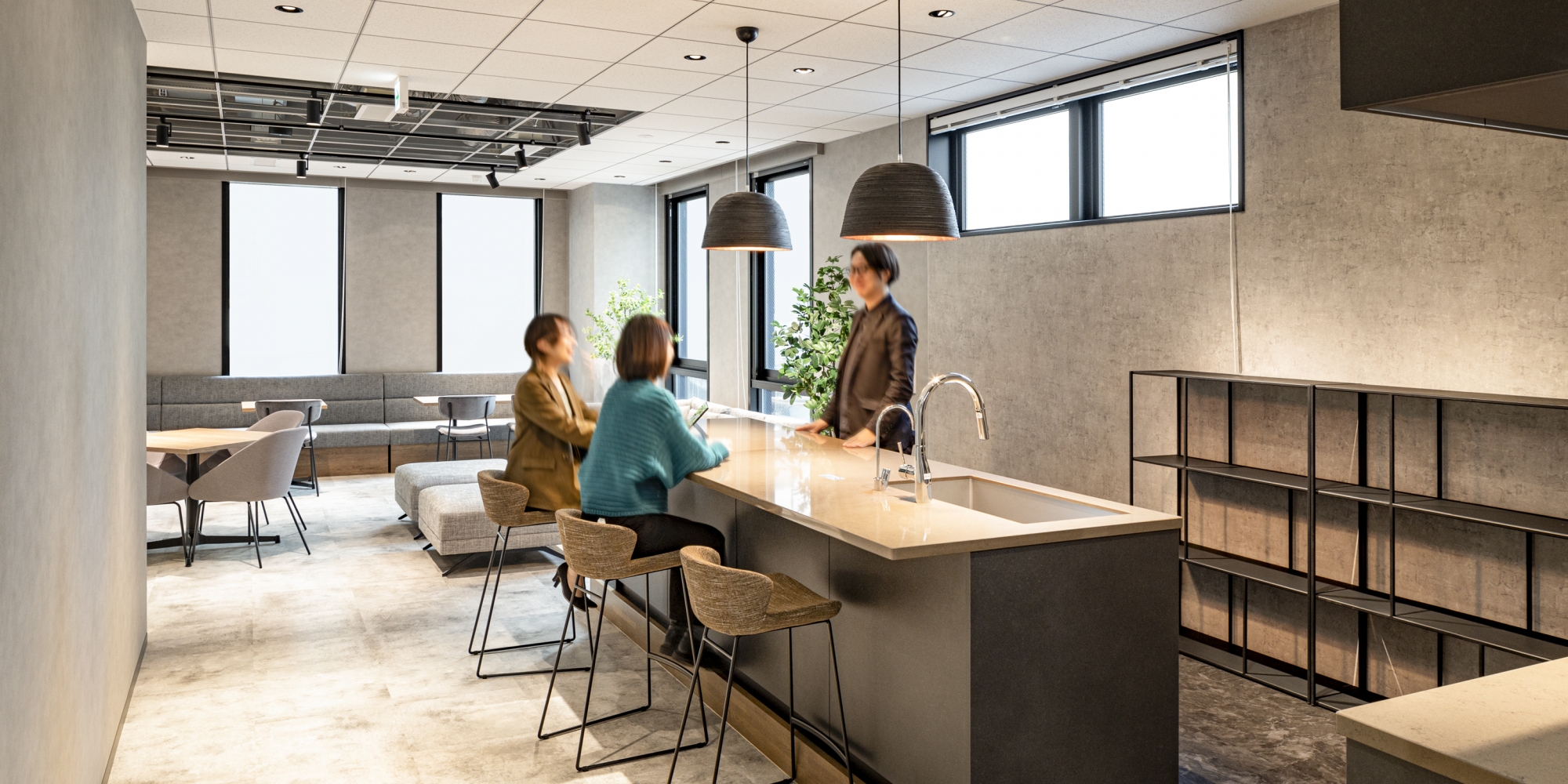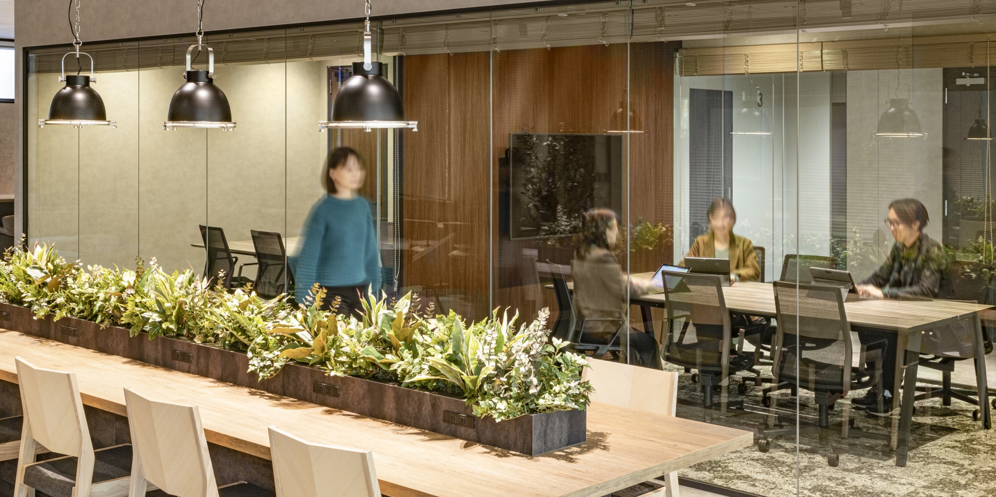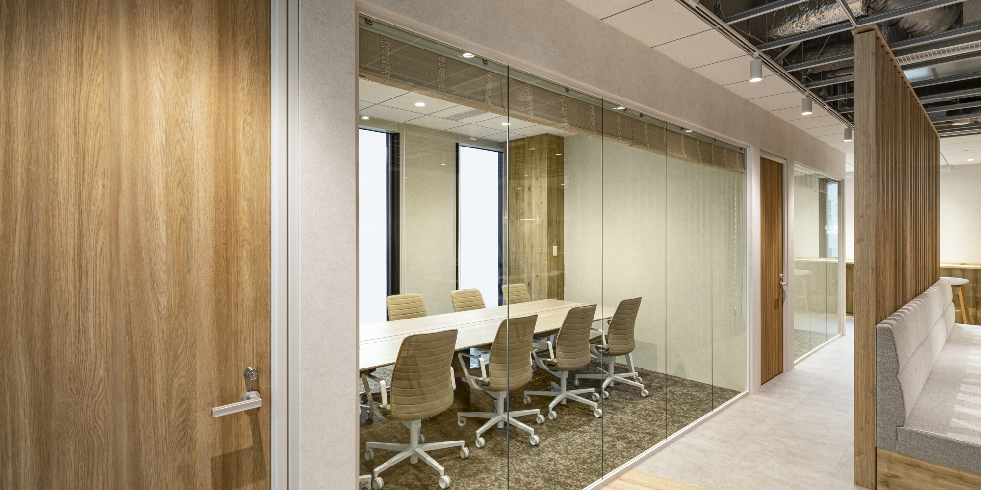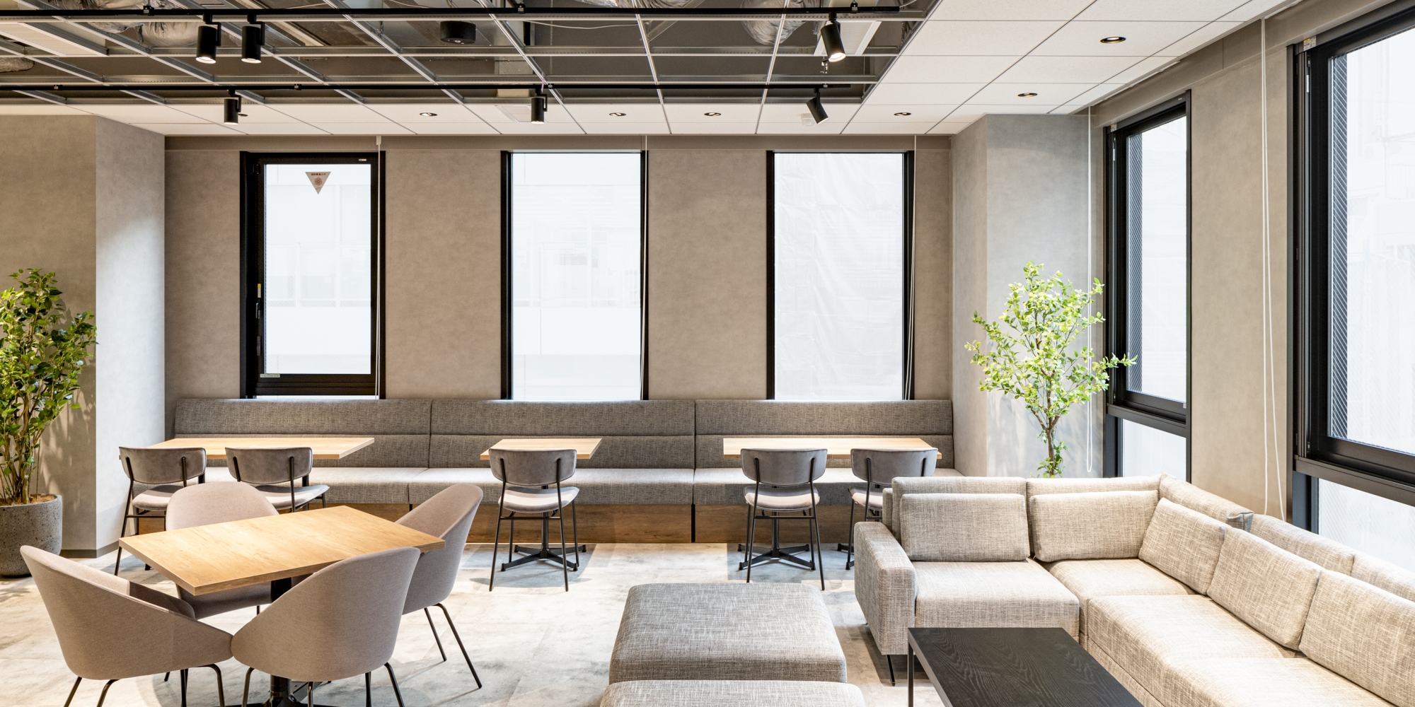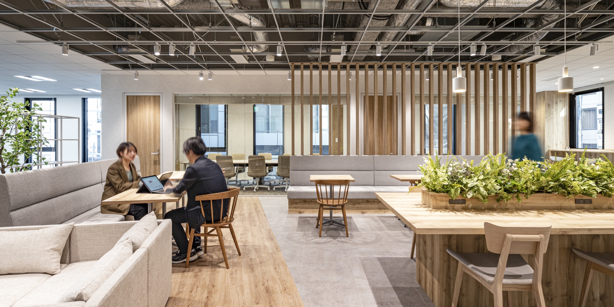 不動産会社様の新築ビルに設けるハーフセットアップオフィスを構築しました。入居コストを抑えられ、レイアウトの自由度も高いハーフセットアップオフィス。オフィスへの新たな入居者をターゲットに、入居エリアのエントランス側半分をデザインしました。今回は「オープン×Natural = GARDEN」「セパレート×Industrial = BASE」という2つのテーマを設けて、2フロアをデザインしました。「GARDEN」は、来社者を自然に誘う斜めの通路に、緩やかに空間を仕切るルーバーが特徴。「BASE」は来社動線を短く設計し、会議室奥に社内コミュニケーションスペースを広げました。どちらも特徴のある空間です。