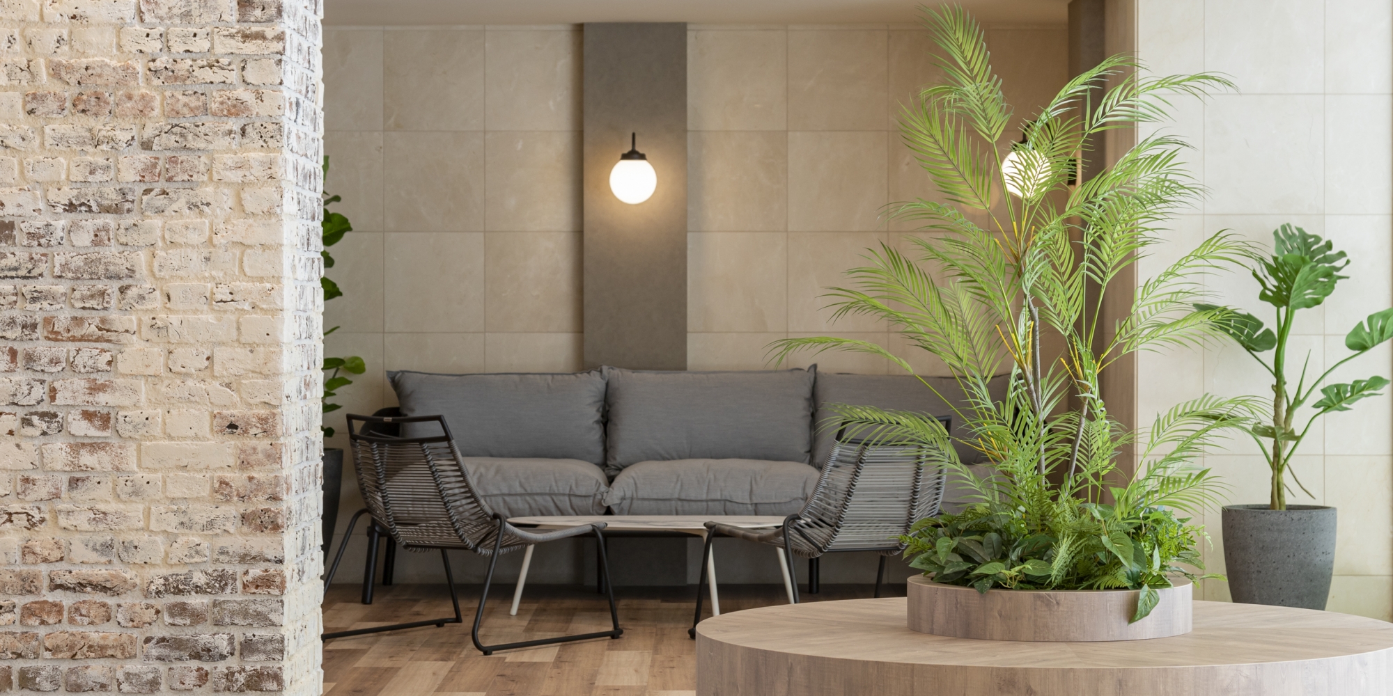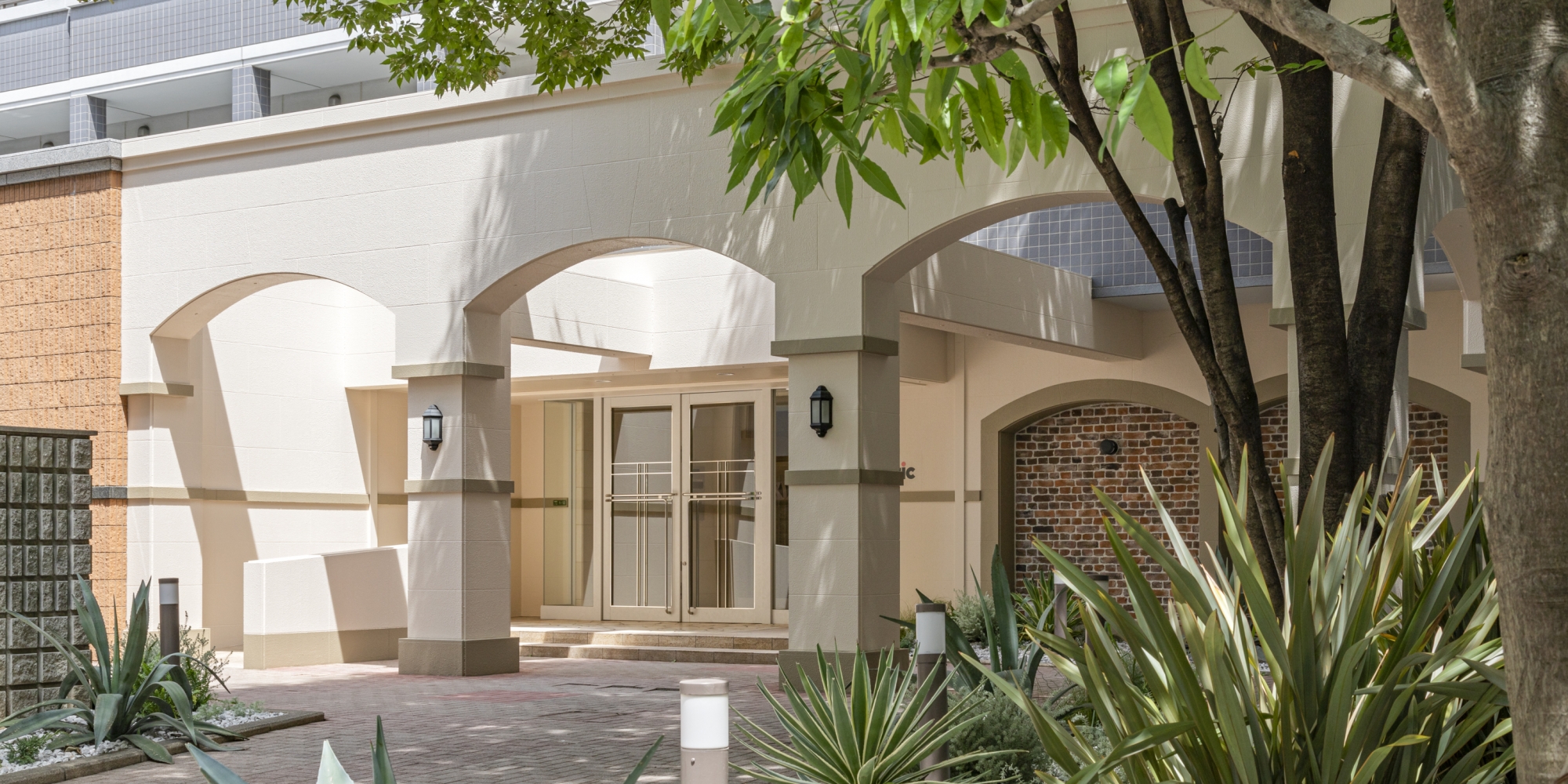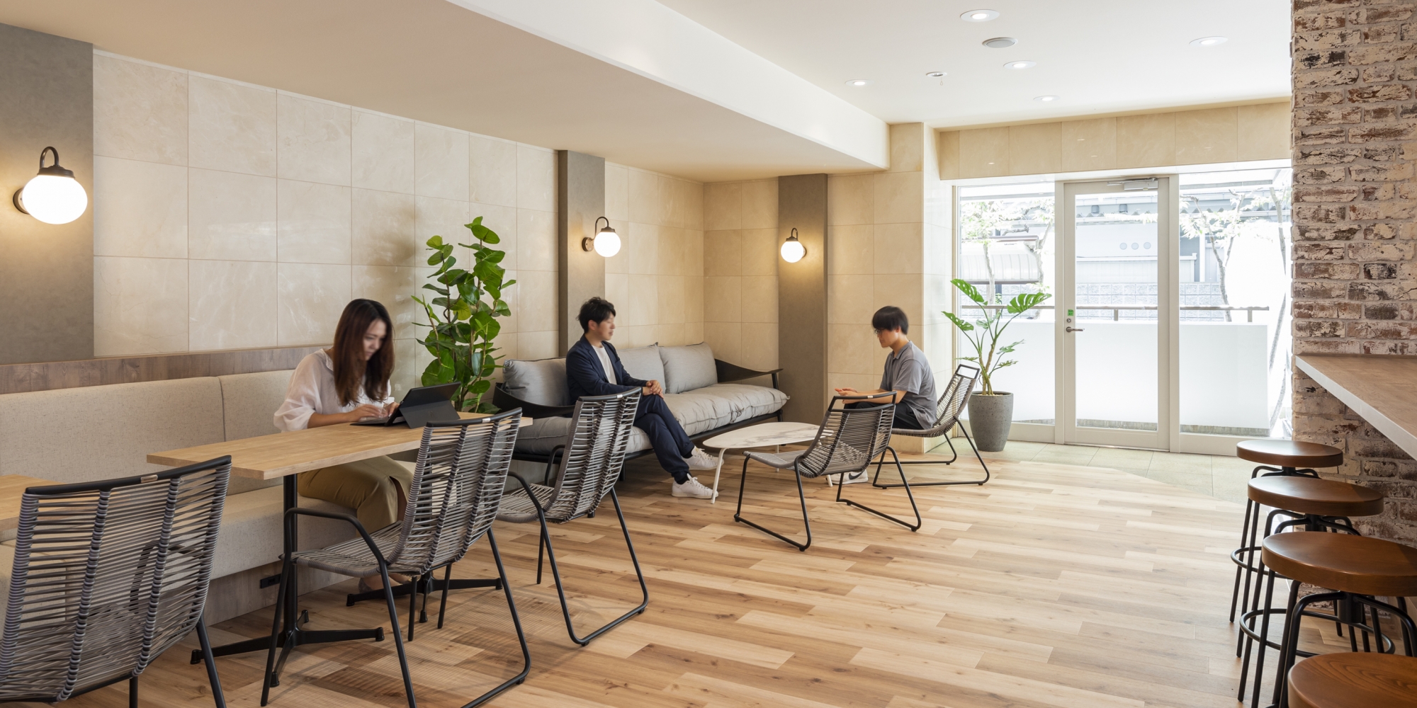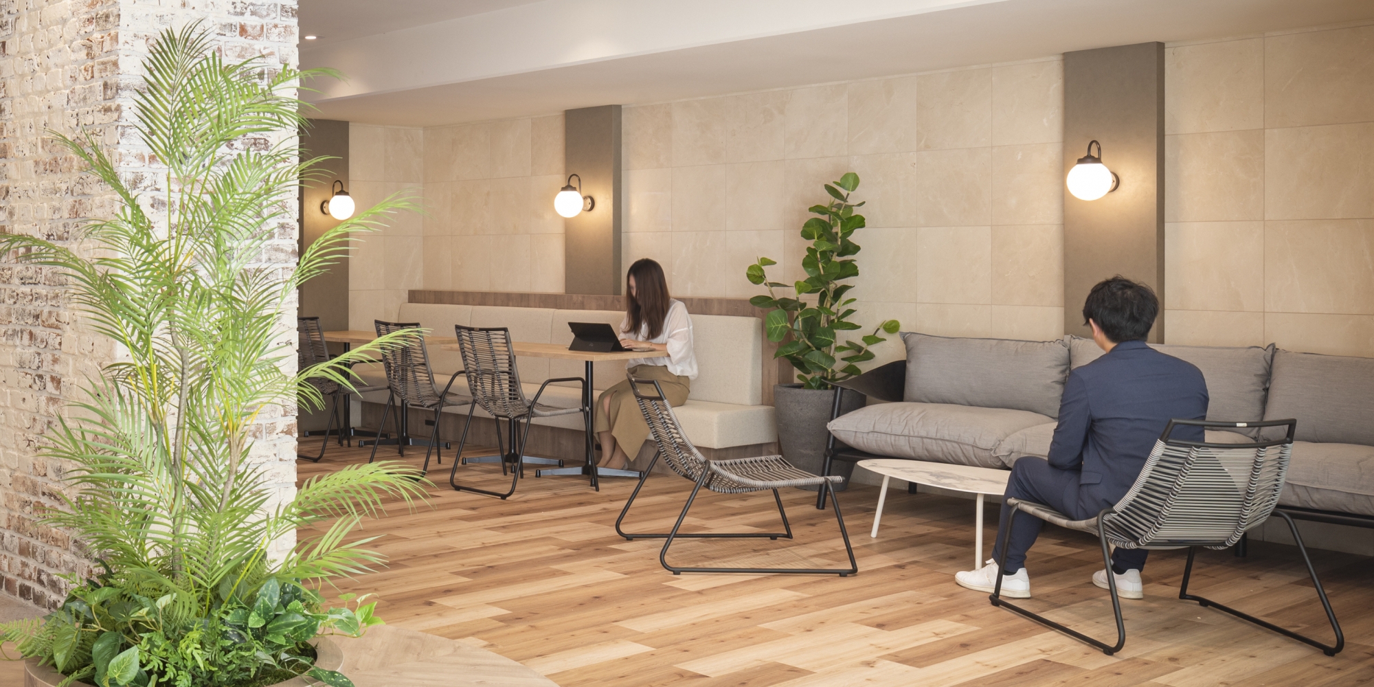 マンションの外壁・1Fエントランスホールのリニューアルプロジェクト。入居希望者に安心と心地良さを感じていただくため、グレーで無機質な外観にグリーンやレンガ調のタイルを使用し、明るさを感じられるデザインに仕上げました。外観は高級感ある南仏風のデザインでつくり、マンションまでのアプローチには元々あるグリーンを残しながら空間に合う植栽を新たに植え、青々としたグリーンロードをつくりました。エントランスホールにはオープンスペースをつくり、住民の誰もが仕事や勉強で使えるスペースとなりました。共有部の多目的エリアの家具は室外でも使用できるものを設置し、複数の方が利用しても清潔感を保つことができます。