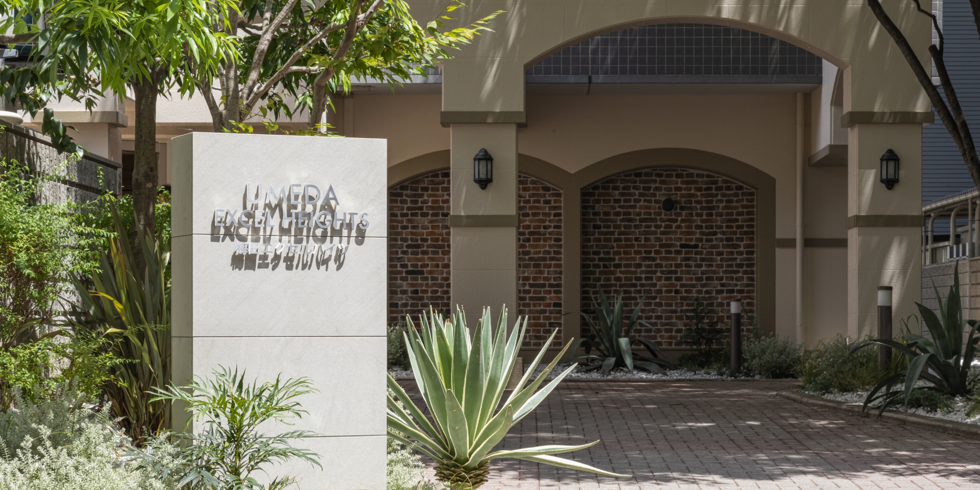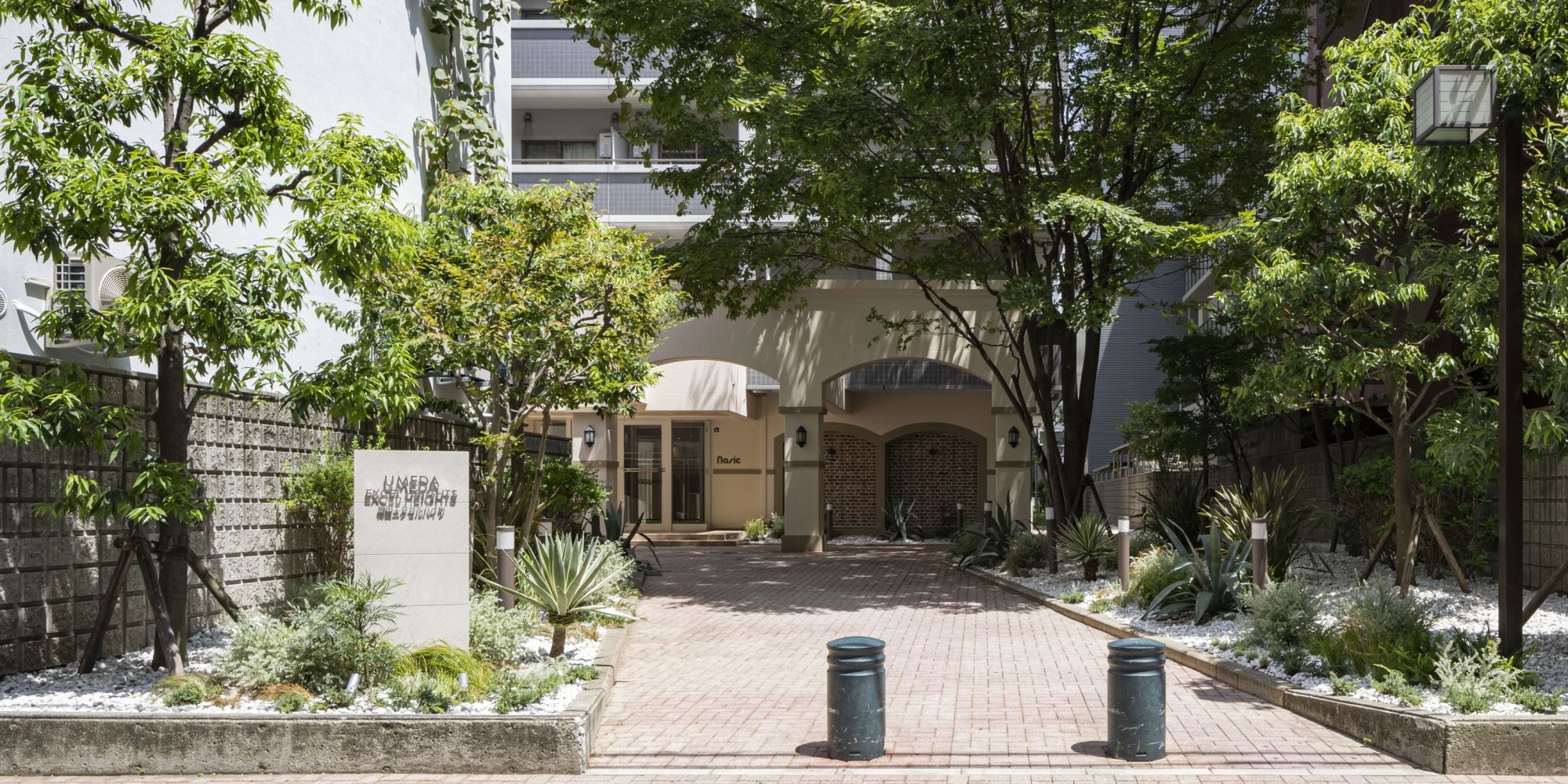 豊富なグリーンとタイルで高級感あふれるマンションの顔